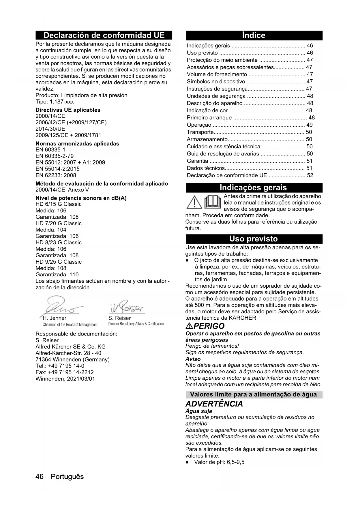 • dB(A) 108 106 108 110 Emisiones de CO2 conforme al procedimiento de medición del Reglamento de la UE 2016/1628 Euro V Motor g/kWh 880,45 880,45 817,85 817,8546 Português Declaración de conformidad UE Por la presente declaramos que la máquina designada a continuación cumple, en lo que respecta a su diseño y tipo constructivo así como a la versión puesta a la venta por nosotros, las normas básicas de seguridad y sobre la salud que figuran en las directivas comunitarias correspondientes. Si se producen modificaciones no acordadas en la máquina, esta declaración pierde su validez. Producto: Limpiadora de alta presión Tipo: 1.187-xxx Directivas UE aplicables 2000/14/CE 2006/42/CE (+2009/127/CE) 2014/30/UE 2009/125/CE + 2009/1781 Normas armonizadas aplicadas EN 60335-1 EN 60335-2-79 EN 55012: 2007 + A1: 2009 EN 55014-2:2015 EN 62233: 2008 Método de evaluación de la conformidad aplicado 2000/14/CE: Anexo V Nivel de potencia sonora en dB(A) HD 6/15 G Classic Medida: 106 Garantizada: 108 HD 7/20 G Classic Medida: 104 Garantizada: 106 HD 8/23 G Classic Medida: 106 Garantizada: 108 HD 9/25 G Classic Medida: 108 Garantizada: 110 Los abajo firmantes actúan en nombre y con la autori- zación de la dirección. Responsable de documentación: S. Reiser Alfred Kärcher SE & Co. KG Alfred-Kärcher-Str. 28 - 40 71364 Winnenden (Germany) Tel.: +49 7195 14-0 Fax: +49 7195 14-2212 Winnenden, 2021/03/01 Índice Indicações gerais Antes da primeira utilização do aparelho leia o manual de instruções original e os avisos de segurança que o acompa- nham. Proceda em conformidade. Conserve as duas folhas para referência ou utilização futura. Uso previsto Use esta lavadora de alta pressão apenas para os se- guintes tipos de trabalho: ● O jacto de alta pressão destina-se exclusivamente à limpeza, por ex., de máquinas, veículos, estrutu- ras, ferramentas, fachadas, terraços e equipamen- tos de jardim. Recomendamos o uso de um soprador de sujidade co- mo um acessório especial para sujidade persistente. O aparelho é adequado para a operação em altitudes até 500 m. Para a operação em altitudes mais eleva- das, o motor deve ser adaptado pelo Serviço de assis- tência técnica da KÄRCHER. PERIGO Operar o aparelho em postos de gasolina ou outras áreas perigosas Perigo de ferimentos! Siga os respetivos regulamentos de segurança. Aviso Não deixe que a água suja contaminada com óleo mi- neral chegue ao solo, à água ou ao sistema de esgotos. Limpe apenas o motor e a parte inferior do motor num local adequado com um recipiente para recolha de óleo. Valores limite para a alimentação de água ADVERTÊNCIA Água suja Desgaste prematuro ou acumulação de resíduos no aparelho Abasteça o aparelho apenas com água limpa ou água reciclada, certificando-se de que os valores limite não são excedidos. Para a alimentação de água aplicam-se os seguintes valores limite: ● Valor de pH: 6,5-9,5 Chairman of the Board of ManagementDirector Regulatory Affairs & Certification H. Jenner S. Reiser Indicações gerais p. 46
