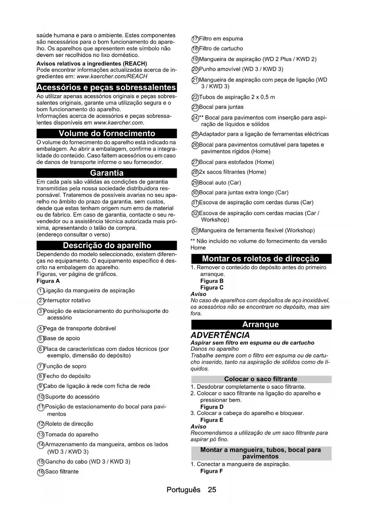 Figura T Ayuda en caso de fallos A menudo, las causas de los fallos son simples y pue- den solucionarse con ayuda del siguiente resumen. En caso de duda o fallos no mencionados aquí, póngase en contacto con el servicio de posventa. Potencia de aspiración decreciente El accesorio, la manguera de aspiración y el tubo de as- piración están obstruidos. Eliminar la obstrucción con un elemento adecuado. La bolsa de filtro está llena. Reemplazar la bolsa de filtro. El filtro para espumosa/filtro de cartucho está sucio. Limpiar el filtro para espumosa/filtro de cartucho (véase el apartado Limpieza del filtro para espumo- sa/filtro de cartucho). El filtro para espumosa/filtro de cartucho tiene daños. Sustituir el filtro para espumosa/filtro de cartucho. Datos técnicos Nota Los datos técnicos se encuentran en la placa de carac- terísticas. Indicações gerais Antes da primeira utilização do aparelho leia o manual de instruções original e os avisos de segurança que o acompa- nham. Proceda em conformidade. Conserve as duas folhas para referência ou utilização futura. Utilização prevista Utilize o aparelho exclusivamente na habitação privada. O aparelho destina-se à utilização como aspirador de lí- quidos e sólidos em conformidade com as descrições e os avisos de segurança contidos neste manual de ins- truções. As cinzas frias só podem ser aspiradas com acessórios adequados. Proteger o aparelho da chuva e não o guardar no exte- rior. Aviso O fabricante não se responsabiliza por eventuais danos resultantes da utilização para fins não previstos ou da operação incorrecta do aparelho. Protecção do meio ambiente Os materiais de empacotamento são recicláveis. Elimine as embalagens de acordo com os regula- mentos ambientais. Os aparelhos eléctricos e electrónicos contêm materiais recicláveis de valor e, com frequência, componentes como baterias, acumuladores ou óleo que, em caso de manipulação ou recolha er- rada, podem representar um potencial perigo para aPortuguês 25 saúde humana e para o ambiente. Estes componentes são necessários para o bom funcionamento do apare- lho. Os aparelhos que apresentem este símbolo não devem ser recolhidos no lixo doméstico. Avisos relativos a ingredientes (REACH) Pode encontrar informações actualizadas acerca de in- gredientes em: www.kaercher.com/REACH Acessórios e peças sobressalentes Ao utilizar apenas acessórios originais e peças sobres- salentes originais, garante uma utilização segura e o bom funcionamento do aparelho. Informações acerca de acessórios e peças sobressa- lentes disponíveis em www.kaercher.com. Volume do fornecimento O volume do fornecimento do aparelho está indicado na embalagem. Ao abrir a embalagem, confirme a integra- lidade do conteúdo. Caso faltem acessórios ou em caso de danos de transporte informe o seu fornecedor. Garantia Em cada país são válidas as condições de garantia transmitidas pela nossa sociedade distribuidora res- ponsável. Trataremos de possíveis avarias no seu apa- relho no âmbito do prazo da garantia, sem custos, desde que estas tenham origem num erro de material ou de fabrico. Em caso de garantia, contacte o seu re- vendedor ou a assistência técnica autorizada mais pró- xima, apresentando o talão de compra. (endereço consultar o verso) Descrição do aparelho Dependendo do modelo seleccionado, existem diferen- ças no equipamento. O equipamento específico é des- crito na embalagem do aparelho. Figuras, ver página de gráficos. Figura A 1 Ligação da mangueira de aspiração 2 Interruptor rotativo 3 Posição de estacionamento do punho/suporte do acessório 4 Pega de transporte dobrável 5 Base de apoio 6 Placa de características com dados técnicos (por exemplo, dimensão do depósito) 7 Função de sopro 8 Fecho do depósito 9 Cabo de ligação à rede com ficha de rede 10 Suporte do acessório 11 Posição de estacionamento do bocal para pavi- mentos 12 Roleto de direcção 13 Tomada do aparelho 14 Armazenamento da mangueira, ambos os lados (WD 3 / KWD 3) 15 Gancho do cabo (WD 3 / KWD 3) 16 Saco filtrante 17 Filtro em espuma 18 Filtro de cartucho 19 Mangueira de aspiração (WD 2 Plus / KWD 2) 20 Punho amovível (WD 3 / KWD 3) 21 Mangueira de aspiração com peça de ligação (WD 3 / KWD 3) 22 Tubos de aspiração 2 x 0,5 m 23 Bocal para juntas 24 ** Bocal para pavimentos com inserção para aspi- ração de líquidos e sólidos 25 Adaptador para a ligação de ferramentas eléctricas 26 Bocal para pavimentos comutável para tapetes e pavimentos rígidos (Home) 27 Bocal para estofados (Home) 28 2x sacos filtrantes (Home) 29 Bocal auto (Car) 30 Bocal para juntas extra longo (Car) 31 Escova de aspiração com cerdas duras (Car) 32 Escova de aspiração com cerdas macias (Car / Workshop) 33 Mangueira de ferramenta flexível (Workshop) ** Não incluído no volume do fornecimento da versão Home Montar os roletos de direcção