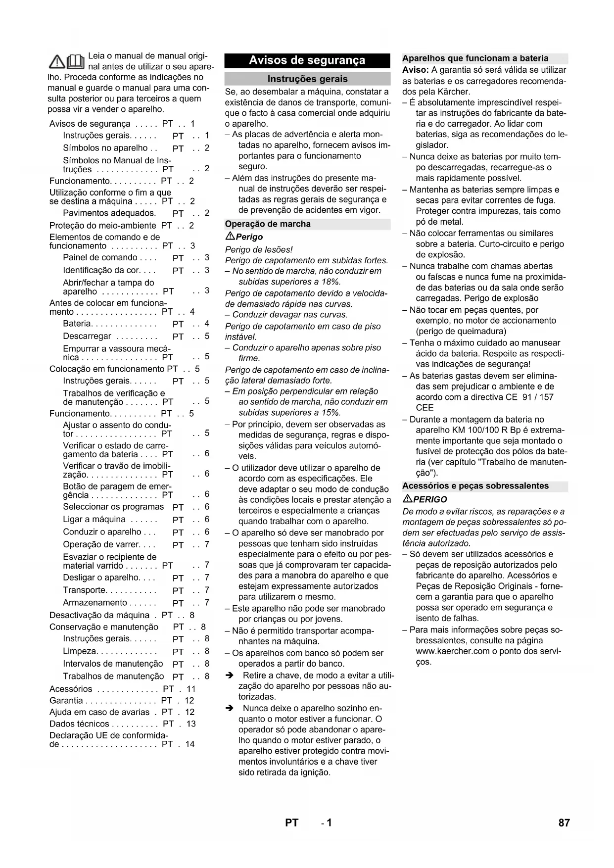 Procedimiento de evaluación de la con- formidad aplicado 2000/14/CE: Anexo V Nivel de potencia acústica dB(A) Medido: 92 Garantizado: 94 Chairman of the Board of Management Director Regulatory Affairs & Certification 86 ES- 1 Leia o manual de manual origi- nal antes de utilizar o seu apare- lho. Proceda conforme as indicações no manual e guarde o manual para uma con- sulta posterior ou para terceiros a quem possa vir a vender o aparelho. Se, ao desembalar a máquina, constatar a existência de danos de transporte, comuni- que o facto à casa comercial onde adquiriu o aparelho. – As placas de advertência e alerta mon- tadas no aparelho, fornecem avisos im- portantes para o funcionamento seguro. – Além das instruções do presente ma- nual de instruções deverão ser respei- tadas as regras gerais de segurança e de prevenção de acidentes em vigor. Perigo Perigo de lesões! Perigo de capotamento em subidas fortes. – No sentido de marcha, não conduzir em subidas superiores a 18%. Perigo de capotamento devido a velocida- de demasiado rápida nas curvas. – Conduzir devagar nas curvas. Perigo de capotamento em caso de piso instável. – Conduzir o aparelho apenas sobre piso firme. Perigo de capotamento em caso de inclina- ção lateral demasiado forte. – Em posição perpendicular em relação ao sentido de marcha, não conduzir em subidas superiores a 15%. – Por princípio, devem ser observadas as medidas de segurança, regras e dispo- sições válidas para veículos automó- veis. – O utilizador deve utilizar o aparelho de acordo com as especificações. Ele deve adaptar o seu modo de condução às condições locais e prestar atenção a terceiros e especialmente a crianças quando trabalhar com o aparelho. – O aparelho só deve ser manobrado por pessoas que tenham sido instruídas especialmente para o efeito ou por pes- soas que já comprovaram ter capacida- des para a manobra do aparelho e que estejam expressamente autorizados para utilizarem o mesmo. – Este aparelho não pode ser manobrado por crianças ou por jovens. – Não é permitido transportar acompa- nhantes na máquina. – Os aparelhos com banco só podem ser operados a partir do banco. Retire a chave, de modo a evitar a utili- zação do aparelho por pessoas não au- torizadas. Nunca deixe o aparelho sozinho en- quanto o motor estiver a funcionar. O operador só pode abandonar o apare- lho quando o motor estiver parado, o aparelho estiver protegido contra movi- mentos involuntários e a chave tiver sido retirada da ignição. Aviso: A garantia só será válida se utilizar as baterias e os carregadores recomenda- dos pela Kärcher. – É absolutamente imprescindível respei- tar as instruções do fabricante da bate- ria e do carregador. Ao lidar com baterias, siga as recomendações do le- gislador. – Nunca deixe as baterias por muito tem- po descarregadas, recarregue-as o mais rapidamente possível. – Mantenha as baterias sempre limpas e secas para evitar correntes de fuga. Proteger contra impurezas, tais como pó de metal. – Não colocar ferramentas ou similares sobre a bateria. Curto-circuito e perigo de explosão. – Nunca trabalhe com chamas abertas ou faíscas e nunca fume na proximida- de das baterias ou da sala onde serão carregadas. Perigo de explosão – Não tocar em peças quentes, por exemplo, no motor de accionamento (perigo de queimadura) – Tenha o máximo cuidado ao manusear ácido da bateria. Respeite as respecti- vas indicações de segurança! – As baterias gastas devem ser elimina- das sem prejudicar o ambiente e de acordo com a directiva CE 91 / 157 CEE – Durante a montagem da bateria no aparelho KM 100/100 R Bp é extrema- mente importante que seja montado o fusível de protecção dos pólos da bate- ria (ver capítulo "Trabalho de manuten- ção"). PERIGO De modo a evitar riscos, as reparações e a montagem de peças sobressalentes só po- dem ser efectuadas pelo serviço de assis- tência autorizado. – Só devem ser utilizados acessórios e peças de reposição autorizados pelo fabricante do aparelho. Acessórios e Peças de Reposição Originais - forne- cem a garantia para que o aparelho possa ser operado em segurança e isento de falhas. – Para mais informações sobre peças so- bressalentes, consulte na página www.kaercher.com o ponto dos servi- ços. Avisos de segurança . . . . . PT . . 1 Instruções gerais. . . . . .