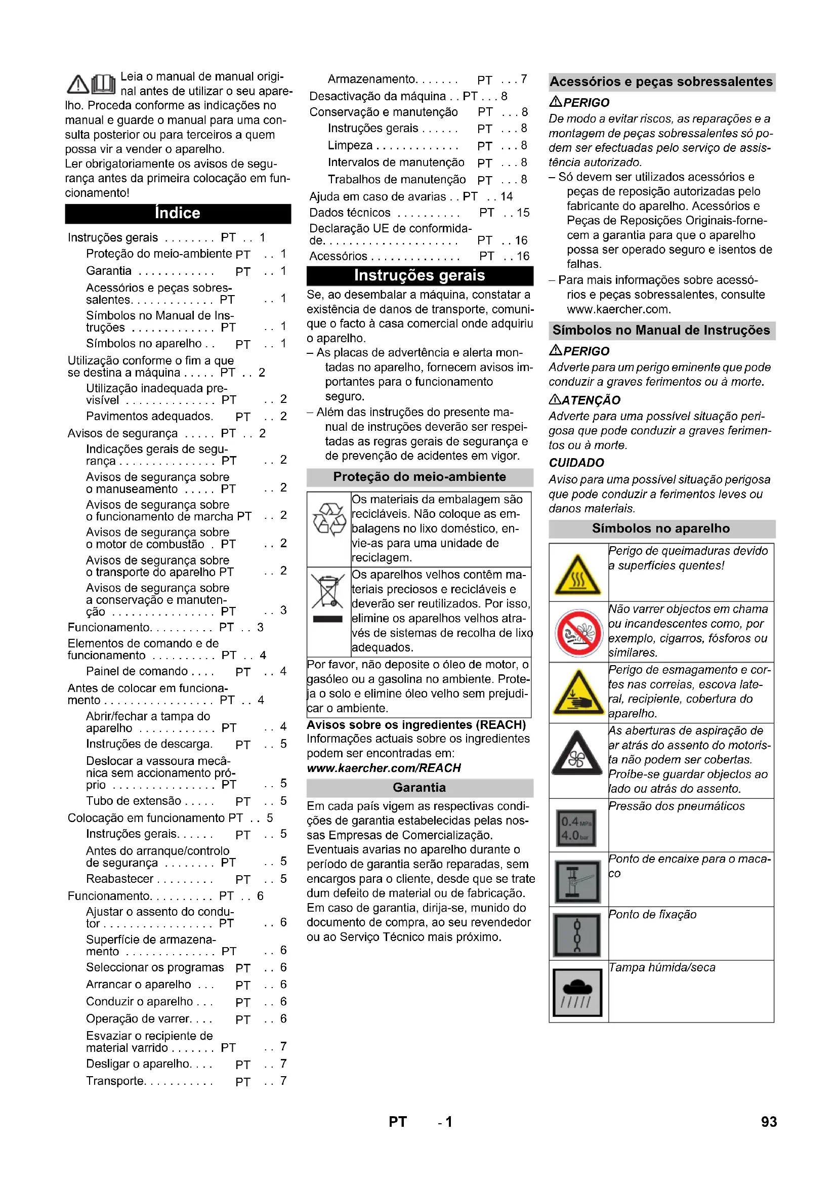 2.644-268.0 Equipo accesorio luz giratoria omnidireccio- nal 2.643-887.0 Set de soporte para es- cobilla Homebase 4.035-523.0 Set de pinza para su- ciedad de partículas gruesas Homebase 4.035-524.0 92 ES- 1 Leia o manual de manual origi- nal antes de utilizar o seu apare- lho. Proceda conforme as indicações no manual e guarde o manual para uma con- sulta posterior ou para terceiros a quem possa vir a vender o aparelho. Ler obrigatoriamente os avisos de segu- rança antes da primeira colocação em fun- cionamento! Se, ao desembalar a máquina, constatar a existência de danos de transporte, comuni- que o facto à casa comercial onde adquiriu o aparelho. – As placas de advertência e alerta mon- tadas no aparelho, fornecem avisos im- portantes para o funcionamento seguro. – Além das instruções do presente ma- nual de instruções deverão ser respei- tadas as regras gerais de segurança e de prevenção de acidentes em vigor. Avisos sobre os ingredientes (REACH) Informações actuais sobre os ingredientes podem ser encontradas em: www.kaercher.com/REACH Em cada país vigem as respectivas condi- ções de garantia estabelecidas pelas nos- sas Empresas de Comercialização. Eventuais avarias no aparelho durante o período de garantia serão reparadas, sem encargos para o cliente, desde que se trate dum defeito de material ou de fabricação. Em caso de garantia, dirija-se, munido do documento de compra, ao seu revendedor ou ao Serviço Técnico mais próximo. PERIGO De modo a evitar riscos, as reparações e a montagem de peças sobressalentes só po- dem ser efectuadas pelo serviço de assis- tência autorizado. – Só devem ser utilizados acessórios e peças de reposição autorizadas pelo fabricante do aparelho. Acessórios e Peças de Reposições Originais-forne- cem a garantia para que o aparelho possa ser operado seguro e isentos de falhas. – Para mais informações sobre acessó- rios e peças sobressalentes, consulte www.kaercher.com. PERIGO Adverte para um perigo eminente que pode conduzir a graves ferimentos ou à morte. 몇 ATENÇÃO Adverte para uma possível situação peri- gosa que pode conduzir a graves ferimen- tos ou à morte. CUIDADO Aviso para uma possível situação perigosa que pode conduzir a ferimentos leves ou danos materiais. Índice Instruções gerais . . . . . . . . PT . . 1 Proteção do meio-ambiente