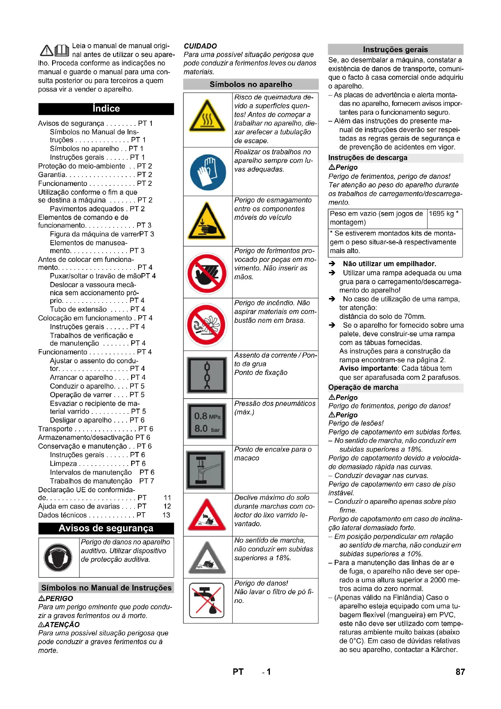 0,1 Medidas y pesos Longitud x anchura x altura mm 2742 x 1904 x 2213 Radio de giro derecho mm 2525 Radio de giro izquierdo mm 2490 Peso en vacío (sin equipos accesorios) kg 1695 Peso total admisible kg 2701 Eje para cargas permitido delantero kg 1703 Eje para cargas permitido trasero kg 998 Contenido del depósito de combustible, diésel l 26 Reservado el derecho a realizar modificaciones técnicas. KM 170/600 R D Classic 86 ES- 1 Leia o manual de manual origi- nal antes de utilizar o seu apare- lho. Proceda conforme as indicações no manual e guarde o manual para uma con- sulta posterior ou para terceiros a quem possa vir a vender o aparelho. PERIGO Para um perigo eminente que pode condu- zir a graves ferimentos ou à morte. 몇 ATENÇÃO Para uma possível situação perigosa que pode conduzir a graves ferimentos ou à morte. CUIDADO Para uma possível situação perigosa que pode conduzir a ferimentos leves ou danos materiais. Se, ao desembalar a máquina, constatar a existência de danos de transporte, comuni- que o facto à casa comercial onde adquiriu o aparelho. – As placas de advertência e alerta monta- das no aparelho, fornecem avisos impor- tantes para o funcionamento seguro. – Além das instruções do presente ma- nual de instruções deverão ser respei- tadas as regras gerais de segurança e de prevenção de acidentes em vigor. Perigo Perigo de ferimentos, perigo de danos! Ter atenção ao peso do aparelho durante os trabalhos de carregamento/descarrega- mento. Não utilizar um empilhador. Utilizar uma rampa adequada ou uma grua para o carregamento/descarrega- mento do aparelho! No caso de utilização de uma rampa, ter atenção: distância do solo de 70mm. Se o aparelho for fornecido sobre uma palete, deve construir-se uma rampa com as tábuas fornecidas. As instruções para a construção da rampa encontram-se na página 2. Aviso importante: Cada tábua tem que ser aparafusada com 2 parafusos. Perigo Perigo de ferimentos, perigo de danos! Perigo Perigo de lesões! Perigo de capotamento em subidas fortes. – No sentido de marcha, não conduzir em subidas superiores a 18%. Perigo de capotamento devido a velocida- de demasiado rápida nas curvas. – Conduzir devagar nas curvas. Perigo de capotamento em caso de piso instável. – Conduzir o aparelho apenas sobre piso firme. Perigo de capotamento em caso de inclina- ção lateral demasiado forte. – Em posição perpendicular em relação ao sentido de marcha, não conduzir em subidas superiores a 10%. – Para a manutenção das linhas de ar e de fuga, o aparelho não deve ser ope- rado a uma altura superior a 2000 me- tros acima do zero normal. – (Apenas válido na Finlândia) Caso o aparelho esteja equipado com uma tu- bagem flexível (mangueira) em PVC, este não deve ser utilizado com tempe- raturas ambiente muito baixas (abaixo de 0°C). Em caso de dúvidas relativas ao seu aparelho, contactar a Kärcher. Índice Avisos de segurança . . . . . . . . PT 1 Símbolos no Manual de Ins- truções . . . . . . . . . . . . . . PT 1 Símbolos no aparelho . . PT 1 Instruções gerais . . . . . . PT 1 Proteção do meio-ambiente . . PT 2 Garantia. . . . . . . . . . . . . . . . . . PT 2 Funcionamento . . . . . . . . . . . . PT 2 Utilização conforme o fim a que se destina a máquina . . . . . . . PT 2 Pavimentos adequados . PT 2 Elementos de comando e de funcionamento. . . . . . . . . . . . . PT 3 Figura da máquina de varrerPT 3 Elementos de manusea- mento. . . . . . . . . . . . . . . PT 3 Antes de colocar em funciona- mento. . . . . . . . . . . . . . . . . . . . PT 4 Puxar/soltar o travão de mãoPT 4 Deslocar a vassoura mecâ- nica sem accionamento pró- prio. . . . . . . . . . . . . . . . . PT 4 Tubo de extensão . . . . . PT 4 Colocação em funcionamento . PT 4 Instruções gerais . . . . . . PT 4 Trabalhos de verificação e de manutenção . . . . . . . PT 4 Funcionamento . . . . . . . . . . . . PT 4 Ajustar o assento do condu- tor. . . . . . . . . . . . . . . . . . PT 4 Arrancar o aparelho . . . . PT 4 Conduzir o aparelho. . . . PT 5 Operação de varrer . . . . PT 5 Esvaziar o recipiente de ma- terial varrido . . . . . . . . . . PT 5 Desligar o aparelho . . . . PT 6 Transporte . . . . . . . . . . . . . . . . PT 6 Armazenamento/desactivação PT 6 Conservação e manutenção . . PT 6 Instruções gerais . . . . . . PT 6 Limpeza . . . . . . . . . . . . . PT 6 Intervalos de manutenção PT 6 Trabalhos de manutenção PT 7 Declaração UE de conformida- de. . . . . . . . . . . . . . . . . . . . . . . PT 11 Ajuda em caso de avarias . . . . PT 12 Dados técnicos . . . . . . . . . . . . PT 13 Avisos de segurança Perigo de danos no aparelho auditivo. Utilizar dispositivo de protecção auditiva. Símbolos no Manual de Instruções Símbolos no aparelho Risco de queimadura de- vido a superfícies quen- tes! Antes de começar a trabalhar no aparelho, die- xar arefecer a tubulação de escape. Realizar os trabalhos no aparelho sempre com lu- vas adequadas. Perigo de esmagamento entre os componentes móveis do veículo Perigo de ferimentos pro- vocado por peças em mo- vimento. Não inserir as mãos. Perigo de incêndio. Não aspirar materiais em com- bustão nem em brasa. Assento da corrente / Pon- to da grua Ponto de fixação Pressão dos pneumáticos (máx.) Ponto de encaixe para o macaco Declive máximo do solo durante marchas com co- lector do lixo varrido le- vantado. No sentido de marcha, não conduzir em subidas superiores a 18%. Perigo de danos! Não lavar o filtro de pó fi- no. Instruções gerais Instruções de descarga Peso em vazio (sem jogos de montagem) 1695 kg *