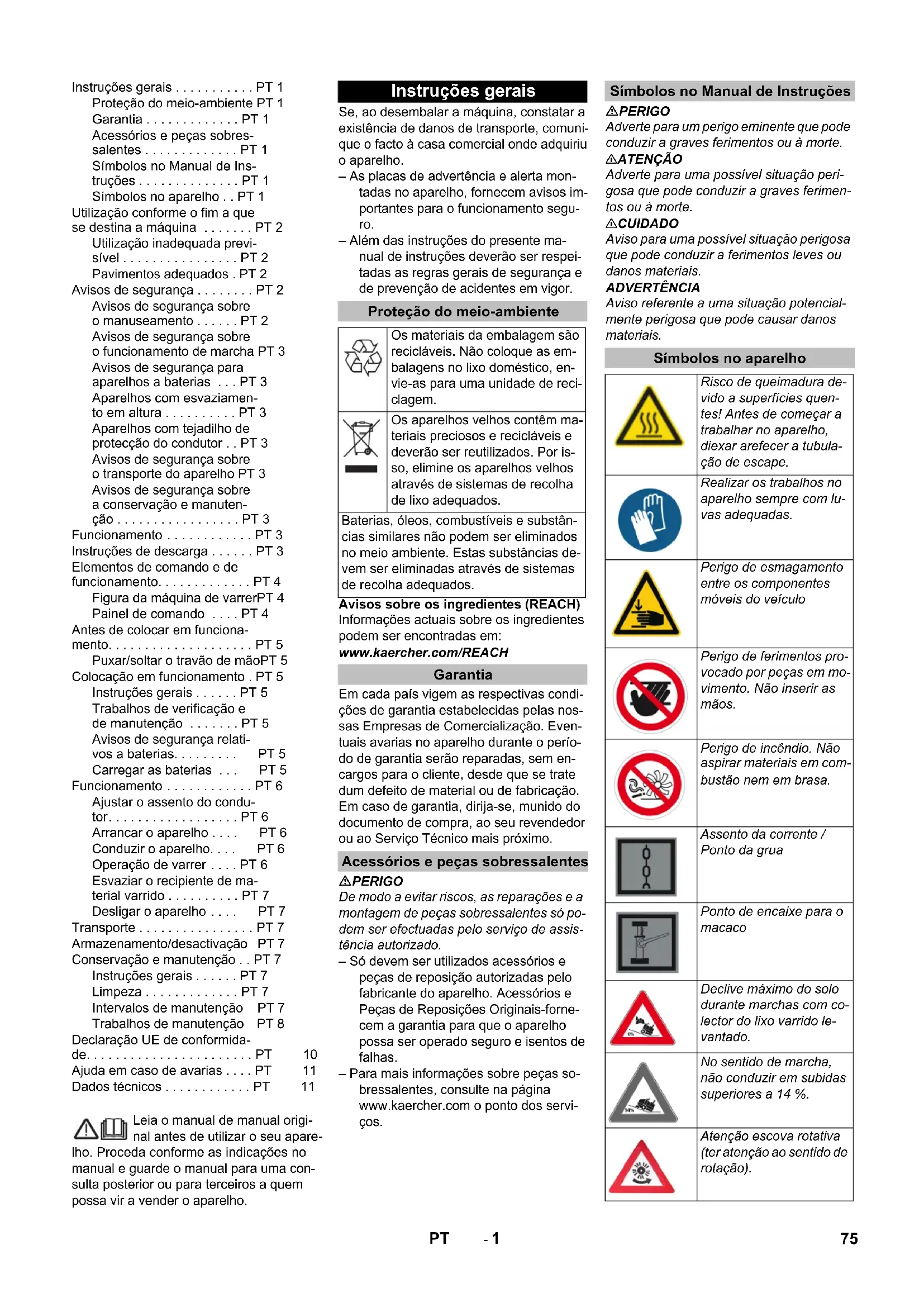 0,1 0,1 Medidas y pesos Longitud x anchura x altura mm 2082x1250x1450 2082x1250x1450 Radio de giro derecho mm 1350 1350 Radio de giro izquierdo mm 1350 1350 Peso en vacío (sin/con baterías) kg 750/1200 750/1200 Peso total admisible kg 1620 1620 Eje para cargas permitido delantero kg 797 797 Eje para cargas permitido trasero kg 823 823 Reservado el derecho a realizar modificaciones técnicas. 74 ES- 1 Leia o manual de manual origi- nal antes de utilizar o seu apare- lho. Proceda conforme as indicações no manual e guarde o manual para uma con- sulta posterior ou para terceiros a quem possa vir a vender o aparelho. Se, ao desembalar a máquina, constatar a existência de danos de transporte, comuni- que o facto à casa comercial onde adquiriu o aparelho. – As placas de advertência e alerta mon- tadas no aparelho, fornecem avisos im- portantes para o funcionamento segu- ro. – Além das instruções do presente ma- nual de instruções deverão ser respei- tadas as regras gerais de segurança e de prevenção de acidentes em vigor. Avisos sobre os ingredientes (REACH) Informações actuais sobre os ingredientes podem ser encontradas em: www.kaercher.com/REACH Em cada país vigem as respectivas condi- ções de garantia estabelecidas pelas nos- sas Empresas de Comercialização. Even- tuais avarias no aparelho durante o perío- do de garantia serão reparadas, sem en- cargos para o cliente, desde que se trate dum defeito de material ou de fabricação. Em caso de garantia, dirija-se, munido do documento de compra, ao seu revendedor ou ao Serviço Técnico mais próximo. PERIGO De modo a evitar riscos, as reparações e a montagem de peças sobressalentes só po- dem ser efectuadas pelo serviço de assis- tência autorizado. – Só devem ser utilizados acessórios e peças de reposição autorizadas pelo fabricante do aparelho. Acessórios e Peças de Reposições Originais-forne- cem a garantia para que o aparelho possa ser operado seguro e isentos de falhas. – Para mais informações sobre peças so- bressalentes, consulte na página www.kaercher.com o ponto dos servi- ços. PERIGO Adverte para um perigo eminente que pode conduzir a graves ferimentos ou à morte. 몇 ATENÇÃO Adverte para uma possível situação peri- gosa que pode conduzir a graves ferimen- tos ou à morte. 몇 CUIDADO Aviso para uma possível situação perigosa que pode conduzir a ferimentos leves ou danos materiais. ADVERTÊNCIA Aviso referente a uma situação potencial- mente perigosa que pode causar danos materiais. Instruções gerais . . . . . . . . . . . PT 1 Proteção do meio-ambiente PT 1 Garantia . . . . . . . . . . . . . PT 1 Acessórios e peças sobres- salentes . . . . . . . . . . . . . PT 1 Símbolos no Manual de Ins- truções . . . . . . . . . . . . . . PT 1 Símbolos no aparelho . . PT 1 Utilização conforme o fim a que se destina a máquina . . . . . . . PT 2 Utilização inadequada previ- sível . . . . . . . . . . . . . . . . PT 2 Pavimentos adequados . PT 2 Avisos de segurança . . . . . . . . PT 2 Avisos de segurança sobre o manuseamento . . . . . . PT 2 Avisos de segurança sobre o funcionamento de marcha PT 3 Avisos de segurança para aparelhos a baterias . . . PT 3 Aparelhos com esvaziamen- to em altura . . . . . . . . . . PT 3 Aparelhos com tejadilho de protecção do condutor . . PT 3 Avisos de segurança sobre o transporte do aparelho PT 3 Avisos de segurança sobre a conservação e manuten- ção . . . . . . . . . . . . . . . . . PT 3 Funcionamento . . . . . . . . . . . . PT 3 Instruções de descarga . . . . . . PT 3 Elementos de comando e de funcionamento. . . . . . . . . . . . . PT 4 Figura da máquina de varrerPT 4 Painel de comando . . . . PT 4 Antes de colocar em funciona- mento. . . . . . . . . . . . . . . . . . . . PT 5 Puxar/soltar o travão de mãoPT 5 Colocação em funcionamento . PT 5 Instruções gerais . . . . . . PT 5 Trabalhos de verificação e de manutenção . . . . . . . PT 5 Avisos de segurança relati- vos a baterias. . . . . . . . . PT 5 Carregar as baterias . . . PT 5 Funcionamento . . . . . . . . . . . . PT 6 Ajustar o assento do condu- tor. . . . . . . . . . . . . . . . . . PT 6 Arrancar o aparelho . . . . PT 6 Conduzir o aparelho. . . . PT 6 Operação de varrer . . . . PT 6 Esvaziar o recipiente de ma- terial varrido . . . . . . . . . . PT 7 Desligar o aparelho . . . . PT 7 Transporte . . . . . . . . . . . . . . . . PT 7 Armazenamento/desactivação PT 7 Conservação e manutenção . . PT 7 Instruções gerais . . . . . . PT 7 Limpeza . . . . . . . . . . . . . PT 7 Intervalos de manutenção PT 7 Trabalhos de manutenção PT 8 Declaração UE de conformida- de. . . . . . . . . . . . . . . . . . . . . . . PT 10 Ajuda em caso de avarias . . . . PT 11 Dados técnicos . . . . . . . . . . . . PT 11 Instruções gerais Proteção do meio-ambiente Os materiais da embalagem são recicláveis. Não coloque as em- balagens no lixo doméstico, en- vie-as para uma unidade de reci- clagem. Os aparelhos velhos contêm ma- teriais preciosos e recicláveis e deverão ser reutilizados. Por is- so, elimine os aparelhos velhos através de sistemas de recolha de lixo adequados. Baterias, óleos, combustíveis e substân- cias similares não podem ser eliminados no meio ambiente. Estas substâncias de- vem ser eliminadas através de sistemas de recolha adequados. Garantia Acessórios e peças sobressalentes Símbolos no Manual de Instruções Símbolos no aparelho Risco de queimadura de- vido a superfícies quen- tes! Antes de começar a trabalhar no aparelho, diexar arefecer a tubula- ção de escape. Realizar os trabalhos no aparelho sempre com lu- vas adequadas. Perigo de esmagamento entre os componentes móveis do veículo Perigo de ferimentos pro- vocado por peças em mo- vimento. Não inserir as mãos. Perigo de incêndio. Não aspirar materiais em com- bustão nem em brasa. Assento da corrente / Ponto da grua Ponto de encaixe para o macaco Declive máximo do so