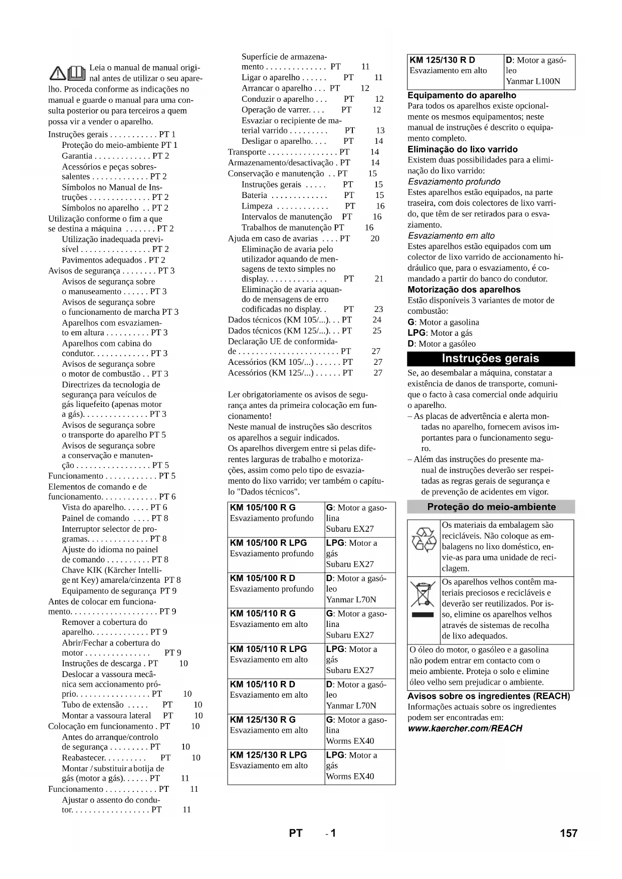 Medido: 98 100 Garantizado: 101 103 Chairman of the Board of Management Director Regulatory Affairs & Certification Accesorios (KM 105/...) Denominación Nº referencia Escobilla lateral, estándar 6.966-063.0 Para la limpieza de superficies interiores y exteriores. Escobilla lateral, dura 6.906-705.0 Para eliminar la suciedad resistente en ex- teriores, resistente a la humedad. Escoba lateral, suave 6.966-065.0 Especial para barrer polvo fino en suelos li- sos. Cepillo rotativo, estándar 4.762-529.0 Resistente al desgaste y la humedad. Cer- das universales para la limpieza interior y exterior. Rodillo rotativo suave 4.762-523.0 Con cerdas naturales especialmente para barrer polvo fino en suelos lisos en interio- res. No es resistente a la humedad, no apto para superficies abrasivos. Rodillo rotativo duro 4.762-524.0 Para eliminar la suciedad resistente en ex- teriores, resistente a la humedad. Filtro plano de papel ple- gado (filtro de polvo) 6.907-352.0 Aparato necesita 2 piezas Accesorios (KM 125/...) Denominación Nº referen- cia Escobilla lateral, estándar 6.966-063.0 Para la limpieza de superficies interiores y exteriores. Escobilla lateral, dura 6.906-705.0 Para eliminar la suciedad resistente en ex- teriores, resistente a la humedad. Escoba lateral, suave 6.966-065.0 Especial para barrer polvo fino en suelos li- sos. Cepillo rotativo, estándar 4.762-525.0 Resistente al desgaste y la humedad. Cer- das universales para la limpieza interior y exterior. Rodillo rotativo suave 4.762-526.0 Con cerdas naturales especialmente para barrer polvo fino en suelos lisos en interio- res. No es resistente a la humedad, no apto para superficies abrasivos. Rodillo rotativo duro 4.762-527.0 Para eliminar la suciedad resistente en ex- teriores, resistente a la humedad. Filtro plano de papel ple- gado (filtro de polvo) 6.907-352.0 Aparato necesita 3 piezas 156 ES- 1 Leia o manual de manual origi- nal antes de utilizar o seu apare- lho. Proceda conforme as indicações no manual e guarde o manual para uma con- sulta posterior ou para terceiros a quem possa vir a vender o aparelho. Ler obrigatoriamente os avisos de segu- rança antes da primeira colocação em fun- cionamento! Neste manual de instruções são descritos os aparelhos a seguir indicados. Os aparelhos divergem entre si pelas dife- rentes larguras de trabalho e motoriza- ções, assim como pelo tipo de esvazia- mento do lixo varrido; ver também o capítu- lo "Dados técnicos". Equipamento do aparelho Para todos os aparelhos existe opcional- mente os mesmos equipamentos; neste manual de instruções é descrito o equipa- mento completo. Eliminação do lixo varrido Existem duas possibilidades para a elimi- nação do lixo varrido: Esvaziamento profundo Estes aparelhos estão equipados, na parte traseira, com dois colectores de lixo varri- do, que têm de ser retirados para o esva- ziamento. Esvaziamento em alto Estes aparelhos estão equipados com um colector de lixo varrido de accionamento hi- dráulico que, para o esvaziamento, é co- mandado a partir do banco do condutor. Motorização dos aparelhos Estão disponíveis 3 variantes de motor de combustão: G: Motor a gasolina LPG: Motor a gás D: Motor a gasóleo Se, ao desembalar a máquina, constatar a existência de danos de transporte, comuni- que o facto à casa comercial onde adquiriu o aparelho. – As placas de advertência e alerta mon- tadas no aparelho, fornecem avisos im- portantes para o funcionamento segu- ro. – Além das instruções do presente ma- nual de instruções deverão ser respei- tadas as regras gerais de segurança e de prevenção de acidentes em vigor. Avisos sobre os ingredientes (REACH) Informações actuais sobre os ingredientes podem ser encontradas em: www.kaercher.com/REACH Instruções gerais . . . . . . . . . . . PT 1 Proteção do meio-ambiente PT 1 Garantia . . . . . . . . . . . . . PT 2 Acessórios e peças sobres- salentes . . . . . . . . . . . . . PT 2 Símbolos no Manual de Ins- truções . . . . . . . . . . . . . . PT 2 Símbolos no aparelho . . PT 2 Utilização conforme o fim a que se destina a máquina . . . . . . . PT 2 Utilização inadequada previ- sível . . . . . . . . . . . . . . . . PT 2 Pavimentos adequados . PT 2 Avisos de segurança . . . . . . . . PT 3 Avisos de segurança sobre o manuseamento . . . . . . PT 3 Avisos de segurança sobre o funcionamento de marcha PT 3 Aparelhos com esvaziamen- to em altura . . . . . . . . . . PT 3 Aparelhos com cabina do condutor. . . . . . . . . . . . . PT 3 Avisos de segurança sobre o motor de combustão . . PT 3 Directrizes da tecnologia de segurança para veículos de gás liquefeito (apenas motor a gás). . . . . . . . . . . . . . . PT 3 Avisos de segurança sobre o transporte do aparelho PT 5 Avisos de segurança sobre a conservação e manuten- ção . . . . . . . . . . . . . . . . . PT 5 Funcionamento . . . . . . . . . . . . PT 5 Elementos de comando e de funcionamento. . . . . . . . . . . . . PT 6 Vista do aparelho. . . . . . PT 6 Painel de comando . . . . PT 8 Interruptor selector de pro- gramas. . . . . . . . . . . . . . PT 8 Ajuste do idioma no painel de comando . . . . . . . . . . PT 8 Chave KIK (Kärcher Intelli-