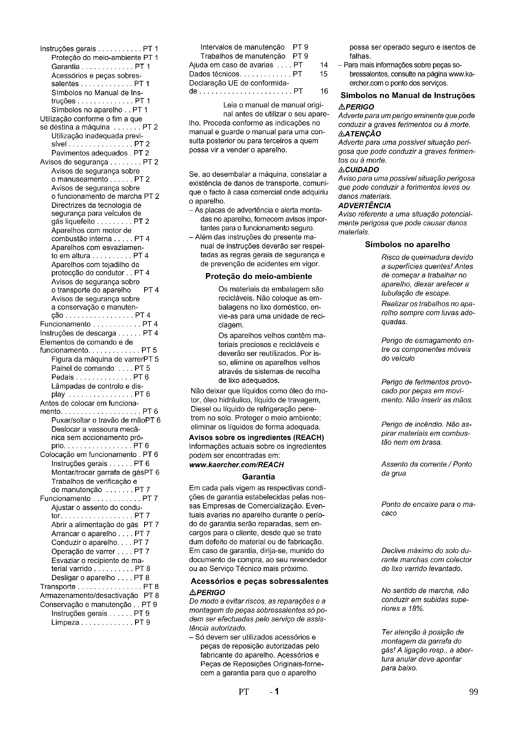 0,1 Medidas y pesos Longitud x anchura x altura mm 2082x1250x1450 Radio de giro derecho mm 1350 Radio de giro izquierdo mm 1350 Peso en vacío kg 851 Peso total admisible kg 1300 Eje para cargas permitido delantero kg 787 Eje para cargas permitido trasero kg 513 Reservado el derecho a realizar modificaciones técnicas. KM 120/250 R LPG Classic Declaración UE de conformidad Producto: Máquina barredora-aspira- dora aparato con asiento Modelo: KM 120/250 R LPG Classic 1.186-001.0 Directivas comunitarias aplicables 2006/42/CE (+2009/127/CE) 2014/30/UE 2000/14/CE Normas armonizadas aplicadas EN 60335–1 EN 60335–2–72 EN 55012: 2007 + A1: 2009 EN 61000–6–2: 2005 EN 62233: 2008 Procedimiento de evaluación de la con- formidad aplicado 2000/14/CE: Anexo V Nivel de potencia acústica dB(A) Medido: 102 Garantizado: 104 Chairman of the Board of Management Director Regulatory Affairs & Certification 98 ES- 1 Leia o manual de manual origi- nal antes de utilizar o seu apare- lho. Proceda conforme as indicações no manual e guarde o manual para uma con- sulta posterior ou para terceiros a quem possa vir a vender o aparelho. Se, ao desembalar a máquina, constatar a existência de danos de transporte, comuni- que o facto à casa comercial onde adquiriu o aparelho. – As placas de advertência e alerta monta- das no aparelho, fornecem avisos impor- tantes para o funcionamento seguro. – Além das instruções do presente ma- nual de instruções deverão ser respei- tadas as regras gerais de segurança e de prevenção de acidentes em vigor. Avisos sobre os ingredientes (REACH) Informações actuais sobre os ingredientes podem ser encontradas em: www.kaercher.com/REACH Em cada país vigem as respectivas condi- ções de garantia estabelecidas pelas nos- sas Empresas de Comercialização. Even- tuais avarias no aparelho durante o perío- do de garantia serão reparadas, sem en- cargos para o cliente, desde que se trate dum defeito de material ou de fabricação. Em caso de garantia, dirija-se, munido do documento de compra, ao seu revendedor ou ao Serviço Técnico mais próximo. PERIGO De modo a evitar riscos, as reparações e a montagem de peças sobressalentes só po- dem ser efectuadas pelo serviço de assis- tência autorizado. – Só devem ser utilizados acessórios e peças de reposição autorizadas pelo fabricante do aparelho. Acessórios e Peças de Reposições Originais-forne- cem a garantia para que o aparelho possa ser operado seguro e isentos de falhas. – Para mais informações sobre peças so- bressalentes, consulte na página www.ka- ercher.com o ponto dos serviços. PERIGO Adverte para um perigo eminente que pode conduzir a graves ferimentos ou à morte. 몇 ATENÇÃO Adverte para uma possível situação peri- gosa que pode conduzir a graves ferimen- tos ou à morte. 몇 CUIDADO Aviso para uma possível situação perigosa que pode conduzir a ferimentos leves ou danos materiais. ADVERTÊNCIA Aviso referente a uma situação potencial- mente perigosa que pode causar danos materiais. Instruções gerais . . . . . . . . . . . PT 1 Proteção do meio-ambiente PT 1 Garantia . . . . . . . . . . . . . PT 1 Acessórios e peças sobres- salentes . . . . . . . . . . . . . PT 1 Símbolos no Manual de Ins- truções . . . . . . . . . . . . . . PT 1 Símbolos no aparelho . . PT 1 Utilização conforme o fim a que se destina a máquina . . . . . . . PT 2 Utilização inadequada previ- sível . . . . . . . . . . . . . . . . PT 2 Pavimentos adequados . PT 2 Avisos de segurança . . . . . . . . PT 2 Avisos de segurança sobre o manuseamento . . . . . . PT 2 Avisos de segurança sobre o funcionamento de marcha PT 2 Directrizes da tecnologia de segurança para veículos de gás liquefeito . . . . . . . . . PT 2 Aparelhos com motor de combustão interna . . . . . PT 4 Aparelhos com esvaziamen- to em altura . . . . . . . . . . PT 4 Aparelhos com tejadilho de protecção do condutor . . PT 4 Avisos de segurança sobre o transporte do aparelho PT 4 Avisos de segurança sobre a conservação e manuten- ção . . . . . . . . . . . . . . . . . PT 4 Funcionamento . . . . . . . . . . . . PT 4 Instruções de descarga . . . . . . PT 4 Elementos de comando e de funcionamento. . . . . . . . . . . . . PT 5 Figura da máquina de varrerPT 5 Painel de comando . . . . PT 5 Pedais . . . . . . . . . . . . . . PT 6 Lâmpadas de controlo e dis- play . . . . . . . . . . . . . . . . PT 6 Antes de colocar em funciona- mento. . . . . . . . . . . . . . . . . . . . PT 6 Puxar/soltar o travão de mãoPT 6 Deslocar a vassoura mecâ- nica sem accionamento pró- prio. . . . . . . . . . . . . . . . . PT 6 Colocação em funcionamento . PT 6 Instruções gerais . . . . . . PT 6 Montar/trocar garrafa de gásPT 6 Trabalhos de verificação e de manutenção . . . . . . . PT 7 Funcionamento . . . . . . . . . . . . PT 7 Ajustar o assento do condu- tor. . . . . . . . . . . . . . . . . . PT 7 Abrir a alimentação de gás PT 7 Arrancar o aparelho . . . . PT 7 Conduzir o aparelho. . . . PT 7 Operação de varrer . . . . PT 7 Esvaziar o recipiente de ma- terial varrido . . . . . . . . . . PT 8 Desligar o aparelho . . . . PT 8 Transporte . . . . . . . . . . . . . . . . PT 8 Armazenamento/desactivação PT 8 Conservação e manutenção . . PT 9 Instruções gerais . . . . . . PT 9 Limpeza . . . . . . . . . . . . . PT 9 Intervalos de manutenção PT 9 Trabalhos de manutenção PT 9 Ajuda em caso de avarias . . . . PT 14 Dados técnicos. . . . . . . . . . . . . PT 15 Declaração UE de conformida- de . . . . . . . . . . . . . . . . . . . . . . . PT 16 Instruções gerais Proteção do meio-ambiente Os materiais da embalagem são recicláveis. Não coloque as em- balagens no lixo doméstico, en- vie-as para uma unidade de reci- clagem. Os aparelhos velhos contêm ma- teriais preciosos e recicláveis e deverão ser reutilizados. Por is- so, elimine os aparelhos velhos através de sistemas de recolha de lixo adequados. Não deixar q