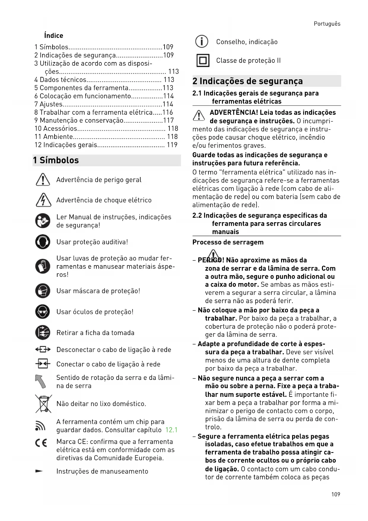 - 12 Indicações gerais 1 Símbolos Advertência de perigo geral Advertência de choque elétrico Ler Manual de instruções, indicações de segurança! Usar proteção auditiva! Usar luvas de proteção ao mudar fer ramentas e manusear materiais áspe ros! Usar máscara de proteção! Usar óculos de proteção! Retirar a ficha da tomada Desconectar o cabo de ligação à rede Conectar o cabo de ligação à rede Sentido de rotação da serra e da lâmi na de serra Não deitar no lixo doméstico. A ferramenta contém um chip para guardar dados. Consultar capítulo 12.1 Marca CE: confirma que a ferramenta elétrica está em conformidade com as diretivas da Comunidade Europeia. Instruções de manuseamento Conselho, indicação Classe de proteção II 2 Indicações de segurança p. 119