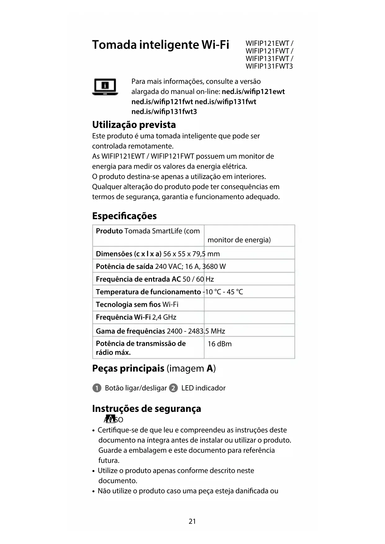 Guia de iniciação rápida21 Tomada inteligente Wi-Fi WIFIP121EWT / WIFIP121FWT / WIFIP131FWT / WIFIP131FWT3 Para mais informações, consulte a versão alargada do manual on-line: ned.is/wip121ewt ned.is/wip121fwt ned.is/wip131fwt ned.is/wip131fwt3 Utilização prevista Este produto é uma tomada inteligente que pode ser controlada remotamente. As WIFIP121EWT / WIFIP121FWT possuem um monitor de energia para medir os valores da energia elétrica. O produto destina-se apenas a utilização em interiores. Qualquer alteração do produto pode ter consequências em termos de segurança, garantia e funcionamento adequado. Especicações Produto Tomada SmartLife (com monitor de energia) Dimensões (c x l x a) 56 x 55 x 79,5 mm Potência de saída 240 VAC; 16 A, 3680 W Frequência de entrada AC 50 / 60 Hz Temperatura de funcionamento -10 °C - 45 °C Tecnologia sem os Wi-Fi Frequência Wi-Fi 2,4 GHz Gama de frequências 2400 - 2483.5 MHz Potência de transmissão de rádio máx. 16 dBm Peças principais (imagem A) 1 Botão ligar/desligar 2 LED indicador Instruções de segurança