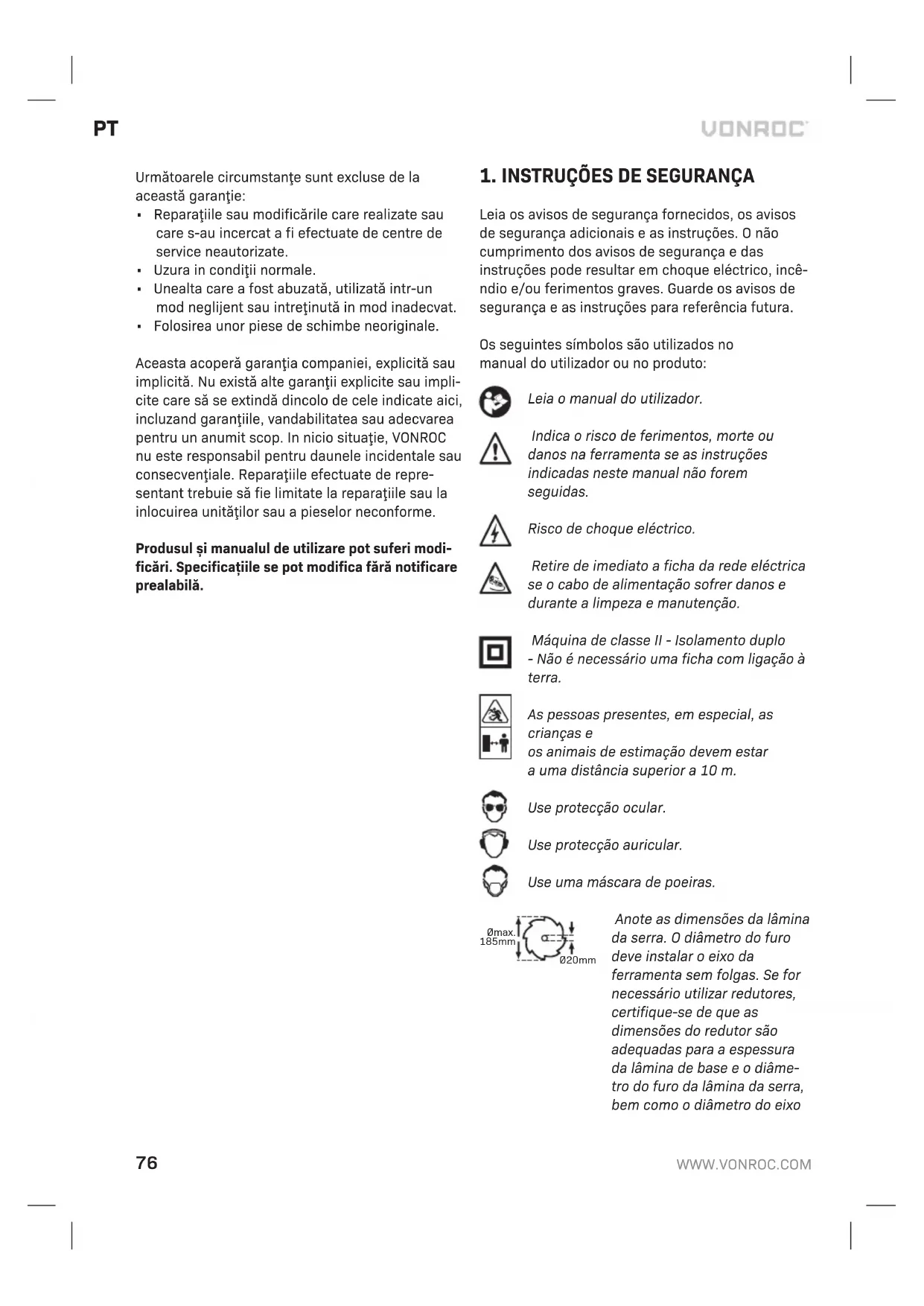 Antes de efectuar alimpeza e amanu- tenção, desligue sempre amáquina e retire aficha de alimentação da rede eléctrica. Limpe acaixa da máquina com regularidade com um pano macio, de preferência após cada utili- zação. Certifique-se de que as aberturas de ven- tilação não têm pó ou sujidade. Retire asujidade muito persistente com um pano macio humedecido com água de sabão. Não utilize solventes, como gasolina, álcool, amoníaco, etc. Este tipo de produ- tos químicos danificam os componentes sintéticos. AMBIENTE Os equipamentos eléctricos ou electrónicos defeituosos e/ou eliminados devem ser recolhidos em locais de reciclagem adequa- dos. Apenas para os países da CE Não elimine as ferramentas eléctricas em conjunto com os resíduos domésticos. De acordo com adirectiva europeia 2012/19/UE sobre resíduos de equipamentos eléctricos e electrónicos e ares- pectiva implementação na legislação nacional, as ferramentas eléctricas que já não sejam utilizadas devem ser recolhidas em separado e eliminadas de maneira ecológica. GARANTIA Os produtos da VONROC são desenvolvidos de acordo com os padrões de qualidade mais eleva- dos e não têm quaisquer defeitos em termos de materiais e mão-de-obra em relação ao período estipulado por lei, cujo início é apartir da data de compra original. Se oequipamento apresentar qualquer falha durante este período devido aqual- quer defeito no material e/ou de mão-de-obra, contacte aVONROC directamente. As seguintes circunstâncias estão excluídas desta garantia: