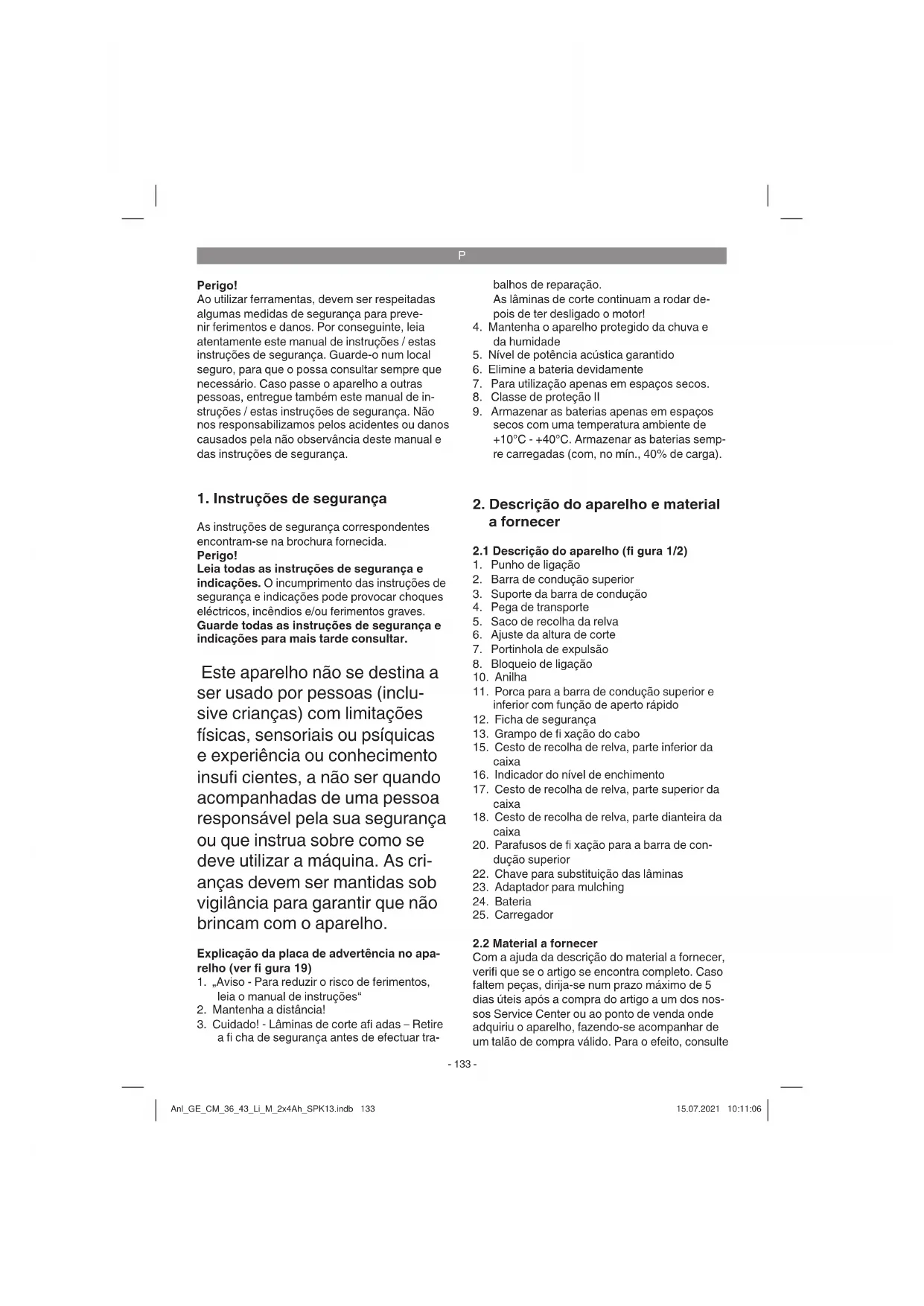 Com a ajuda da descrição do material a fornecer, verifi que se o artigo se encontra completo. Caso faltem peças, dirija-se num prazo máximo de 5 dias úteis após a compra do artigo a um dos nos- sos Service Center ou ao ponto de venda onde adquiriu o aparelho, fazendo-se acompanhar de um talão de compra válido. Para o efeito, consulte Anl_GE_CM_36_43_Li_M_2x4Ah_SPK13.indb 133Anl_GE_CM_36_43_Li_M_2x4Ah_SPK13.indb 133 15.07.2021 10:11:0615.07.2021 10:11:06P