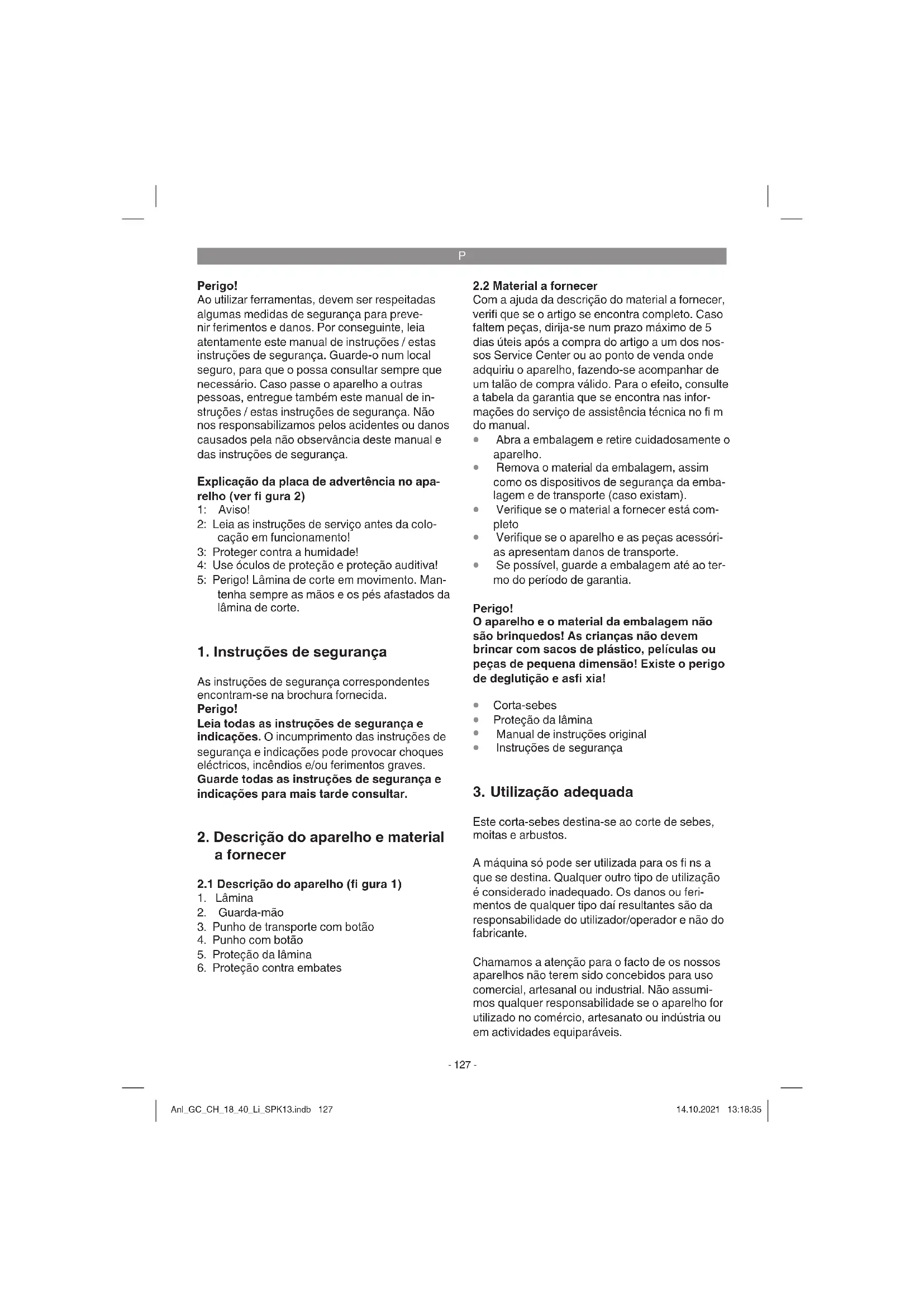 Este corta-sebes destina-se ao corte de sebes, moitas e arbustos. A máquina só pode ser utilizada para os fi ns a que se destina. Qualquer outro tipo de utilização é considerado inadequado. Os danos ou feri- mentos de qualquer tipo daí resultantes são da responsabilidade do utilizador/operador e não do fabricante. Chamamos a atenção para o facto de os nossos aparelhos não terem sido concebidos para uso comercial, artesanal ou industrial. Não assumi- mos qualquer responsabilidade se o aparelho for utilizado no comércio, artesanato ou indústria ou em actividades equiparáveis. Anl_GC_CH_18_40_Li_SPK13.indb 127Anl_GC_CH_18_40_Li_SPK13.indb 127 14.10.2021 13:18:3514.10.2021 13:18:35P