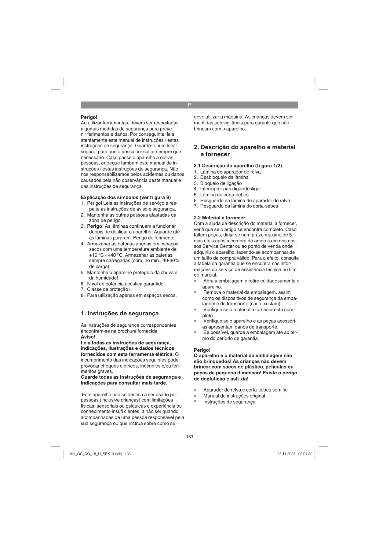 (fi gura 4) Prima o interruptor para obter a indicação da capacidade do acumulador (pos. B). O indicador da capacidade do acumulador (pos. A) assinala o nível de carga da mesma a partir dos 3 LEDs. Acendem-se os 3 LEDs: O acumulador está completamente carregado. Acendem 2 ou 1 LEDs: O acumulador dispõe de carga residual sufi ci- ente. 1 LED a piscar: O acumulador está vazio, carregue-o. Todos os LEDs a piscar: A temperatura da bateria não foi alcançada. Re- mova a bateria do aparelho e deixe-a um dia à temperatura ambiente. Se o erro voltar a ocorrer, a bateria sofreu uma descarga total e tem defeito. Remova a bateria do aparelho. Uma bateria com defeito nunca mais pode voltar a ser usada ou carregada. Aviso! Têm de ser removidos todos os cor- pos estranhos das superfícies a trabalhar. Aviso! Os dispositivos de comutação instalados no aparelho pelo fabricante não podem ser removidos ou ligados em ponte, p. ex. atra- vés da ligação de um botão no punho, caso contrário, existe o perigo de ferimento e de o aparelho não desligar automaticamente. Anl_GC_CG_18_Li_SPK13.indb 135Anl_GC_CG_18_Li_SPK13.indb 135 23.11.2023 09:04:2023.11.2023 09:04:20P
