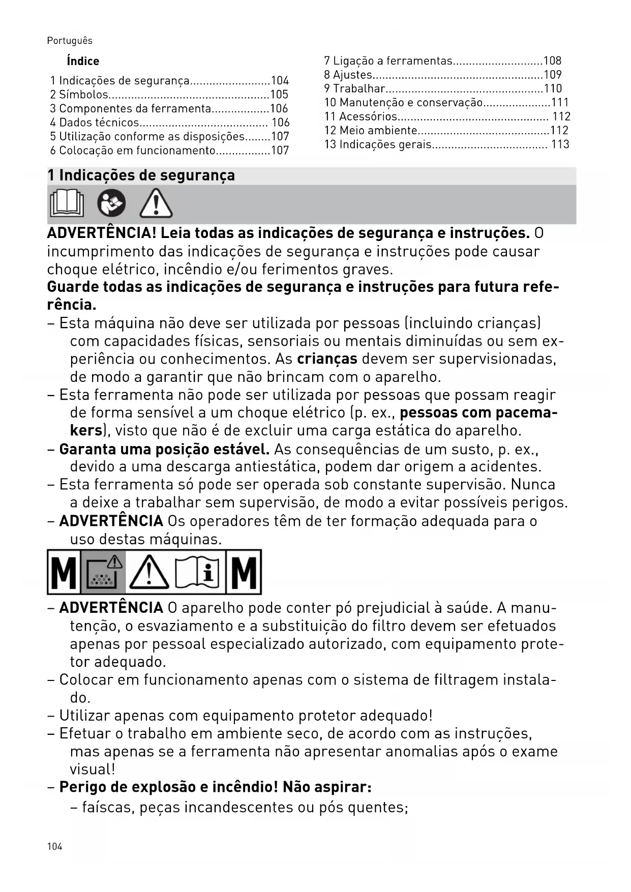 - 13 Indicações gerais 1 Indicações de segurança ADVERTÊNCIA! Leia todas as indicações de segurança e instruções. O incumprimento das indicações de segurança e instruções pode causar choque elétrico, incêndio e/ou ferimentos graves. Guarde todas as indicações de segurança e instruções para futura refe rência. – Esta máquina não deve ser utilizada por pessoas (incluindo crianças) com capacidades físicas, sensoriais ou mentais diminuídas ou sem ex periência ou conhecimentos. As crianças devem ser supervisionadas, de modo a garantir que não brincam com o aparelho. – Esta ferramenta não pode ser utilizada por pessoas que possam reagir de forma sensível a um choque elétrico (p. ex., pessoas com pacema kers), visto que não é de excluir uma carga estática do aparelho. – Garanta uma posição estável. As consequências de um susto, p. ex., devido a uma descarga antiestática, podem dar origem a acidentes. – Esta ferramenta só pode ser operada sob constante supervisão. Nunca a deixe a trabalhar sem supervisão, de modo a evitar possíveis perigos. – ADVERTÊNCIA Os operadores têm de ter formação adequada para o uso destas máquinas. – ADVERTÊNCIA O aparelho pode conter pó prejudicial à saúde. A manu tenção, o esvaziamento e a substituição do filtro devem ser efetuados apenas por pessoal especializado autorizado, com equipamento prote tor adequado. – Colocar em funcionamento apenas com o sistema de filtragem instala do. – Utilizar apenas com equipamento protetor adequado! – Efetuar o trabalho em ambiente seco, de acordo com as instruções, mas apenas se a ferramenta não apresentar anomalias após o exame visual! – Perigo de explosão e incêndio! Não aspirar: – faíscas, peças incandescentes ou pós quentes; Português 104– substâncias inflamáveis ou explosivas (p. ex., magnésio, alumínio, ga solina, diluente); – substâncias agressivas (p. ex., ácidos, lixívias, solventes); – substâncias quimicamente reativas, que conduzem à formação de ca lor, ácidos/bases, gases, etc. (p. ex., materiais 2K reativos, alumínio e água). – Respeitar as normas de segurança nacionais, assim como as indica ções do fabricante do material! – Advertência Utilizar a tomada de corrente na ferramenta apenas para os fins definidos nas instruções. – Verificar regularmente a ficha, a tomada, o cabo e o filtro, para evitar qualquer perigo. Mandar substituir componentes elétricos danificados exclusivamente numa oficina de Serviço Após-Venda autorizada. – Antes da limpeza ou manutenção, no caso de substituição de artigos de desgaste ou na mudança da ferramenta, deve sempre retirar-se, primeiro, a ficha da tomada de corrente. – CUIDADO Limpe regularmente o dispositivo de limitação do nível de água, verificando a existência de quaisquer sinais de danificação. – ADVERTÊNCIA Se sair espuma ou líquido, desligar imediatamente a ferramenta. – Utilize apenas o tubo flexível de aspiração original da Festool. – Tenha em consideração o ambiente de trabalho e, durante o transpor te ou ao efetuar trabalhos com a ferramenta, tenha cuidado consigo e com as outras pessoas. Evita assim, p. ex., perigos de tropeço em tubos flexíveis de aspiração ou cabos de alimentação de rede. – Transporte o aparelho apenas pelo punho previsto para o efeito. – Não elevar e transportar por meio de guindaste ou dispositivo de eleva ção. – Mantenhas as películas de embalagem afastadas das crianças. Existe perigo de asfixia. 2 Símbolos Advertência de perigo geral Advertência de choque elétrico Ler Manual de instruções, indicações de segurança! Usar máscara de proteção respirató ria. Conselho, indicação Instruções de manuseamento Advertência! A ferramenta pode con ter pó prejudicial à saúde! Adequado para a separação de pó com um valor limite de exposição superior a 0,1mg/m p. 113