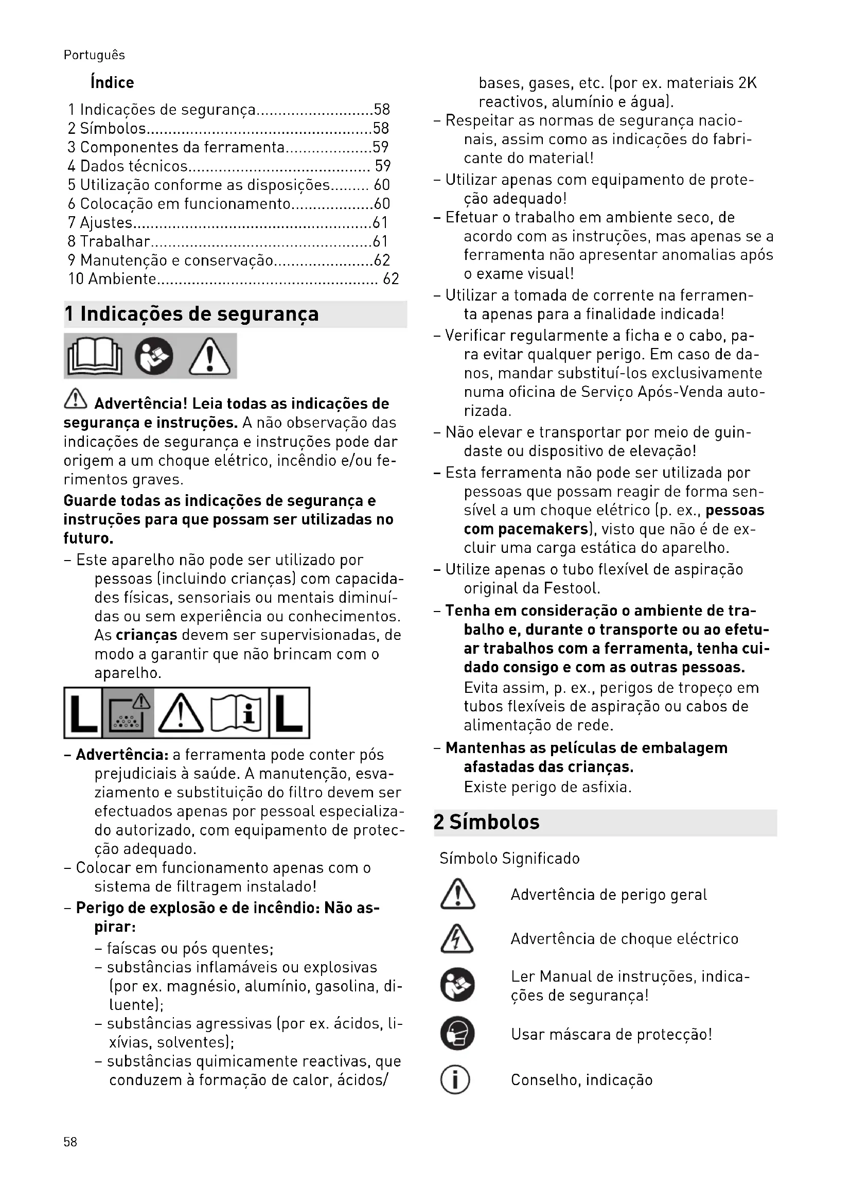 crianças devem ser supervisionadas, de modo a garantir que não brincam com o aparelho. – Advertência: a ferramenta pode conter pós prejudiciais à saúde. A manutenção, esva ziamento e substituição do filtro devem ser efectuados apenas por pessoal especializa do autorizado, com equipamento de protec ção adequado. – Colocar em funcionamento apenas com o sistema de filtragem instalado! – Perigo de explosão e de incêndio: Não as pirar: – faíscas ou pós quentes; – substâncias inflamáveis ou explosivas (por ex. magnésio, alumínio, gasolina, di luente); – substâncias agressivas (por ex. ácidos, li xívias, solventes); – substâncias quimicamente reactivas, que conduzem à formação de calor, ácidos/ bases, gases, etc. (por ex. materiais 2K reactivos, alumínio e água). – Respeitar as normas de segurança nacio nais, assim como as indicações do fabri cante do material! – Utilizar apenas com equipamento de prote ção adequado! – Efetuar o trabalho em ambiente seco, de acordo com as instruções, mas apenas se a ferramenta não apresentar anomalias após o exame visual! – Utilizar a tomada de corrente na ferramen ta apenas para a finalidade indicada! – Verificar regularmente a ficha e o cabo, pa ra evitar qualquer perigo. Em caso de da nos, mandar substituí-los exclusivamente numa oficina de Serviço Após-Venda auto rizada. – Não elevar e transportar por meio de guin daste ou dispositivo de elevação! – Esta ferramenta não pode ser utilizada por pessoas que possam reagir de forma sen sível a um choque elétrico (p. ex., pessoas com pacemakers ), visto que não é de ex cluir uma carga estática do aparelho. – Utilize apenas o tubo flexível de aspiração original da Festool. – Tenha em consideração o ambiente de tra balho e, durante o transporte ou ao efetu ar trabalhos com a ferramenta, tenha cui dado consigo e com as outras pessoas. Evita assim, p. ex., perigos de tropeço em tubos flexíveis de aspiração ou cabos de alimentação de rede. – Mantenhas as películas de embalagem afastadas das crianças. Existe perigo de asfixia. 2 Símbolos Símbolo Significado Advertência de perigo geral Advertência de choque eléctrico Ler Manual de instruções, indica ções de segurança! Usar máscara de protecção! Conselho, indicação Português 58Símbolo Significado Instruções de manuseamento Advertência! A ferramenta pode conter pó prejudicial à saúde! Não deite no lixo doméstico. 3 Componentes da ferramenta [1-1] Abertura de aspiração [1-2] Ponto de encaixe de módulos (Módulo de ar comprimido no CTL 36/48 E LE, CTL 36/48 E LE AC, Módu lo de tomada no CTL 26 E SD) [1-3] Tomada de corrente [1-4] Depósito para tubo flexível [1-5] Punho [1-6] SysDoc [1-7] Limpeza automática (apenas varian tes com AutoClean) [1-8] Interruptor da ferramenta [1-9] Regulação da força de aspiração. [1-10] Mola de fecho [1-11] Depósito para sujidade [1-13] Travão As figuras indicadas encontram-se no início do manual de instruções. 4 Dados técnicos Aspiradores móveis Consumo 350 ‑ 1200 W Potência máx. instalada na toma da de corrente
