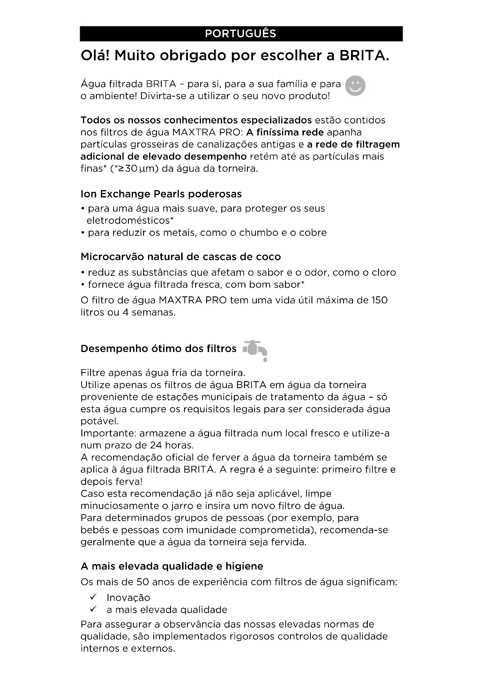 - fornece água filtrada fresca, com bom sabor* O filtro de água MAXTRA PRO tem uma vida útil máxima de 150 litros ou 4 semanas. Desempenho ótimo dos filtros Filtre apenas água fria da torneira. Utilize apenas os filtros de água BRITA em água da torneira proveniente de estações municipais de tratamento da água – só esta água cumpre os requisitos legais para ser considerada água potável. Importante: armazene a água filtrada num local fresco e utilize-a num prazo de 24 horas. A recomendação oficial de ferver a água da torneira também se aplica à água filtrada BRITA. A regra é a seguinte: primeiro filtre e depois ferva! Caso esta recomendação já não seja aplicável, limpe minuciosamente o jarro e insira um novo filtro de água. Para determinados grupos de pessoas (por exemplo, para bebés e pessoas com imunidade comprometida), recomenda-se geralmente que a água da torneira seja fervida. A mais elevada qualidade e higiene Os mais de 50 anos de experiência com filtros de água significam: 9 Inovação 9 a mais elevada qualidade Para assegurar a observância das nossas elevadas normas de qualidade, são implementados rigorosos controlos de qualidade internos e externos.Todos os filtros de água MAXTRA PRO são sujeitos a tratamento com vapor quente durante a fabricação, para efeitos de higiene, e então são embalados numa película protetora. (Nota: o filtro de água poderá estar húmido devido a condensação formada após o tratamento com vapor). Por motivos de higiene, o material de filtragem do filtro de água MAXTRA PRO é submetido a um tratamento especial com prata, Poderá ser libertada na água uma pequena quantidade de prata. Tal respeita as recomendações da Organização Mundial da Saúde (OMS). A BRITA recomenda que o filtro de água seja substituído regularmente. Queira respeitar os procedimentos de limpeza recomendados, bem como os conselhos sobre como preparar o filtro (capítulos 1 – 7). O jarro deve ser limpo regularmente. Nota: Caso o jarro já não seja utilizado há algum tempo, retire o filtro de água, esvazie o jarro e volte a colocar o filtro de água à solta no funil vazio. Consulte o capítulo 7 intitulado “Trocar o filtro de água MAXTRA PRO”. Funcionamento – muito fácil