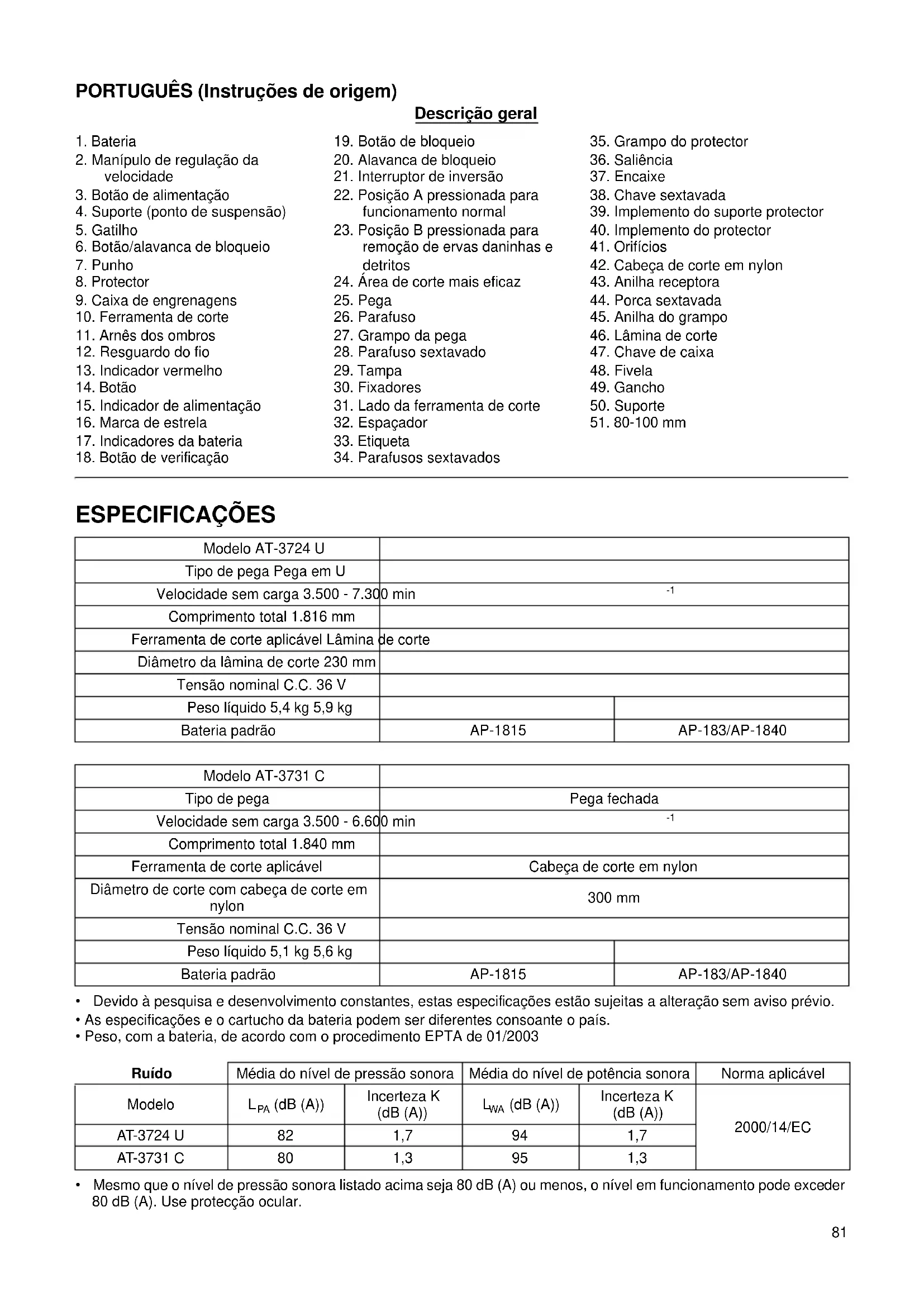 Comprimento total 1.816 mm Ferramenta de corte aplicável Lâmina de corte Diâmetro da lâmina de corte 230 mm Tensão nominal C.C. 36 V Peso líquido 5,4 kg 5,9 kg Bateria padrão AP-1815 AP-183/AP-1840 Modelo AT-3731 C Tipo de pega Pega fechada Velocidade sem carga 3.500 - 6.600 min