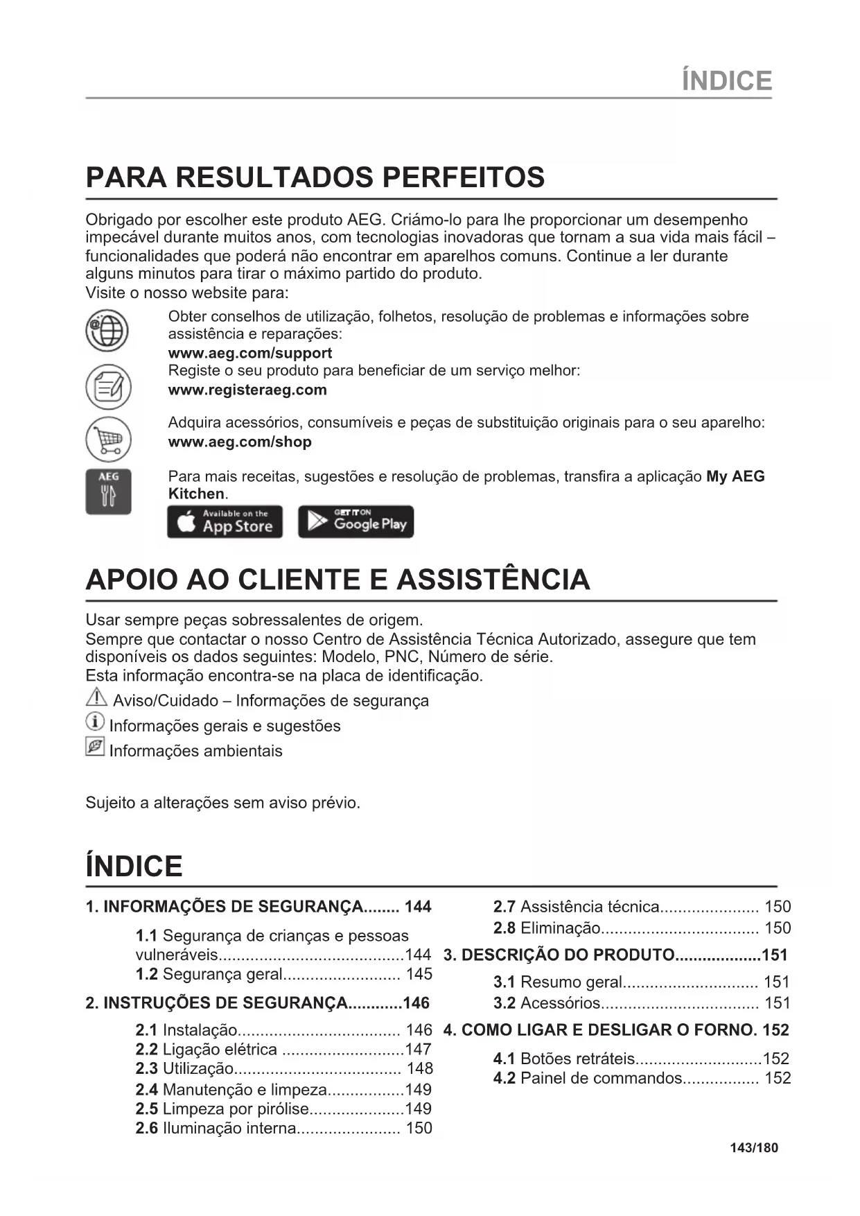 Obrigado por escolher este produto AEG. Criámo-lo para lhe proporcionar um desempenho impecável durante muitos anos, com tecnologias inovadoras que tornam a sua vida mais fácil – funcionalidades que poderá não encontrar em aparelhos comuns. Continue a ler durante alguns minutos para tirar o máximo partido do produto. Visite o nosso website para: Obter conselhos de utilização, folhetos, resolução de problemas e informações sobre assistência e reparações: www.aeg.com/support Registe o seu produto para beneficiar de um serviço melhor: www.registeraeg.com Adquira acessórios, consumíveis e peças de substituição originais para o seu aparelho: www.aeg.com/shop Para mais receitas, sugestões e resolução de problemas, transfira a aplicação My AEG Kitchen.
