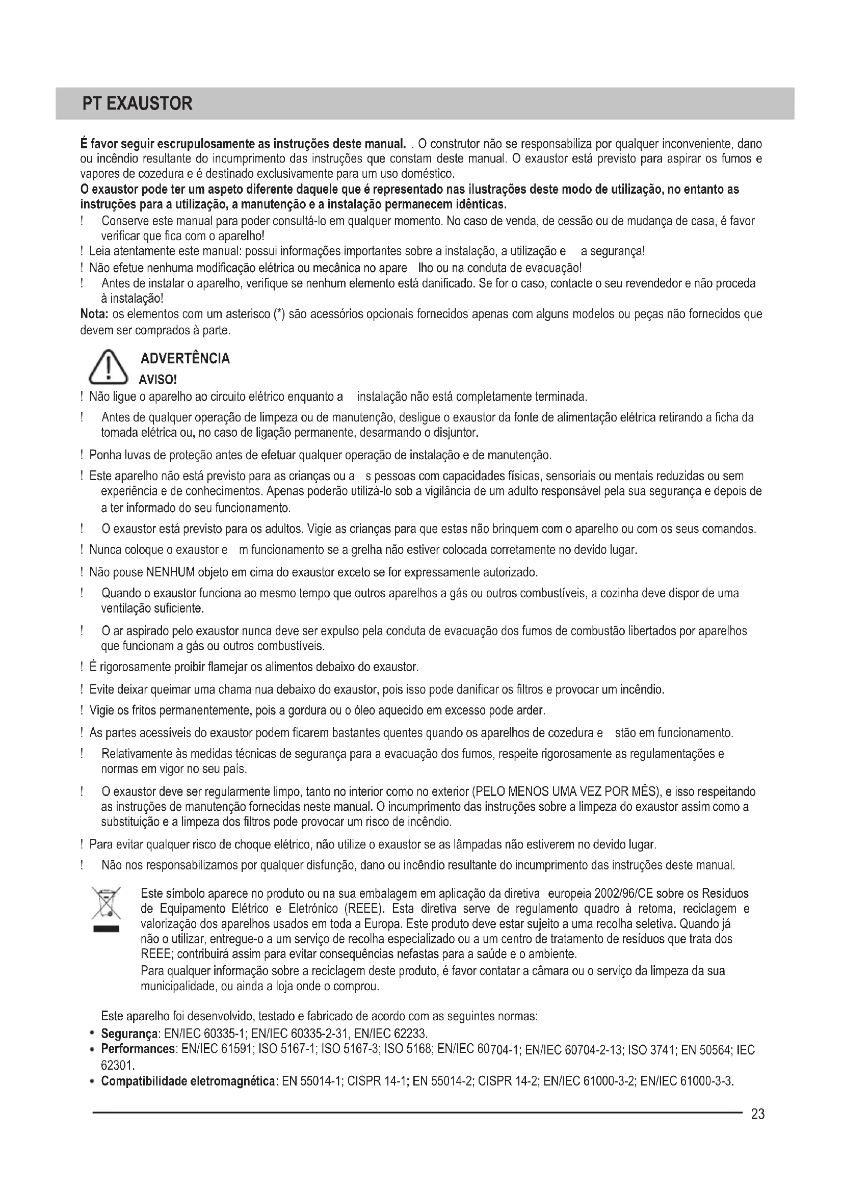 É favor seguir escrupulosamente as instruções deste manual. . O construtor não se responsabiliza por qualquer inconveniente, dano ou incêndio resultante do incumprimento das instruções que constam deste manual. O exaustor está previsto para aspirar os fumos e vapores de cozedura e é destinado exclusivamente para um uso doméstico. O exaustor pode ter um aspeto diferente daquele que é representado nas ilustrações deste modo de utilização, no entanto as instruções para a utilização, a manutenção e a instalação permanecem idênticas. ! Conserve este manual para poder consultá-lo em qualquer momento. No caso de venda, de cessão ou de mudança de casa, é favor verificar que fica com o aparelho! ! Leia atentamente este manual: possui informações importantes sobre a instalação, a utilização e a segurança! ! Não efetue nenhuma modificação elétrica ou mecânica no apare lho ou na conduta de evacuação! ! Antes de instalar o aparelho, verifique se nenhum elemento está danificado. Se for o caso, contacte o seu revendedor e não proceda à instalação! Nota: os elementos com um asterisco (*) são acessórios opcionais fornecidos apenas com alguns modelos ou peças não fornecidos que devem ser comprados à parte. ADVERTÊNCIA AVISO! ! Não ligue o aparelho ao circuito elétrico enquanto a instalação não está completamente terminada. ! Antes de qualquer operação de limpeza ou de manutenção, desligue o exaustor da fonte de alimentação elétrica retirando a ficha da tomada elétrica ou, no caso de ligação permanente, desarmando o disjuntor. ! Ponha luvas de proteção antes de efetuar qualquer operação de instalação e de manutenção. ! Este aparelho não está previsto para as crianças ou a s pessoas com capacidades físicas, sensoriais ou mentais reduzidas ou sem experiência e de conhecimentos. Apenas poderão utilizá-lo sob a vigilância de um adulto responsável pela sua segurança e depois de a ter informado do seu funcionamento. ! O exaustor está previsto para os adultos. Vigie as crianças para que estas não brinquem com o aparelho ou com os seus comandos. ! Nunca coloque o exaustor e m funcionamento se a grelha não estiver colocada corretamente no devido lugar. ! Não pouse NENHUM objeto em cima do exaustor exceto se for expressamente autorizado. ! Quando o exaustor funciona ao mesmo tempo que outros aparelhos a gás ou outros combustíveis, a cozinha deve dispor de uma ventilação suficiente. ! O ar aspirado pelo exaustor nunca deve ser expulso pela conduta de evacuação dos fumos de combustão libertados por aparelhos que funcionam a gás ou outros combustíveis. ! É rigorosamente proibir flamejar os alimentos debaixo do exaustor. ! Evite deixar queimar uma chama nua debaixo do exaustor, pois isso pode danificar os filtros e provocar um incêndio. ! Vigie os fritos permanentemente, pois a gordura ou o óleo aquecido em excesso pode arder. ! As partes acessíveis do exaustor podem ficarem bastantes quentes quando os aparelhos de cozedura e stão em funcioname nto. ! Relativamente às medidas técnicas de segurança para a evacuação dos fumos, respeite rigorosamente as regulamentações e normas em vigor no seu país. ! O exaustor deve ser regularmente limpo, tanto no interior como no exterior (PELO MENOS UMA VEZ POR MÊS), e isso respeitando as instruções de manutenção fornecidas neste manual. O incumprimento das instruções sobre a limpeza do exaustor assim como a substituição e a limpeza dos filtros pode provocar um risco de incêndio. ! Para evitar qualquer risco de choque elétrico, não utilize o exaustor se as lâmpadas não estiverem no devido lugar. ! Não nos responsabilizamos por qualquer disfunção, dano ou incêndio resultante do incumprimento das instruções deste manual. Este símbolo aparece no produto ou na sua embalagem em aplicação da diretiva europeia 2002/96/CE sobre os Resíduos de Equipamento Elétrico e Eletrónico (REEE). Esta diretiva serve de regulamento quadro à retoma, reciclagem e valorização dos aparelhos usados em toda a Europa. Este produto deve estar sujeito a uma recolha seletiva. Quando já não o utilizar, entregue-o a um serviço de recolha especializado ou a um centro de tratamento de resíduos que trata dos REEE; contribuirá assim para evitar consequências nefastas para a saúde e o ambiente. Para qualquer informação sobre a reciclagem deste produto, é favor contatar a câmara ou o serviço da limpeza da sua municipalidade, ou ainda a loja onde o comprou. Este aparelho foi desenvolvido, testado e fabricado de acordo com as seguintes normas: Segurança: EN/IEC 60335-1; EN/IEC 60335-2-31, EN/IEC 62233. Performances: EN/IEC 61591; ISO 5167-1; ISO 5167-3; ISO 5168; EN/IEC 60 704-1; EN/IEC 60704-2-13; ISO 3741; EN 50564; IEC