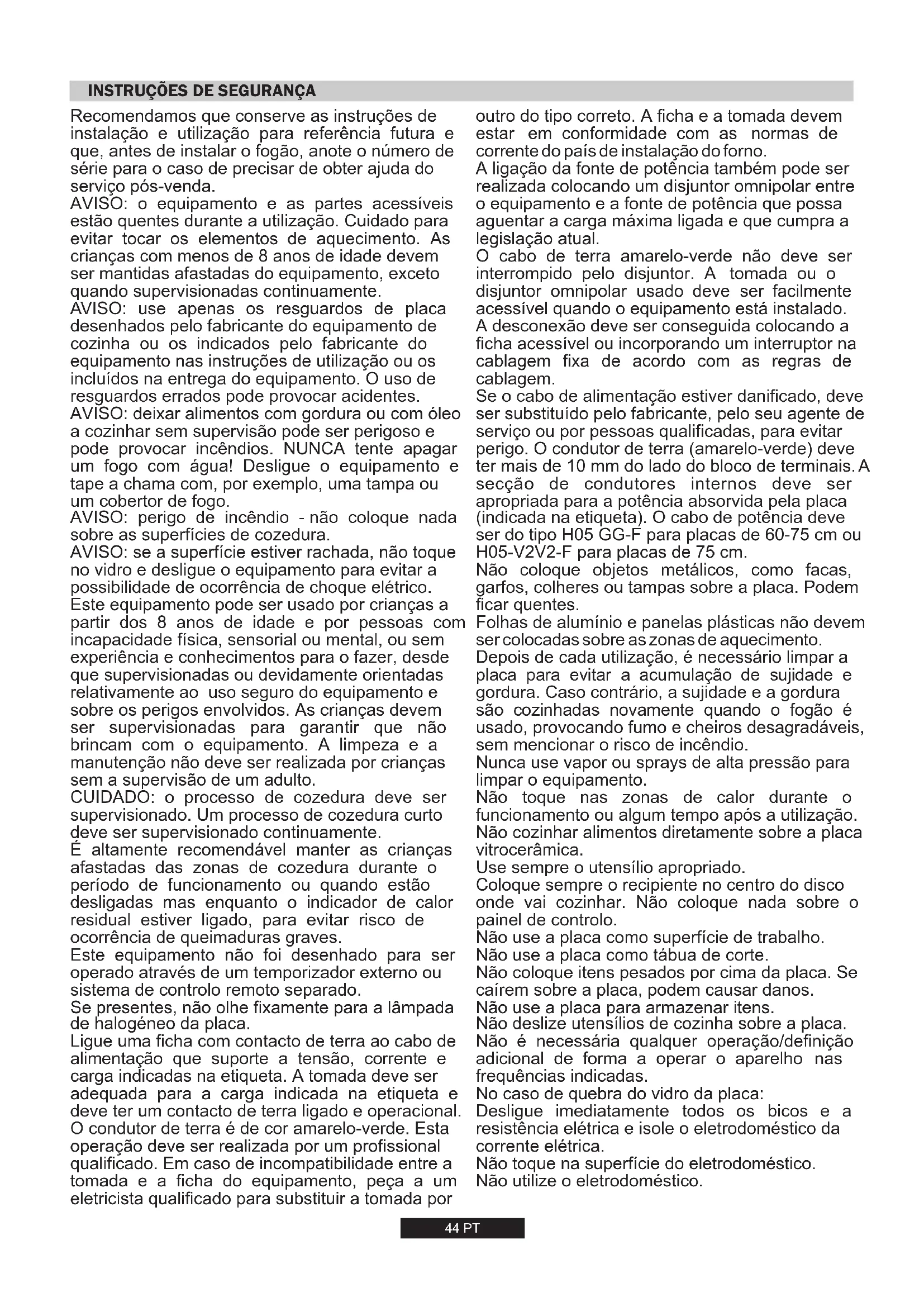 Tabella 1 UR 3,5 kW44 PT Recomendamos que conserve as instruções de instalação e utilização para referência futura e que, antes de instalar o fogão, anote o número de série para o caso de precisar de obter ajuda do serviço pós-venda. Se presentes, não olhe fixamente para a lâmpada de halogéneo da placa. É altamente recomendável manter as crianças afastadas das zonas de cozedura durante o período de funcionamento ou quando estão desligadas mas enquanto o indicador de calor residual estiver ligado, para evitar risco de ocorrência de queimaduras graves. AVISO: se a superfície estiver rachada, não toque no vidro e desligue o equipamento para evitar a possibilidade de ocorrência de choque elétrico. CUIDADO: o processo de cozedura deve ser supervisionado. Um processo de cozedura curto deve ser supervisionado continuamente. AVISO: deixar alimentos com gordura ou com óleo a cozinhar sem supervisão pode ser perigoso e pode provocar incêndios. NUNCA tente apagar um fogo com água! Desligue o equipamento e tape a chama com, por exemplo, uma tampa ou um cobertor de fogo. AVISO: perigo de incêndio - não coloque nada sobre as superfícies de cozedura. Este equipamento pode ser usado por crianças a partir dos 8 anos de idade e por pessoas com incapacidade física, sensorial ou mental, ou sem experiência e conhecimentos para o fazer, desde que supervisionadas ou devidamente orientadas relativamente ao uso seguro do equipamento e sobre os perigos envolvidos. As crianças devem ser supervisionadas para garantir que não brincam com o equipamento. A limpeza e a manutenção não deve ser realizada por crianças sem a supervisão de um adulto. AVISO: use apenas os resguardos de placa desenhados pelo fabricante do equipamento de cozinha ou os indicados pelo fabricante do equipamento nas instruções de utilização ou os incluídos na entrega do equipamento. O uso de resguardos errados pode provocar acidentes. AVISO: o equipamento e as partes acessíveis estão quentes durante a utilização. Cuidado para evitar tocar os elementos de aquecimento. As crianças com menos de 8 anos de idade devem ser mantidas afastadas do equipamento, exceto quando supervisionadas continuamente. Este equipamento não foi desenhado para ser operado através de um temporizador externo ou sistema de controlo remoto separado. Ligue uma ficha com contacto de terra ao cabo de alimentação que suporte a tensão, corrente e carga indicadas na etiqueta. A tomada deve ser adequada para a carga indicada na etiqueta e deve ter um contacto de terra ligado e operacional. O condutor de terra é de cor amarelo-verde. Esta operação deve ser realizada por um profissional qualificado. Em caso de incompatibilidade entre a tomada e a ficha do equipamento, peça a um eletricista qualificado para substituir a tomada por