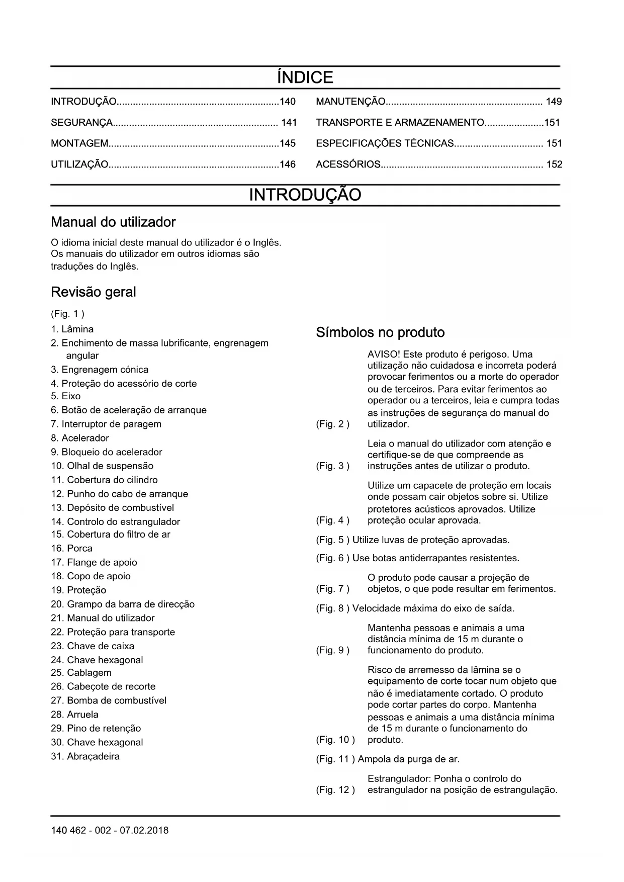 Símbolos no produto (Fig. 2 ) AVISO! Este produto é perigoso. Uma utilização não cuidadosa e incorreta poderá provocar ferimentos ou a morte do operador ou de terceiros. Para evitar ferimentos ao operador ou a terceiros, leia e cumpra todas as instruções de segurança do manual do utilizador. (Fig. 3 ) Leia o manual do utilizador com atenção e certifique-se de que compreende as instruções antes de utilizar o produto. (Fig. 4 ) Utilize um capacete de proteção em locais onde possam cair objetos sobre si. Utilize protetores acústicos aprovados. Utilize proteção ocular aprovada. (Fig. 5 ) Utilize luvas de proteção aprovadas. (Fig. 6 ) Use botas antiderrapantes resistentes. (Fig. 7 ) O produto pode causar a projeção de objetos, o que pode resultar em ferimentos. (Fig. 8 ) Velocidade máxima do eixo de saída. (Fig. 9 ) Mantenha pessoas e animais a uma distância mínima de 15 m durante o funcionamento do produto. (Fig. 10 ) Risco de arremesso da lâmina se o equipamento de corte tocar num objeto que não é imediatamente cortado. O produto pode cortar partes do corpo. Mantenha pessoas e animais a uma distância mínima de 15 m durante o funcionamento do produto. (Fig. 11 ) Ampola da purga de ar. (Fig. 12 ) Estrangulador: Ponha o controlo do estrangulador na posição de estrangulação. 140 462 - 002 - 07.02.2018(Fig. 13 ) Mantenha todas as partes do seu corpo afastadas das superfícies quentes. (Fig. 14 ) Para informações sobre as emissões de ruído para o meio ambiente consulte a diretiva da Comunidade Europeia. As emissões do produto são indicadas no capítulo de Especificações técnicas e na etiqueta. (Fig. 15 ) O produto está em conformidade com as diretivas CE aplicáveis. Nota: Os restantes símbolos/autocolantes existentes no produto dizem respeito a exigências para homologação em outras áreas comerciais. Responsabilidade pelo produto Como referido nas leis de responsabilidade pelo produto, não somos responsáveis por danos causados pelo nosso produto se: