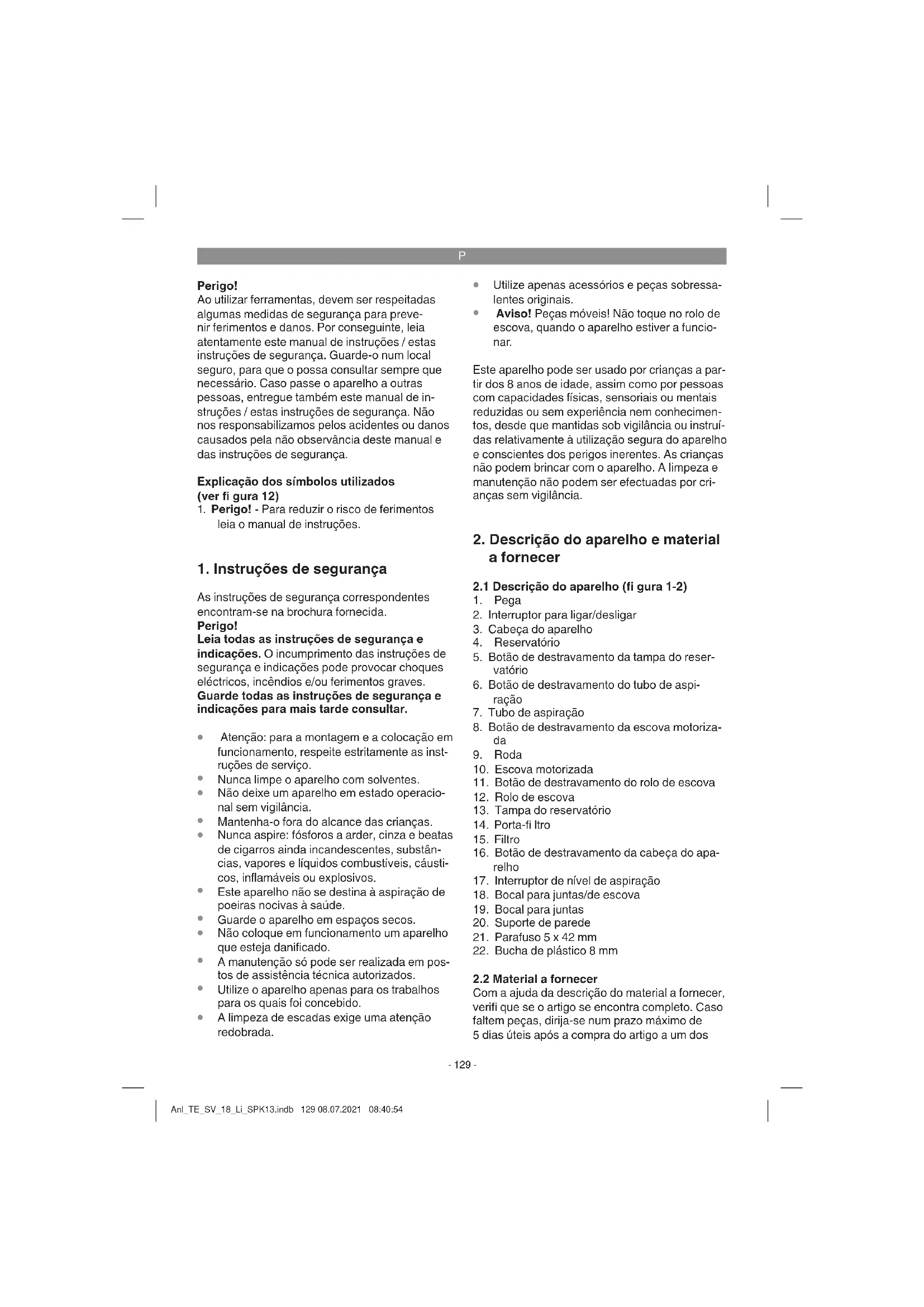 Com a ajuda da descrição do material a fornecer, verifi que se o artigo se encontra completo. Caso faltem peças, dirija-se num prazo máximo de 5 dias úteis após a compra do artigo a um dos Anl_TE_SV_18_Li_SPK13.indb 129 08.07.2021 08:40:54P