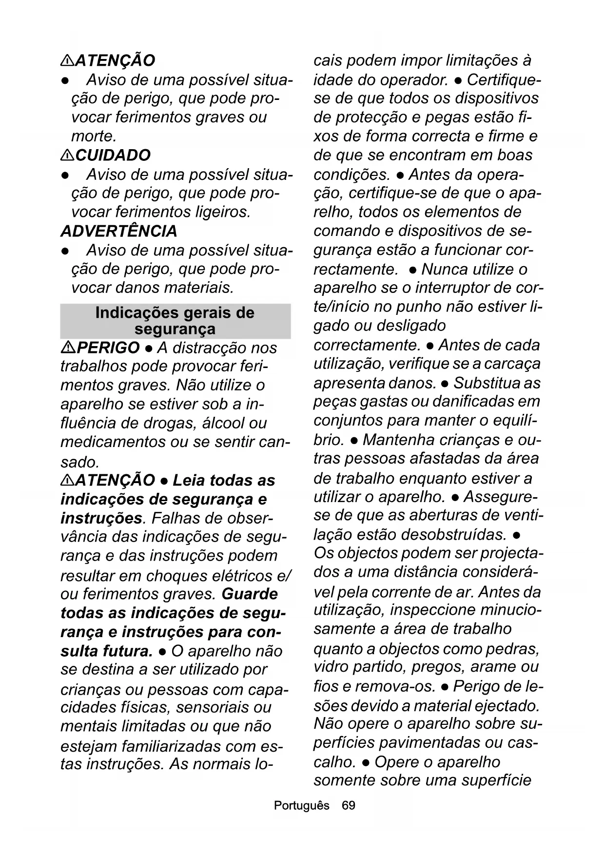 - Declaração de conformidade UE Português 69 몇 ATENÇÃO ● Aviso de uma possível situa- ção de perigo, que pode pro- vocar ferimentos graves ou morte. 몇 CUIDADO ● Aviso de uma possível situa- ção de perigo, que pode pro- vocar ferimentos ligeiros. ADVERTÊNCIA ● Aviso de uma possível situa- ção de perigo, que pode pro- vocar danos materiais. Indicações gerais de segurança PERIGO ● A distracção nos trabalhos pode provocar feri- mentos graves. Não utilize o aparelho se estiver sob a in- fluência de drogas, álcool ou medicamentos ou se sentir can- sado. 몇 ATENÇÃO ● Leia todas as indicações de segurança e instruções. Falhas de obser- vância das indicações de segu- rança e das instruções podem resultar em choques elétricos e/ ou ferimentos graves. Guarde todas as indicações de segu- rança e instruções para con- sulta futura. ● O aparelho não se destina a ser utilizado por crianças ou pessoas com capa- cidades físicas, sensoriais ou mentais limitadas ou que não estejam familiarizadas com es- tas instruções. As normais lo- cais podem impor limitações à idade do operador. ● Certifique- se de que todos os dispositivos de protecção e pegas estão fi- xos de forma correcta e firme e de que se encontram em boas condições. ● Antes da opera- ção, certifique-se de que o apa- relho, todos os elementos de comando e dispositivos de se- gurança estão a funcionar cor- rectamente. ● Nunca utilize o aparelho se o interruptor de cor- te/início no punho não estiver li- gado ou desligado correctamente. ● Antes de cada utilização, verifique se a carcaça apresenta danos. ● Substitua as peças gastas ou danificadas em conjuntos para manter o equilí- brio. ● Mantenha crianças e ou- tras pessoas afastadas da área de trabalho enquanto estiver a utilizar o aparelho. ● Assegure- se de que as aberturas de venti- lação estão desobstruídas. ● Os objectos podem ser projecta- dos a uma distância considerá- vel pela corrente de ar . Antes da utilização, inspeccione minucio- samente a área de trabalho quanto a objectos como pedras, vidro partido, pregos, arame ou fios e remova-os. ● Perigo de le- sões devido a material ejectado. Não opere o aparelho sobre su- perfícies pavimentadas ou cas- calho. ● Opere o aparelho somente sobre uma superfície70 Português firme e plana e na posição reco- mendada. 몇 CUIDADO ● Familiarize-se com os elementos de comando e a utilização adequada do apa- relho. ● Utilize protecção auditi- va completa ao usar o aparelho. O aparelho é extremamente rui- doso e pode causar lesões audi- tivas permanentes, se não seguir estritamente as instru- ções relativas a exposição, re- dução de ruído e protecção auditiva. ● Utilize protecção ocular completa ao usar o apa- relho. O fabricante recomenda vivamente a utilização de uma máscara completa ou de óculos de protecção totalmente fecha- dos. Óculos ou óculos de sol normais não oferecem protec- ção contra objectos projectados. ● Perigo de lesões, se vestuário solto, cabelo ou jóias forem as- pirados para a entrada de ar do aparelho. Prenda cabelos com- pridos acima do nível dos om- bros. ● Vista calças compridas e pesadas, calçado resistente e luvas com a medida adequada durante os trabalhos com o apa- relho. Não trabalhe descalço. Não use jóias, sandálias ou cal- ças curtas. ADVERTÊNCIA ● O operador do aparelho é responsável por acidentes com outras pessoas e os seus bens. Aviso ● Nalgumas regiões po- dem existir normas que limitam a utilização deste aparelho. In- forme-se junto da autoridade lo- cal competente. ● Mande substituir as placas de aviso da- nificadas ou ilegíveis no apare- lho pelo Serviço de assistência técnica autorizado. ● Antes da utilização do aspirador/soprador a bateria, solte as sujidades com um ancinho e vassoura. Operação segura PERIGO ● Proibida a opera- ção em zonas com perigo de ex- plosão. 몇 ATENÇÃO ● Mantenha uma distância mínima de 15 m relati- vamente a pessoas e animais. Pare o aparelho, se alguém en- trar nesta área. ● Mantenha o rosto e o corpo afastados da abertura de alimentação. ● An- tes de iniciar o aparelho, verifi- que se a câmara de alimentação está vazia. ● Não coloque as mãos ou outras partes do corpo dentro da câmara de alimenta- ção, do compartimento de ejec- ção ou próximo de outras peças móveis. ● Não utilize o aparelho se existir o risco de relâmpago. ● Tem de ter uma vista desobs- truída da área de trabalho para conseguir reconhecer possíveis perigos. Utilize o aparelho ape- nas se existir uma boa ilumina- ção. ● Não corra ao trabalharPortuguês 71 com o aparelho, caminhe. Não ande para trás. Evite uma postu- ra corporal fora do normal. Cer- tifique-se de que a sua postura é estável, segura e mantém o equilíbrio. ● Nunca utilize o apa- relho com dispositivos de pro- tecção defeituosos ou sem dispositivos de segurança, co- mo, por exemplo, depósitos de recolha de lixo montados. ● Pa- re imediatamente o aparelho e verifique se há danos ou identifi- que a causa da vibração se o aparelho cair, bater ou vibrar de forma anormal. Mande reparar os danos junto do serviço de as- sistência técnica autorizado ou substitua o aparelho. ● Em caso de avaria ou acidente, desligue imediatamente o aparelho e reti- re o conjunto de bateria. O apa- relho só pode ser novamente colocado em funcionamento de- pois de ter sido verificado por um serviço de assistência técni- ca autorizado. ● Perigo de le- sões nas peças rotativas. Desligue o motor, retire o con- junto da bateria e certifique-se de que todas as peças móveis se imobilizaram completamen- te: Antes de deixar o aparelho sem vigilância. Antes de remover bloqueios ou limpar o tubo. Antes de verificar o aparelho depois de este ter sido atingi- do por um objecto estranho. Antes de verificar, efectuar a manuten