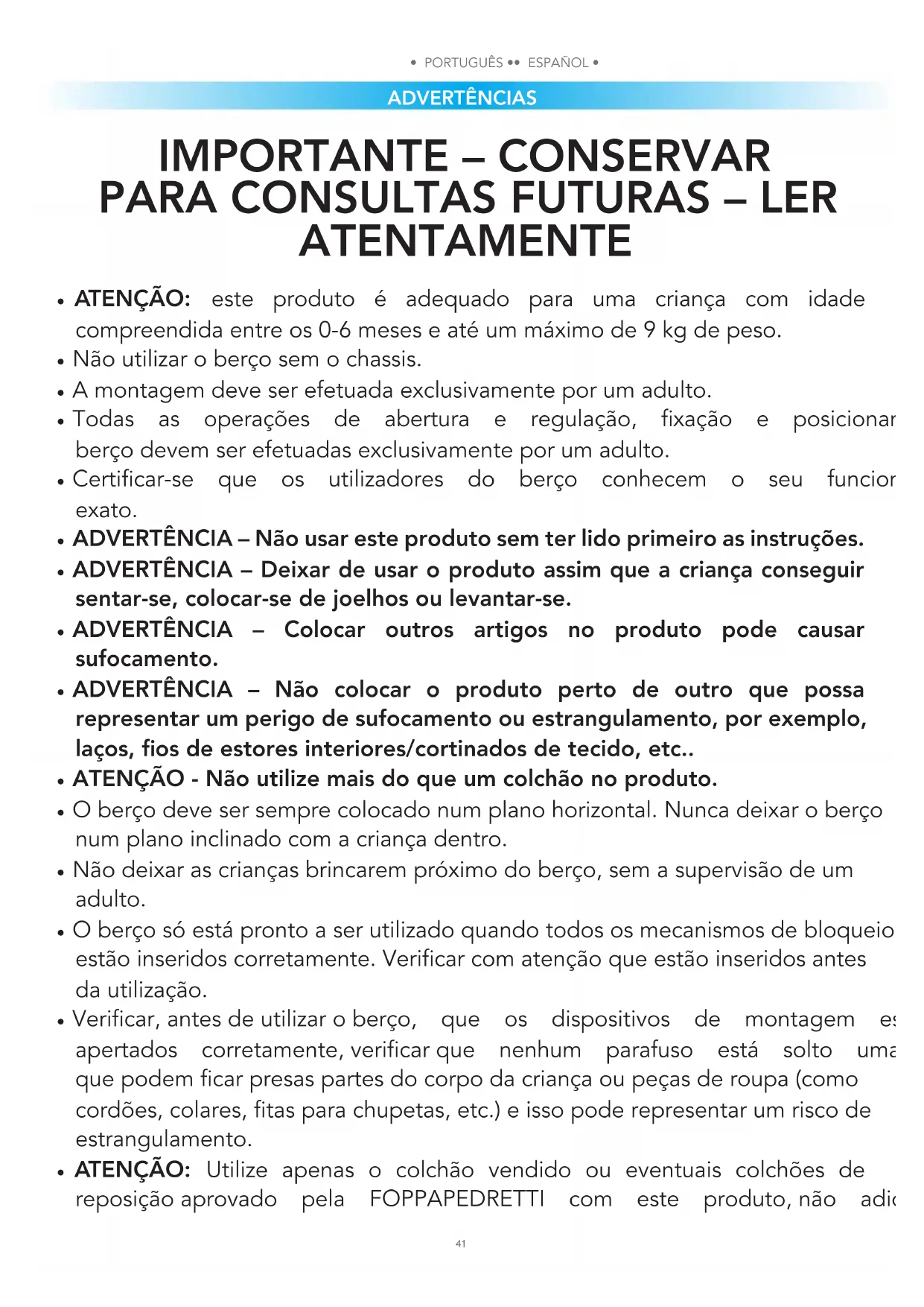 - NÃO utilize o berço se qualquer componente estiver ausente, danicado ou partido. Contacte a FOPPAPEDRETTI para obter peças de substituição e instruções para utilização, se necessário. Não substitua peças em falta, ADVERTÊNCIAS43