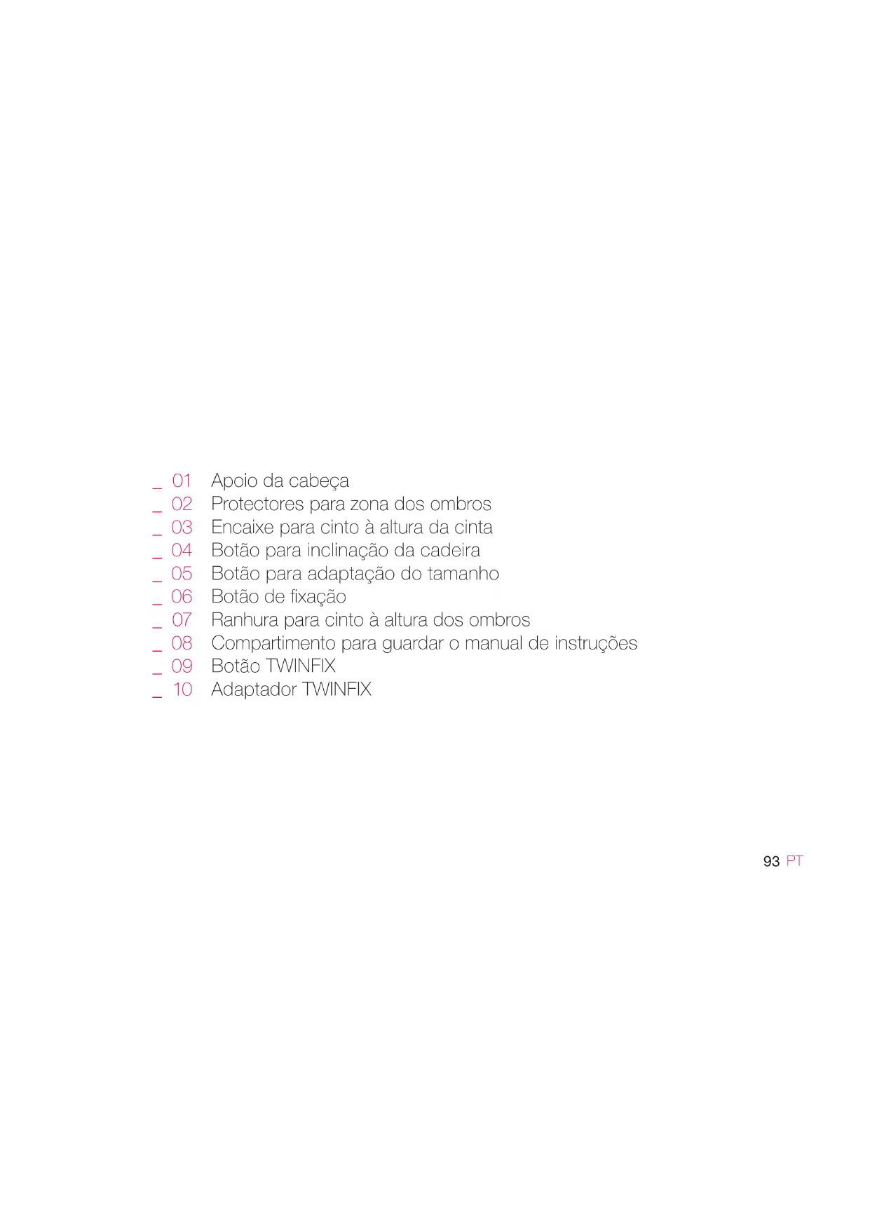 Apoio da cabeça Protectores para zona dos ombros Encaixe para cinto à altura da cinta Botão para inclinação da cadeira Botão para adaptação do tamanho Botão de xação Ranhura para cinto à altura dos ombros Compartimento para guardar o manual de instruções Botão TWINFIX Adaptador TWINFIX _ 01 _ 02 _ 03 _ 04 _ 05 _ 06 _ 07 _ 08 _ 09 _ 10 IM 2193.01 TRANSFORMER_iPLUS int.indd 93 18/6/21 17:2894