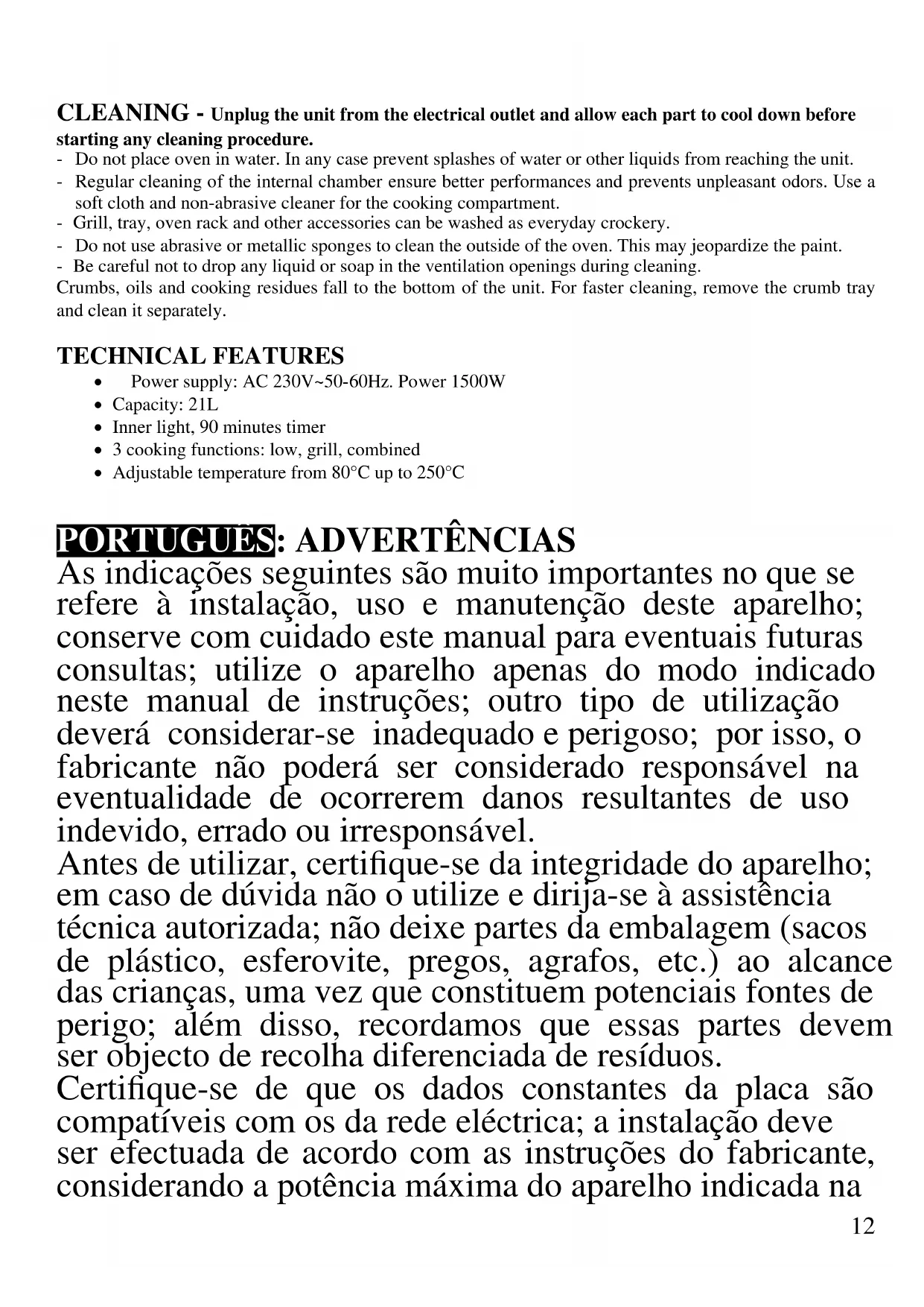 Com o selector funções (3) é possível seleccionar somente resistência inferior, superior ou ambas Posição 1: Liga a resistência superior (cozedura a GRILL) Posição 2: Liga a resistência inferior Posição 3 (Grelhados) : Liga a resistência superior e inferior. O selector de temperatura (5) permite estabelecer temperaturas entre os 80º e os 250º. O temporizador (2) permite seleccionar o tempo entre 0 e 90 m. Girando-o à esquerda do forno permanecerá indefinidamente. A luz interior funciona automaticamente assim que o forno é ligado PRE-AQUECIMENTO Efectuar o pré-aquecimento sem alimentos no forno - Regular o timer (2) sem 10 minutos. Regular a temperatura desejada (5). - Regular o selector de funções na posição desejada (3) - Quando o timer emitir o sinal acústico, o pré-aquecimento estará concluído COZINHAR - Coloque a comida no recipiente ou no tabuleiro, seleccione a temperatura (5), temporizador (2) e função (3) e coloque a grelha do forno na altura adequada. - Coloque sempre o tabuleiro (9) por baixo da grelha (8) para evitar que caia gordura no elemento de aquecimento inferior. A luz de funcionamento (4) ligar-se-á, indicando uso. - Verifique periodicamente a condição da comida enquanto está a ser confeccionada. No caso de ser necessário abrir a porta, seja breve de forma a não baixar em demasia a temperatura. No final do processo de cozedura, a luz desligar-se-á e o temporizador emitirá beeps. Se a cozedura não estiver terminada regule o temporizador. Remova o tabuleiro e grelha sempre com pegador de panela. Coloque no mínimo o regulador de temperatura (5). LIMPEZA - Desligue o produto da ficha eléctrica e deixe arrefecer antes de iniciar qualquer procedimento de limpeza - Não coloque o forno em água. Evite salpicar água ou outros líquidos no produto. - A limpeza regular da cavidade interna do produto garante performances melhores, o aumento da vida útil do produto e evita odores desagradáveis. Use um pano suave e produtos não abrasivos para limpar a cavidade interior. Os acessórios podem ser lavados como qualquer outra louça. - Não use esponjas de metal ou produtos abrasivos para limpar o exterior do produto pois tal pode comprometer a pintura do produto Não deixe cair líquidos ou detergentes para os orifícios de ventilação. Migalhas, gordura, óleos e resíduos caem para o fundo da cavidade. Para uma limpeza mais fácil retire o tabuleiro inferior e lave separadamente.17