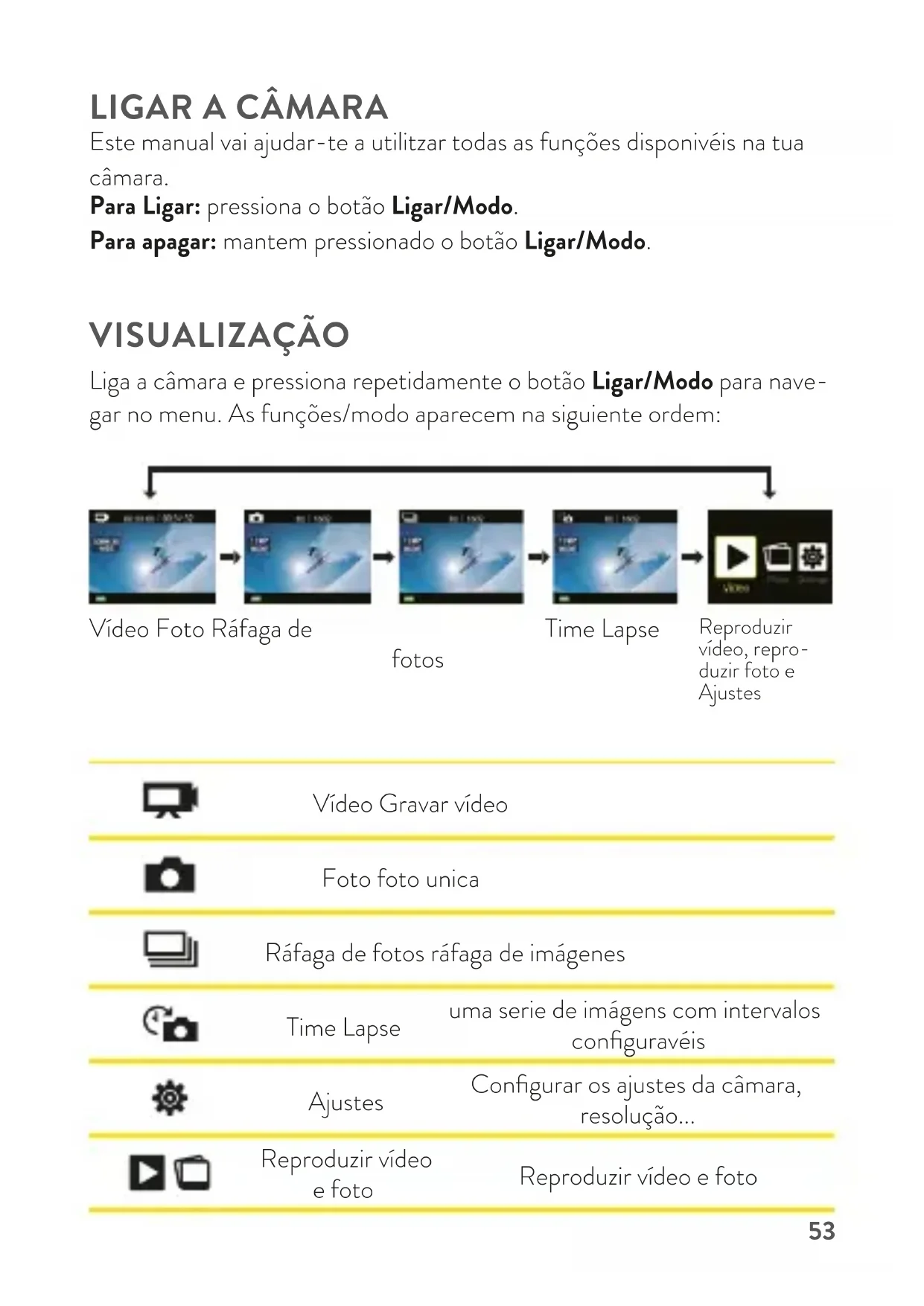 Este manual vai ajudar-te a utilitzar todas as funções disponivéis na tua câmara. Para Ligar: pressiona o botão Ligar/Modo. Para apagar: mantem pressionado o botão Ligar/Modo. VISUALIZAÇÃO Liga a câmara e pressiona repetidamente o botão Ligar/Modo para nave- gar no menu. As funções/modo aparecem na siguiente ordem: Vídeo Gravar vídeo Foto foto unica Ráfaga de fotos ráfaga de imágenes Time Lapse uma serie de imágens com intervalos configuravéis Ajustes Configurar os ajustes da câmara, resolução... Reproduzir vídeo e foto Reproduzir vídeo e foto Vídeo Foto Ráfaga de fotos Time Lapse Reproduzir vídeo, repro- duzir foto e Ajustes54 AJUSTES Pressiona o botão Obturador/Selector para entrar no menú de ajustes. Pressiona repetidamente o botão Ligar/Modo para navegar nas diferentes opções y pressiona Obturador/Selector para selecionar a opção desejada. Resolução de vídeo: 1080p 30fps/720p 60fps Cartão Micro SD 4K - 25fps 1080p - 60fps 1080p - 30fps 32 GB 60 min 180 min 300 min 16 GB 30 min 90 min 150 min Video em ciclo: On/O Data: O/data/data & Hora Exposição: +-2.0/+-1.7/+-1.3/+-1.0/+-0.7/+-0.30/0 Resolução Foto: 12M/8M/5M/4M Ráfaga fotos: 3 fotos Time Lapse: 2s/3s/5s/10s/20s/30s/60s Foto Continua: O/On Frequência red: 50Hz/60Hz/Auto Lingua: Inglês/ Alemão/ Italiano/Espanhol/Português/ Holandes/ Françês/ Checo/ Polaco /Turco/Russo/Japones Data y Hora: MM/DD/YY, YY/MM/DD o DD/MM/YY Sons: Obturador On/O, Start Up On/O, Bepp On/O, Volume 0/1/2/3 Rotação imagem: Sim/Não Economizar Ecran: O/1 min/3 min/5 min55 Economizar bateria: O/1 min/3 min/5 min Formatar: No/Sí Reset: No/Sí Versão