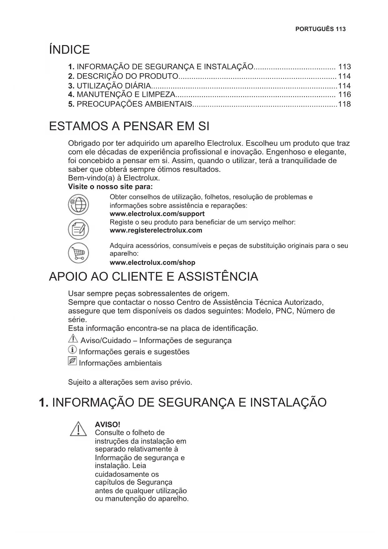 Obrigado por ter adquirido um aparelho Electrolux. Escolheu um produto que traz com ele décadas de experiência profissional e inovação. Engenhoso e elegante, foi concebido a pensar em si. Assim, quando o utilizar, terá a tranquilidade de saber que obterá sempre ótimos resultados. Bem-vindo(a) à Electrolux. Visite o nosso site para: Obter conselhos de utilização, folhetos, resolução de problemas e informações sobre assistência e reparações: www.electrolux.com/support Registe o seu produto para beneficiar de um serviço melhor: www.registerelectrolux.com Adquira acessórios, consumíveis e peças de substituição originais para o seu aparelho: www.electrolux.com/shop