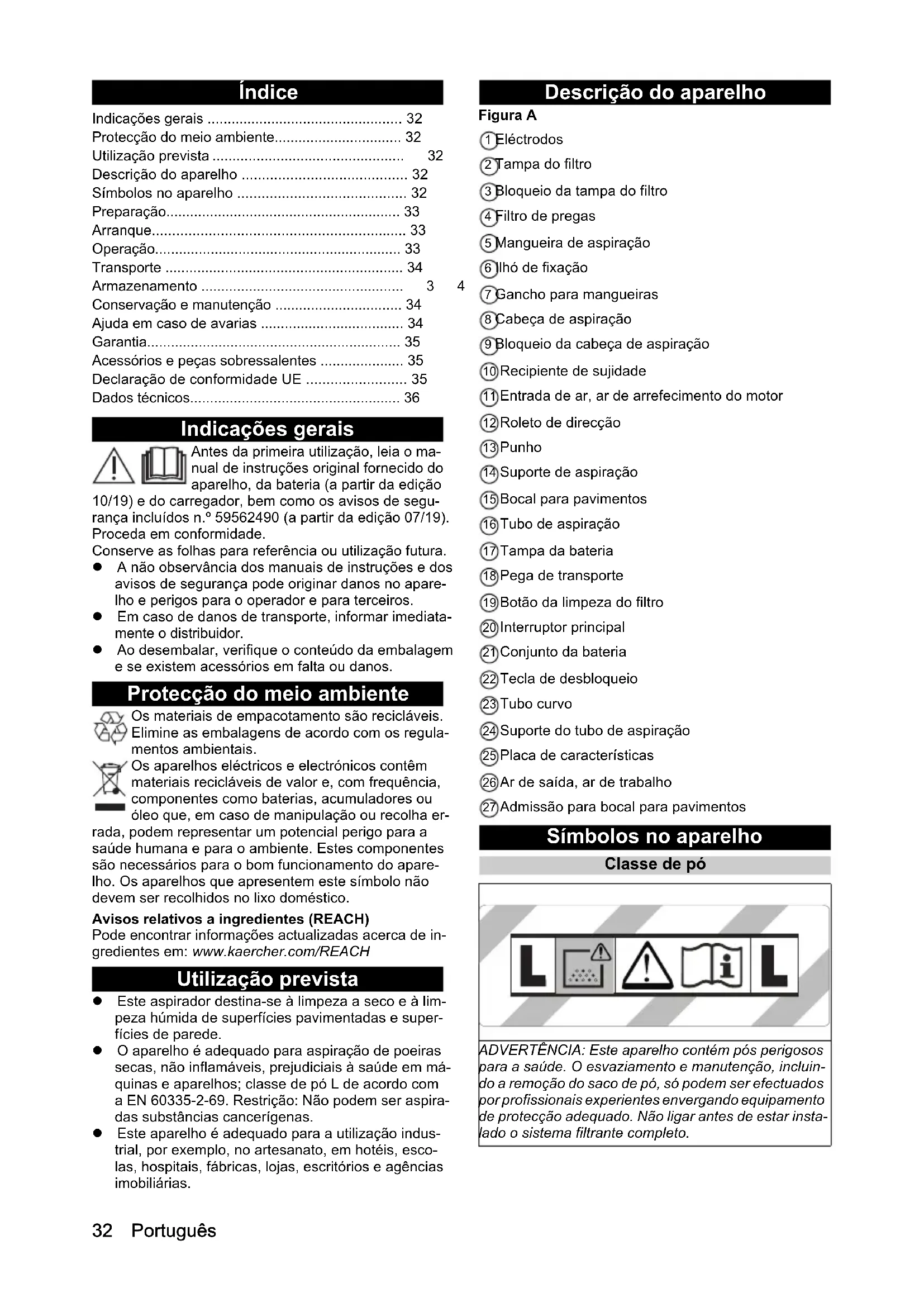 • 0,232 Português Índice Indicações gerais Antes da primeira utilização, leia o ma- nual de instruções original fornecido do aparelho, da bateria (a partir da edição 10/19) e do carregador, bem como os avisos de segu- rança incluídos n.º 59562490 (a partir da edição 07/19). Proceda em conformidade. Conserve as folhas para referência ou utilização futura. A não observância dos manuais de instruções e dos avisos de segurança pode originar danos no apare- lho e perigos para o operador e para terceiros. Em caso de danos de transporte, informar imediata- mente o distribuidor. Ao desembalar, verifique o conteúdo da embalagem e se existem acessórios em falta ou danos. Protecção do meio ambiente Os materiais de empacotamento são recicláveis. Elimine as embalagens de acordo com os regula- mentos ambientais. Os aparelhos eléctricos e electrónicos contêm materiais recicláveis de valor e, com frequência, componentes como baterias, acumuladores ou óleo que, em caso de manipulação ou recolha er- rada, podem representar um potencial perigo para a saúde humana e para o ambiente. Estes componentes são necessários para o bom funcionamento do apare- lho. Os aparelhos que apresentem este símbolo não devem ser recolhidos no lixo doméstico. Avisos relativos a ingredientes (REACH) Pode encontrar informações actualizadas acerca de in- gredientes em: www.kaercher.com/REACH Utilização prevista Este aspirador destina-se à limpeza a seco e à lim- peza húmida de superfícies pavimentadas e super- fícies de parede. O aparelho é adequado para aspiração de poeiras secas, não inflamáveis, prejudiciais à saúde em má- quinas e aparelhos; classe de pó L de acordo com a EN 60335-2-69. Restrição: Não podem ser aspira- das substâncias cancerígenas. Este aparelho é adequado para a utilização indus- trial, por exemplo, no artesanato, em hotéis, esco- las, hospitais, fábricas, lojas, escritórios e agências imobiliárias. Descrição do aparelho Figura A 1 Eléctrodos 2 Tampa do filtro 3 Bloqueio da tampa do filtro 4 Filtro de pregas 5 Mangueira de aspiração 6 Ilhó de fixação 7 Gancho para mangueiras 8 Cabeça de aspiração 9 Bloqueio da cabeça de aspiração 10 Recipiente de sujidade 11 Entrada de ar, ar de arrefecimento do motor 12 Roleto de direcção 13 Punho 14 Suporte de aspiração 15 Bocal para pavimentos 16 Tubo de aspiração 17 Tampa da bateria 18 Pega de transporte 19 Botão da limpeza do filtro 20 Interruptor principal 21 Conjunto da bateria 22 Tecla de desbloqueio 23 Tubo curvo 24 Suporte do tubo de aspiração 25 Placa de características 26 Ar de saída, ar de trabalho 27 Admissão para bocal para pavimentos Símbolos no aparelho Classe de pó Indicações gerais p. 32