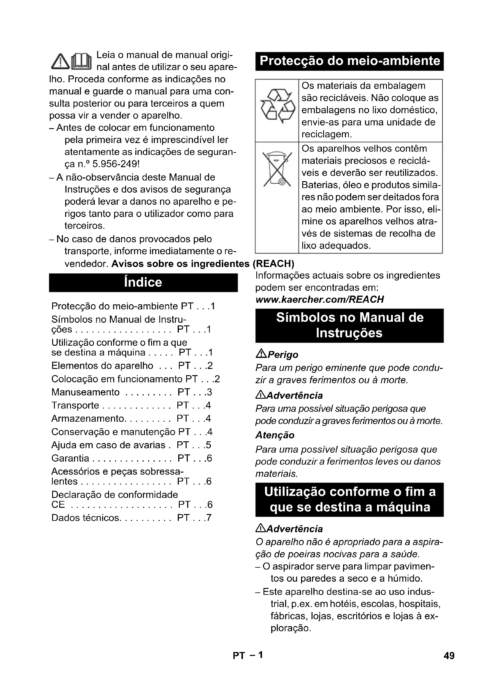 No. de pieza Longitud del cable EU 6.649-915.0 10 m 48 ES– 1 Leia o manual de manual origi- nal antes de utilizar o seu apare- lho. Proceda conforme as indicações no manual e guarde o manual para uma con- sulta posterior ou para terceiros a quem possa vir a vender o aparelho. – Antes de colocar em funcionamento pela primeira vez é imprescindível ler atentamente as indicações de seguran- ça n.º 5.956-249! – A não-observância deste Manual de Instruções e dos avisos de segurança poderá levar a danos no aparelho e pe- rigos tanto para o utilizador como para terceiros. – No caso de danos provocados pelo transporte, informe imediatamente o re- vendedor. Avisos sobre os ingredientes (REACH) Informações actuais sobre os ingredientes podem ser encontradas em: www.kaercher.com/REACH Perigo Para um perigo eminente que pode condu- zir a graves ferimentos ou à morte. 몇 Advertência Para uma possível situação perigosa que pode conduzir a graves ferimentos ou à morte. Atenção Para uma possível situação perigosa que pode conduzir a ferimentos leves ou danos materiais. 몇 Advertência O aparelho não é apropriado para a aspira- ção de poeiras nocivas para a saúde. – O aspirador serve para limpar pavimen- tos ou paredes a seco e a húmido. – Este aparelho destina-se ao uso indus- trial, p.ex. em hotéis, escolas, hospitais, fábricas, lojas, escritórios e lojas à ex- ploração. Índice Protecção do meio-ambiente PT . . .1 Símbolos no Manual de Instru- ções . . . . . . . . . . . . . . . . . . PT . . .1 Utilização conforme o fim a que se destina a máquina . . . . . PT . . .1 Elementos do aparelho . . . PT . . .2 Colocação em funcionamento PT . . .2 Manuseamento . . . . . . . . . PT . . .3 Transporte . . . . . . . . . . . . . PT . . .4 Armazenamento. . . . . . . . . PT . . .4 Conservação e manutenção PT . . .4 Ajuda em caso de avarias . PT . . .5 Garantia . . . . . . . . . . . . . . . PT . . .6 Acessórios e peças sobressa- lentes . . . . . . . . . . . . . . . . . PT . . .6 Declaração de conformidade CE . . . . . . . . . . . . . . . . . . . PT . . .6 Dados técnicos. . . . . . . . . . PT . . .7 Protecção do meio-ambiente Os materiais da embalagem são recicláveis. Não coloque as embalagens no lixo doméstico, envie-as para uma unidade de reciclagem. Os aparelhos velhos contêm materiais preciosos e reciclá- veis e deverão ser reutilizados. Baterias, óleo e produtos simila- res não podem ser deitados fora ao meio ambiente. Por isso, eli- mine os aparelhos velhos atra- vés de sistemas de recolha de lixo adequados. Símbolos no Manual de Instruções Utilização conforme o fim a que se destina a máquina 49PT– 2 1 Eléctrodos 2 Tubo flexível de aspiração 3 Alavanca de avanço 4 Bloqueio da cabeça de aspiração 5 Anel intermédio 6 Roda 7 Chassis 8 Recipiente de sujidades 9 Rolo guia do quadro com travão de imobilização 10 Cabeçote de aspiração 11 Rolo guia do recipiente de sujidade 12 Bico para o chão 13 Tubo de aspiração 14 Estribo do mecanismo de depositação 15 Manípulo do recipiente de sujidade 16 Bocal de aspiração 17 Tampa do filtro 18 Ganchos de mangueiras e cabos 19 Tubo curvado 20 Extensão dos eléctrodos 21 Interruptor rotativo 22 Pega para portar 23 Suporte do bocal de chão 24 Suporte para bico de juntas 25 Suporte para tubos de aspiração 26 Placa de tipo 27 Filtro de pregas 28 Cabo de rede 29 Limpeza do filtro – Os elementos de comando para o pro- cesso de limpeza são amarelos. – Os elementos de comando para a ma- nutenção e o serviço são cinza claros. Atenção Nunca retirar o filtro de pregas plano duran- te a aspiração. Através do bocal de ligação à terra as car- gas estáticas são desviadas. Deste modo é evitada a formação de faíscas e choques eléctricos com acessórios eléctricos con- dutores (opção). – Na aspiração de pó fino pode ser usado adicionalmente um saco de eliminação (acessório especial). Fixar os travões de imobilização. Figura Puxar o estribo do mecanismo de depo- sitação para cima. O recipiente é des- bloqueado e baixado. Figura Retirar o recipiente no manípulo. Figura Posicionar o saco de eliminação de for- ma que este fique encostado na parede do recipiente e no fundo do recipiente. Colocar o saco de eliminação sobre o recipiente. Ter em atenção que o saco de eliminação não seja dobrado sobre as telas de engate no recipiente. Voltar a inserir o recipiente e bloquear com o estribo no mecanismo de depo- sitação. 몇 Advertência Perigo de esmagamento! Du- rante o travamento não se deve manter as mãos entre o reci- piente de sujidade e o anel inter- médio ou na proximidade do mecanismo de elevação. Bloquear o recipiente, accio- nando o estribo do mecanismo de deposi- tação, com as duas mãos. Elementos do aparelho Identificação da cor Colocação em funcionamento Sistema antiestático Aspirar a seco Montar saco de eliminação 50 PT– 3 Figura Desmontar as tiras da escova. Montar lábios de borracha. Aviso: a parte estruturada dos lábios de borracha deve ser virada para fora. – Na aspiração de sujidade húmida reti- rar sempre o filtro de eliminação (aces- sório especial). Fixar os travões de imobilização. Figura Puxar o estribo do mecanismo de depo- sitação para cima. O recipiente é des- bloqueado e baixado. Figura Retirar o recipiente no manípulo. Figura Virar do avesso o saco de eliminação. Fechar estanquemente o saco de elimi- nação com a tira de fecho. Retirar o saco de eliminação. Eliminar o saco de eliminação em con- formidade com a legislação em vigor. Voltar a inserir o recipiente e bloquear com o estribo no mecanismo de depo- sitação. 몇 Advertência Perigo de esmagamento! Du- rante o travamento não se deve manter as mãos entre o reci- piente de sujidade e o anel inter- médio ou na proximidade do mecanismo de elevação. Bloquear o recipiente, accio- nando o estribo do mecanismo de dep