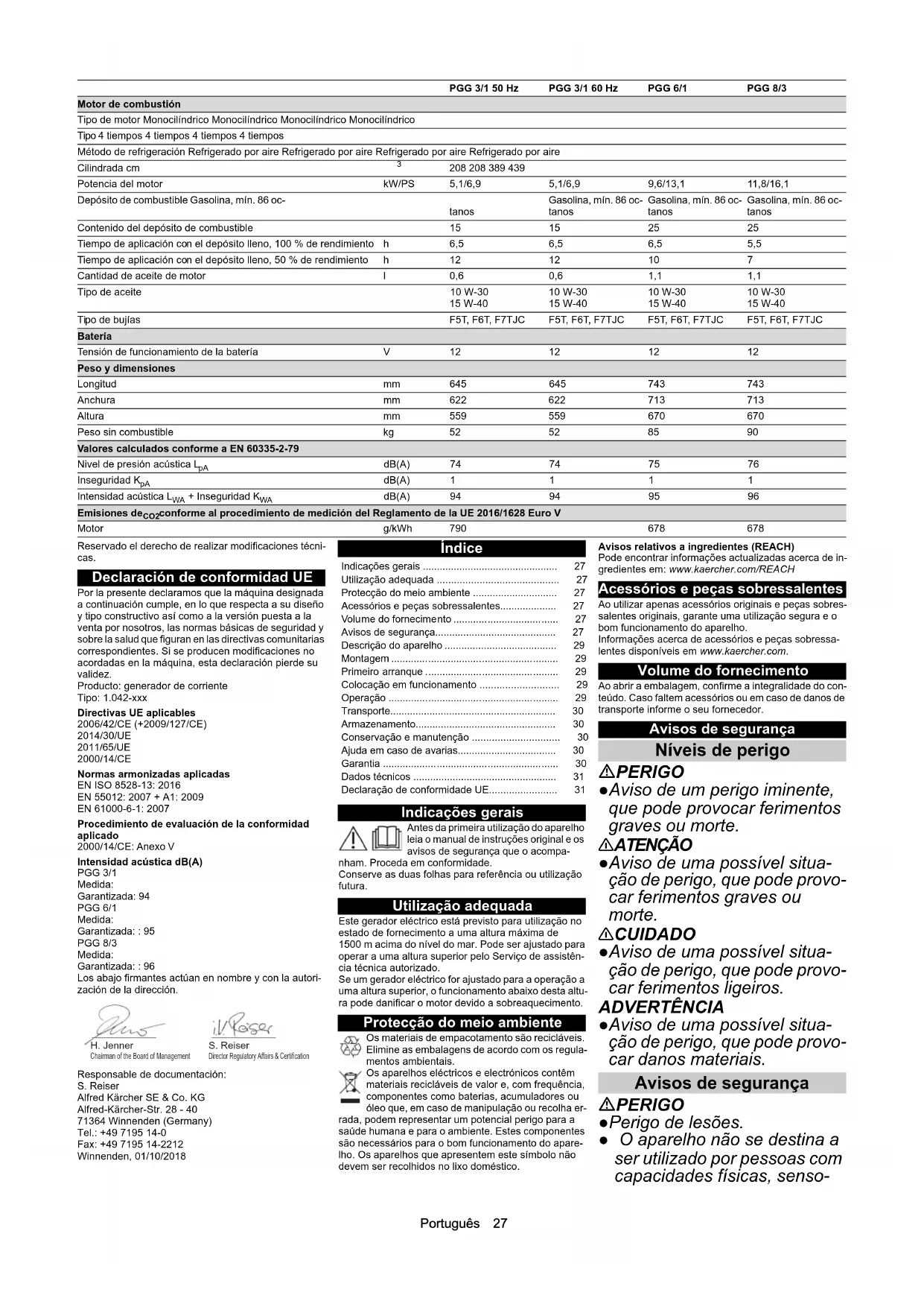 EN 55012: 2007 + A1: 2009 EN 61000-6-1: 2007 Procedimiento de evaluación de la conformidad aplicado 2000/14/CE: Anexo V Intensidad acústica dB(A) PGG 3/1 Medida: Garantizada: 94 PGG 6/1 Medida: Garantizada: : 95 PGG 8/3 Medida: Garantizada: : 96 Los abajo firmantes actúan en nombre y con la autori- zación de la dirección. Responsable de documentación: S. Reiser Alfred Kärcher SE & Co. KG Alfred-Kärcher-Str. 28 - 40 71364 Winnenden (Germany) Tel.: +49 7195 14-0 Fax: +49 7195 14-2212 Winnenden, 01/10/2018 Índice Indicações gerais Antes da primeira utilização do aparelho leia o manual de instruções original e os avisos de segurança que o acompa- nham. Proceda em conformidade. Conserve as duas folhas para referência ou utilização futura. Utilização adequada Este gerador eléctrico está previsto para utilização no estado de fornecimento a uma altura máxima de 1500 m acima do nível do mar. Pode ser ajustado para operar a uma altura superior pelo Serviço de assistên- cia técnica autorizado. Se um gerador eléctrico for ajustado para a operação a uma altura superior, o funcionamento abaixo desta altu- ra pode danificar o motor devido a sobreaquecimento. Protecção do meio ambiente Os materiais de empacotamento são recicláveis. Elimine as embalagens de acordo com os regula- mentos ambientais. Os aparelhos eléctricos e electrónicos contêm materiais recicláveis de valor e, com frequência, componentes como baterias, acumuladores ou óleo que, em caso de manipulação ou recolha er- rada, podem representar um potencial perigo para a saúde humana e para o ambiente. Estes componentes são necessários para o bom funcionamento do apare- lho. Os aparelhos que apresentem este símbolo não devem ser recolhidos no lixo doméstico. Avisos relativos a ingredientes (REACH) Pode encontrar informações actualizadas acerca de in- gredientes em: www.kaercher.com/REACH Acessórios e peças sobressalentes Ao utilizar apenas acessórios originais e peças sobres- salentes originais, garante uma utilização segura e o bom funcionamento do aparelho. Informações acerca de acessórios e peças sobressa- lentes disponíveis em www.kaercher.com. Volume do fornecimento Ao abrir a embalagem, confirme a integralidade do con- teúdo. Caso faltem acessórios ou em caso de danos de transporte informe o seu fornecedor. Avisos de segurança Níveis de perigo PERIGO ●Aviso de um perigo iminente, que pode provocar ferimentos graves ou morte. 몇 ATENÇÃO ●Aviso de uma possível situa- ção de perigo, que pode provo- car ferimentos graves ou morte. 몇 CUIDADO ●Aviso de uma possível situa- ção de perigo, que pode provo- car ferimentos ligeiros. ADVERTÊNCIA ●Aviso de uma possível situa- ção de perigo, que pode provo- car danos materiais. Avisos de segurança PERIGO ●Perigo de lesões. ● O aparelho não se destina a ser utilizado por pessoas com capacidades físicas, senso- Motor de combustión Tipo de motor Monocilíndrico Monocilíndrico Monocilíndrico Monocilíndrico Tipo 4 tiempos 4 tiempos 4 tiempos 4 tiempos Método de refrigeración Refrigerado por aire Refrigerado por aire Refrigerado por aire Refrigerado por aire Cilindrada cm