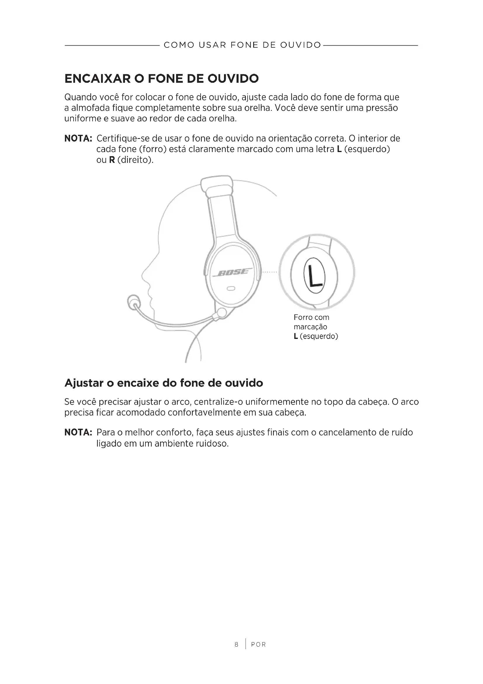 Quando você for colocar o fone de ouvido, ajuste cada lado do fone de forma que a almofada fique completamente sobre sua orelha. Você deve sentir uma pressão uniforme e suave ao redor de cada orelha. NOTA: Certifique-se de usar o fone de ouvido na orientação correta. O interior de cada fone (forro) está claramente marcado com uma letra L (esquerdo) ouR(direito). Forro com marcação L(esquerdo) Ajustar o encaixe do fone de ouvido Se você precisar ajustar o arco, centralize-o uniformemente no topo da cabeça. O arco precisa ficar acomodado confortavelmente em sua cabeça. NOTA: Para o melhor conforto, faça seus ajustes finais com o cancelamento de ruído ligado em um ambiente ruidoso.9