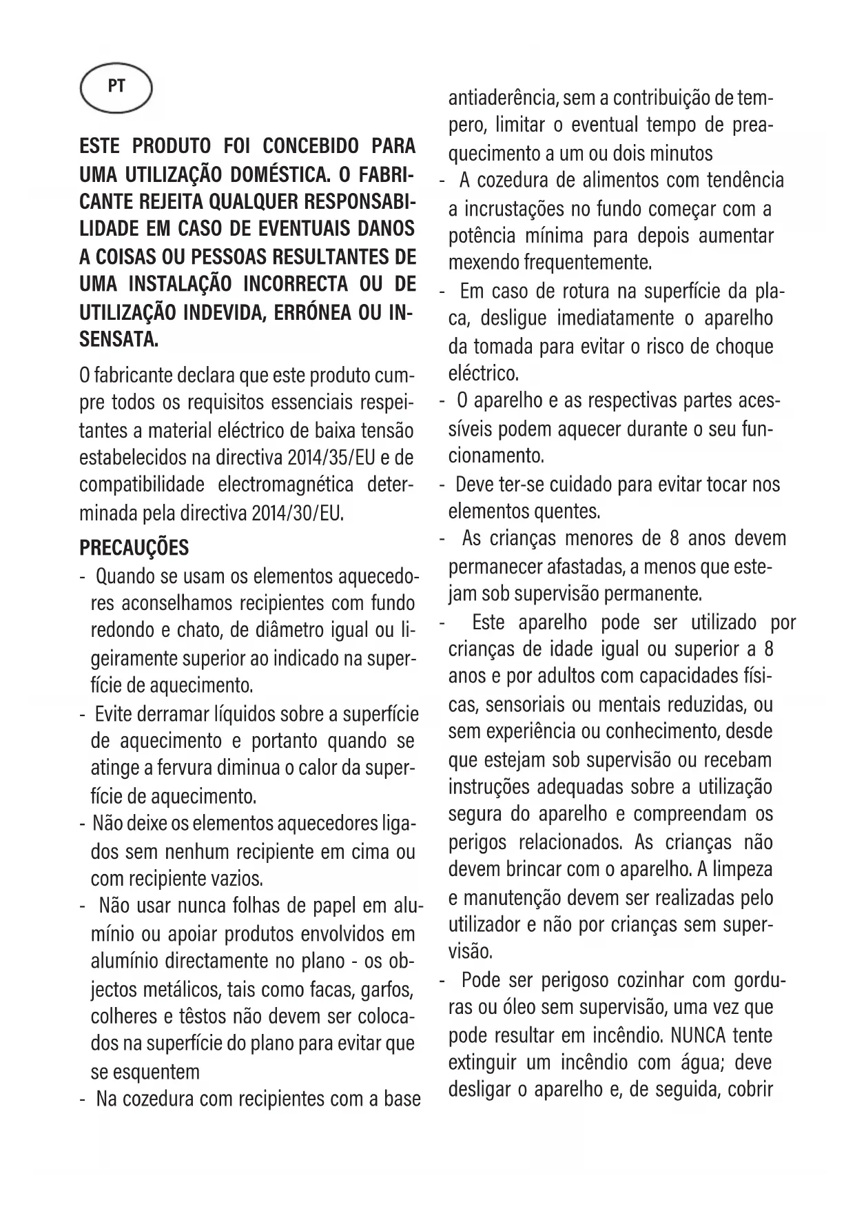 Quando se usam os elementos aquecedo- res aconselhamos recipientes com fundo redondo e chato, de diâmetro igual ou li- geiramente superior ao indicado na super- fície de aquecimento. - Evite derramar líquidos sobre a superfície de aquecimento e portanto quando se atinge a fervura diminua o calor da super- fície de aquecimento. - Não deixe os elementos aquecedores liga- dos sem nenhum recipiente em cima ou com recipiente vazios. - Não usar nunca folhas de papel em alu- mínio ou apoiar produtos envolvidos em alumínio directamente no plano - os ob- jectos metálicos, tais como facas, garfos, colheres e têstos não devem ser coloca- dos na superfície do plano para evitar que se esquentem - Na cozedura com recipientes com a base antiaderência, sem a contribuição de tem- pero, limitar o eventual tempo de prea- quecimento a um ou dois minutos - A cozedura de alimentos com tendência a incrustações no fundo começar com a potência mínima para depois aumentar mexendo frequentemente. - Em caso de rotura na superfície da pla- ca, desligue imediatamente o aparelho da tomada para evitar o risco de choque eléctrico. - O aparelho e as respectivas partes aces- síveis podem aquecer durante o seu fun- cionamento. - Deve ter-se cuidado para evitar tocar nos elementos quentes. - As crianças menores de 8 anos devem permanecer afastadas, a menos que este- jam sob supervisão permanente. - Este aparelho pode ser utilizado por crianças de idade igual ou superior a 8 anos e por adultos com capacidades físi- cas, sensoriais ou mentais reduzidas, ou sem experiência ou conhecimento, desde que estejam sob supervisão ou recebam instruções adequadas sobre a utilização segura do aparelho e compreendam os perigos relacionados. As crianças não devem brincar com o aparelho. A limpeza e manutenção devem ser realizadas pelo utilizador e não por crianças sem super- visão. - Pode ser perigoso cozinhar com gordu- ras ou óleo sem supervisão, uma vez que pode resultar em incêndio. NUNCA tente extinguir um incêndio com água; deve desligar o aparelho e, de seguida, cobrir PTas chamas, por exemplo, com uma tampa ou um cobertor de incêndio. - O processo de cozimento deve ser super- visionado. Um processo de cozimento de curta duração deve ser supervisionado continuadamente. - Um cozimento descuidado com gordura ou óleo pode ser perigoso e pode causar um incêndio.