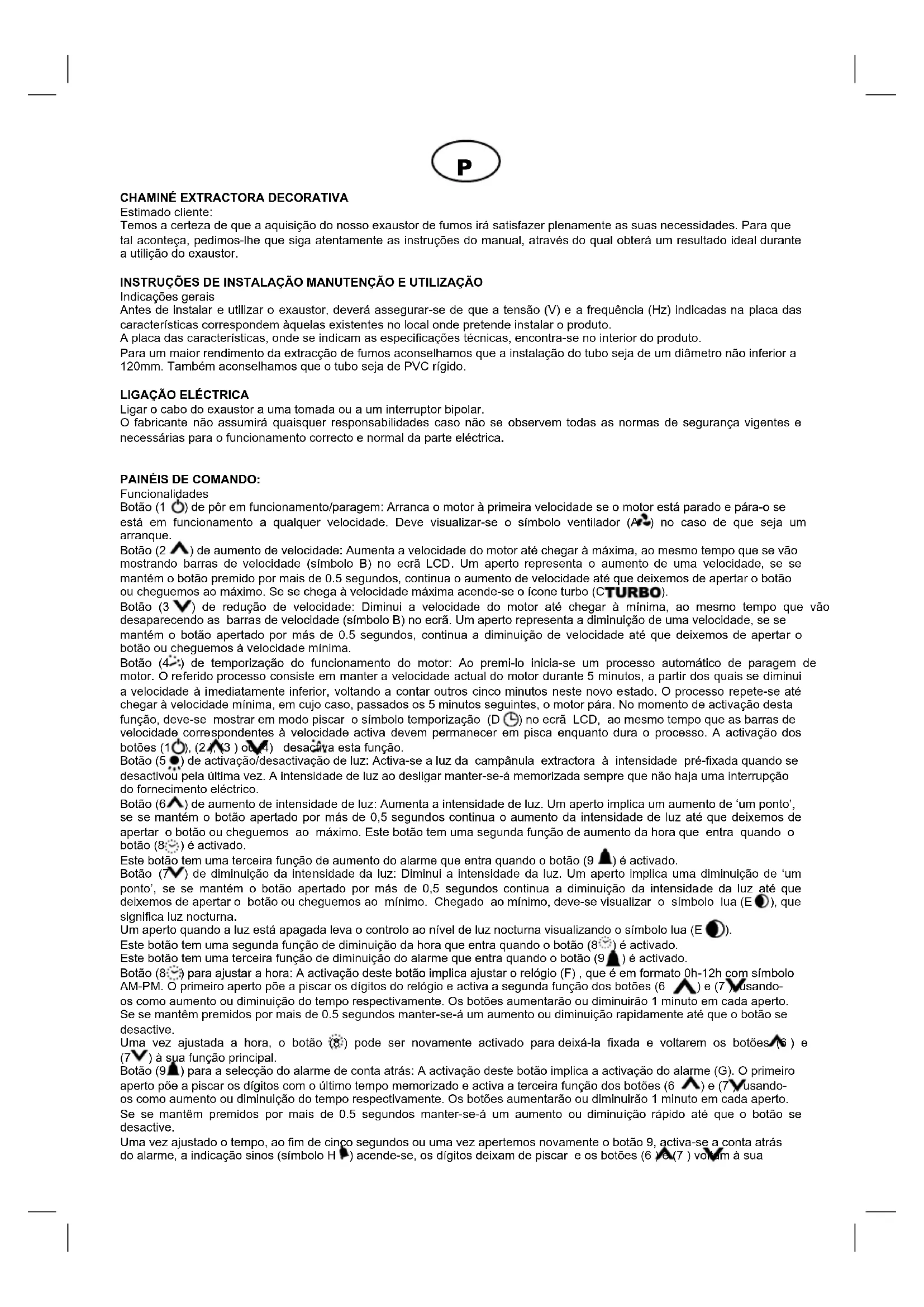 ) à sua função principal. Botão (9 ) para a selecção do alarme de conta atrás: A activação deste botão implica a activação do alarme (G). O primeiro aperto põe a piscar os dígitos com o último tempo memorizado e activa a terceira função dos botões (6 ) e (7 ), usando- os como aumento ou diminuição do tempo respectivamente. Os botões aumentarão ou diminuirão 1 minuto em cada aperto. Se se mantêm premidos por mais de 0.5 segundos manter-se-á um aumento ou diminuição rápido até que o botão se desactive. Uma vez ajustado o tempo, ao fim de cinco segundos ou uma vez apertemos novamente o botão 9, activa-se a conta atrás do alarme, a indicação sinos (símbolo H ) acende-se, os dígitos deixam de piscar e os botões (6 ) e (7 ) voltam à sua Pfunção principal. Esgotado o tempo de desconto, para indicar o fim da contagem, um zumbidor é activado de maneira intermitente, desactivando-se um minuto depois ou premindo o botão 9. MANUTENÇÃO - Limpeza. Antes de efectuar qualquer operação, assegure-se sempre de que o cabo da alimentação de corrente não está ligado e de que o interruptor se encontra na posição de apagar. Limpar a zona exterior com um detergente líquido não corrosivo e evitar o uso de produtos de limpeza abrasivos. - Mudança da lâmpada. Antes de substituir a lâmpada assegure-se de que o exaustor não está ligado. Retire o filtro de gordura e mude a lâmpada por uma nova de potência igual à indicada nas Características Técnicas. Volte a colocar o filtro no local indicado. - Limpeza do filtro de gordura Como consequência da utilização, os filtros terão de ser desmontados e lavados uma vez ao mês, como mínimo, na máquina de lavar loiça ou à mão, com água quente e detergente. Se usar a máquina de lavar loiça, recomenda-se que coloque os filtros na posição vertical de modo a evitar que os restos de comida se depositem sobre os mesmos. Depois de os ter enxaguado e secado, coloque-os novamente no seu sítio, realizando de forma inversa o procedimento usado para a desmontagem. Os filtros de carvão activo devem ser substituídos periodicamente para o seu funcionamento correcto, pelo menos de três em três meses (segundo a frequência de utilização da campanha). AVISO IMPORTANTE PARA CHAMINÉS COM LÂMPADAS HALOGÉNICAS Caso substitua as lâmpadas halogénicas, deverá fazê-lo por lâmpadas com reflector de alumínio, e nunca por lâmpadas dicróicas, de maneira a evitar um sobreaquecimento no suporte da lâmpada. IMPORTANTE: