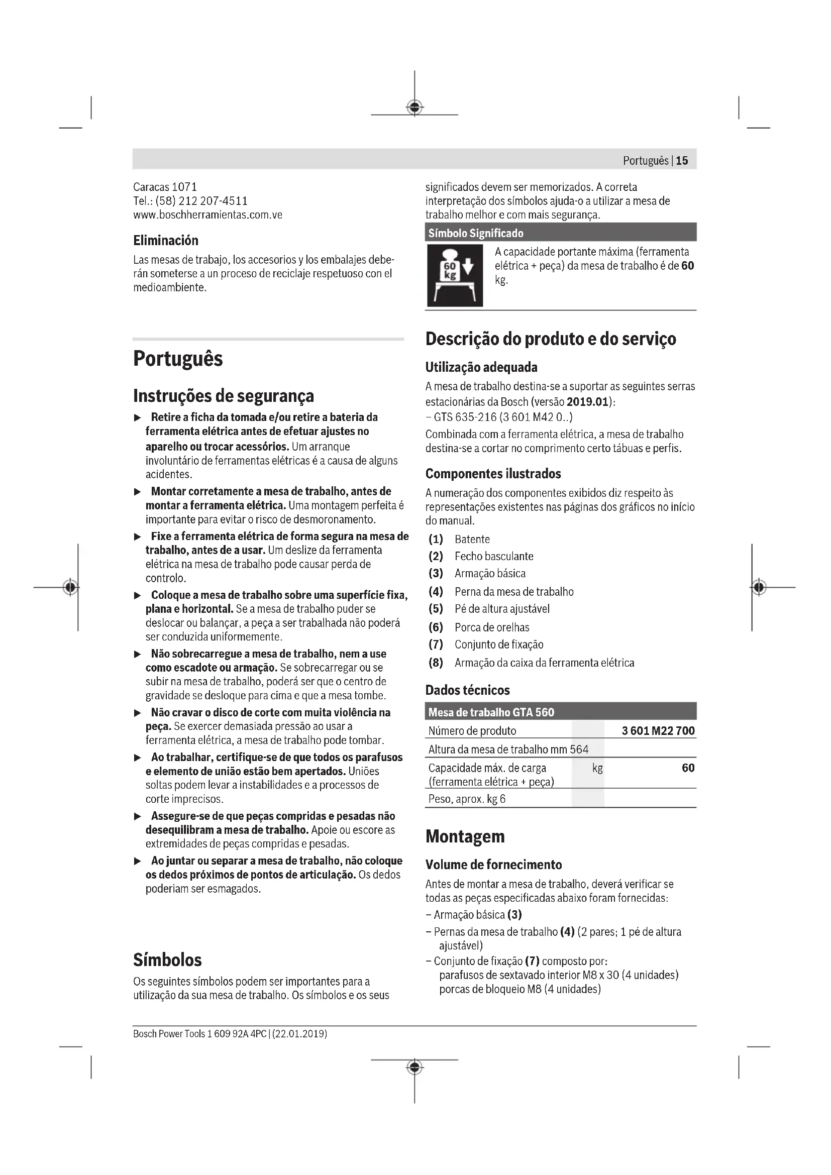 Peso, aprox. kg 6 Montagem Volume de fornecimento Antes de montar a mesa de trabalho, deverá verificar se todas as peças especificadas abaixo foram fornecidas: – Armação básica (3) – Pernas da mesa de trabalho (4) (2 pares; 1 pé de altura ajustável) – Conjunto de fixação (7) composto por: parafusos de sextavado interior M8 x 30 (4 unidades) porcas de bloqueio M8 (4 unidades) Bosch Power Tools 1 609 92A 4PC | (22.01.2019)16 | Italiano Ferramentas necessárias além das fornecidas: – Chave sextavada interior (5 mm) – Chave de parafusos (13 mm) Montar mesa de trabalho (ver figuras A1 − A2) – Retire todas as peças fornecidas cuidadosamente das respetivas embalagens. – Remova todo o material de embalagem. – Abra os fechos basculantes (2) e abra a armação básica (3). – Insira as pernas da mesa de trabalho (4) nos tubos quadrados da armação básica (3) até ficarem alinhados os orifícios de montagem. – Aparafuse as pernas da mesa de trabalho e a armação básica com os parafusos e as porcas do conjunto de fixação (7). Fixar a ferramenta elétrica (ver figuras B1 − B2) – Apoie a mesa de trabalho sobre uma superfície firme, plana e horizontal. O pé de altura ajustável (5) ajuda-o a alinhar a mesa de trabalho. Solte a porca de orelhas (6) e aperte ou desaperte o pé (5) até a mesa de trabalho estar alinhada de forma plana. Volte a apertar a porca de orelhas. – Centre a ferramenta elétrica na armação básica. Os batentes (1) servem para esse efeito. – Coloque os aros de ambos os fechos basculantes (2) sobre a armação básica (8) e pressione as alavancas dos fechos basculantes para baixo para os fixar. Funcionamento Instruções de trabalho Não sobrecarregue a mesa de trabalho. Observe sempre a capacidade portante máxima da mesa de trabalho. Segure sempre firmemente a peça a ser trabalhada, especialmente o pedaço mais longo e mais pesado. Após cortar a peça a ser trabalhada é possível que o centro de gravidade se desloque desfavoravelmente, de modo que a mesa de trabalho tombe. Transporte (ver figuras C1 − C3) u A ferramenta elétrica não pode estar montada na mesa de trabalho ao rebater ou abrir a mesma. Para o transporte é possível fechar a mesa de trabalho. – Abra os fechos basculantes (2) e retire a ferramenta elétrica. – Feche a mesa de trabalho. – Coloque os aros dos fechos basculantes (2) sobre o outro lado da armação básica (3) e pressione as alavancas dos fechos basculantes para baixo para os fixar. Manutenção e assistência técnica Serviço pós-venda e aconselhamento O serviço pós-venda responde às suas perguntas a respeito de serviços de reparação e de manutenção do seu produto, assim como das peças sobressalentes. Desenhos explodidos e informações acerca das peças sobressalentes também em: www.bosch-pt.com A nossa equipa de consultores Bosch esclarece com prazer todas as suas dúvidas a respeito dos nossos produtos e acessórios. Indique para todas as questões e encomendas de peças sobressalentes a referência de 10 dígitos de acordo com a placa de caraterísticas do produto. Portugal Robert Bosch LDA Avenida Infante D. Henrique Lotes 2E – 3E 1800 Lisboa Para efetuar o seu pedido online de peças entre na página www.ferramentasbosch.com. Tel.: 21 8500000 Fax: 21 8511096 Brasil Robert Bosch Ltda. – Divisão de Ferramentas Elétricas Caixa postal 1195 – CEP: 13065-900 Campinas – SP Tel.: 0800 7045 446 www.bosch.com.br/contato Eliminação As mesas de trabalho, acessórios e embalagens devem ser enviados a uma reciclagem ecológica de matéria-prima. Italiano Avvertenze di sicurezza u Estrarre la spina dalla presa di corrente e/o rimuovere la batteria dall’elettroutensile prima di effettuare re- golazioni sull’utensile o di sostituire elementi accesso- ri. L’accensione involontaria di elettroutensili è causa di possibili incidenti. u Prima di applicarvi l’elettroutensile, montare corretta- mente il banco da lavoro. Un montaggio corretto è indi- spensabile per impedire il rischio di un crollo. u Prima dell’utilizzo, fissare saldamente l’elettroutensi- le al banco da lavoro. Se l’elettroutensile scivola sul ban- co da lavoro si può avere una pericolosa perdita del con- trollo. u Posizionare il banco da lavoro su una superficie solida, piana e orizzontale. Se il banco da lavoro scivola o vibra 1 609 92A 4PC | (22.01.2019) Bosch Power ToolsItaliano | 17 non è possibile condurre in modo uniforme e sicuro il pez- zo in lavorazione. u Non sovraccaricare il banco da lavoro e non usarlo co- me scala o impalcatura. Il sovraccarico o la salita sul banco da lavoro può comportare lo spostamento verso l’alto del baricentro del banco da lavoro con conseguente ribaltamento dello stesso. u Non inserire a forza la lama nel pezzo in lavorazione. Se durante l’uso dell’elettroutensile viene esercitata trop- pa pressione, il banco da lavoro può ribaltarsi. u Accertarsi che durante la lavorazione tutte le viti e gli elementi di giunzione siano serrati correttamente. Eventuali collegamenti laschi possono causare instabilità e operazioni di taglio imprecise. u Assicurarsi che i pezzi in lavorazione lunghi e pesanti non sbilancino il banco da lavoro. I pezzi in lavorazione lunghi e pesanti devono essere supportati oppure appog- giati all’estremità libera. u Non avvicinare le dita ai punti di articolazione quando si chiude o si apre il banco da lavoro. Sussiste pericolo di schiacciamento per le dita. Simboli I seguenti simboli sono molto importanti per l’utilizzo del banco da lavoro. È importante conoscere bene i simboli e il rispettivo significato. Un’interpretazione corretta dei simboli contribuisce ad utilizzare meglio e in modo più sicuro il ban- co da lavoro. Simbolo Significato La portata massima (elettroutensile + pezzo in lavorazione) del banco da lavoro è di 60 kg. Descrizione del prodotto e dei servizi forniti Utilizzo conforme Il banco da lavoro è destinato ad 