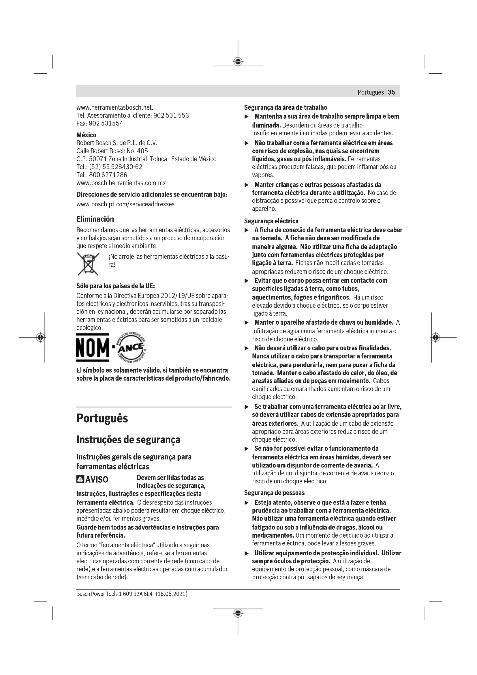 Tensão nominal V 36 36 36 Corrente nominal A 1,0 1,0 1,0 N.° de rotações em vazio r.p.m. 1000 1000 275 Máx. binário de aparafusamento duro/macio conforme ISO5393 Nm in-lbs 0,5 – 3,5 4,4 – 31,0 0,5 – 3,5 4,4 – 31,0 0,5 – 3,5 4,4 – 31,0 Sentido de rotação Anel de marcação cinzento cinzento cinzento Bosch Power Tools 1 609 92A 6L4 | (18.05.2021)38 | Português Aparafusadora reta elétrica com arranque por impulso C-EXACT4 C-EXACT4 C-EXACT4 Ø máximo do parafuso M 4 M 4 M 4 Peso conforme EPTA-Procedure 01:2014 kg lbs 0,87 1,4 0,87 1,4 0,87 1,4 Tipo de proteção IP20 IP20 IP20 Aparafusadora reta elétrica com arranque por impulso C-EXACT6 C-EXACT6 Número de produto