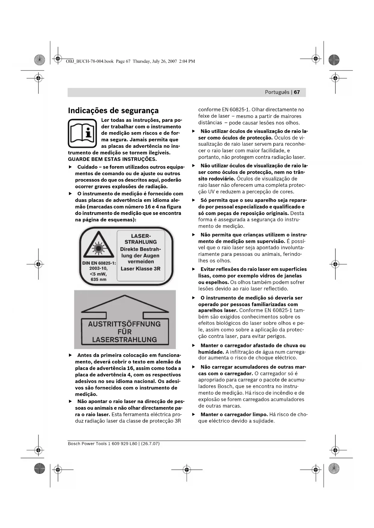 Indicações de segurança Ler todas as instruções, para po- der trabalhar com o instrumento de medição sem riscos e de for- ma segura. Jamais permita que as placas de advertência no ins- trumento de medição se tornem ilegíveis. GUARDE BEM ESTAS INSTRUÇÕES. f Cuidado – se forem utilizados outros equipa- mentos de comando ou de ajuste ou outros processos do que os descritos aqui, poderão ocorrer graves explosões de radiação. f O instrumento de medição é fornecido com duas placas de advertência em idioma ale- mão (marcadas com número 16 e 4 na figura do instrumento de medição que se encontra na página de esquemas): f Antes da primeira colocação em funciona- mento, deverá cobrir o texto em alemão da placa de advertência 16, assim como toda a placa de advertência 4, com os respectivos adesivos no seu idioma nacional. Os adesi- vos são fornecidos com o instrumento de medição. f Não apontar o raio laser na direcção de pes- soas ou animais e não olhar directamente pa- ra o raio laser. Esta ferramenta eléctrica pro- duz radiação laser da classe de protecção 3R conforme EN 60825-1. Olhar directamente no feixe de laser – mesmo a partir de mairores distâncias – pode causar lesões nos olhos. f Não utilizar óculos de visualização de raio la- ser como óculos de protecção. Óculos de vi- sualização de raio laser servem para reconhe- cer o raio laser com maior facilidade, e portanto, não protegem contra radiação laser. f Não utilizar óculos de visualização de raio la- ser como óculos de protecção, nem no trân- sito rodoviário. Óculos de visualização de raio laser não oferecem uma completa protec- ção UV e reduzem a percepção de cores. f Só permita que o seu aparelho seja repara- do por pessoal especializado e qualificado e só com peças de reposição originais. Desta forma é assegurada a segurança do instru- mento de medição. f Não permita que crianças utilizem o instru- mento de medição sem supervisão. É possí- vel que o raio laser seja apontado involunta- riamente para pessoas ou animais, ferindo- lhes os olhos. f Evitar reflexões do raio laser em superfícies lisas, como por exemplo vidros de janelas ou espelhos. Os olhos também podem sofrer lesões devido ao raio laser reflectido. f O instrumento de medição só deveria ser operado por pessoas familiarizadas com aparelhos laser. Conforme EN 60825-1 tam- bém são exigidos conhecimentos sobre os efeitos biológicos do laser sobre olhos e pe- le, assim como sobre a aplicação da protec- ção contra laser, para evitar perigos. f Manter o carregador afastado de chuva ou humidade. A infiltração de água num carrega- dor aumenta o risco de choque eléctrico. f Não carregar acumuladores de outras mar- cas com o carregador. O carregador só é apropriado para carregar o pacote de acumu- ladores Bosch, que se encontra no instru- mento de medição. Há risco de incêndio e de explosão se forem carregados acumuladores de outras marcas. f Manter o carregador limpo. Há risco de cho- que eléctrico devido a sujidade. DIN EN 60825-1:2003-10, <5 mW, 635 nm LASER- STRAHLUNG Direkte Bestrah- lung der Augen vermeiden Laser Klasse 3R AUSTRITTSÖFFNUNG FÜR LASERSTRAHLUNG OBJ_BUCH-78-004.book Page 67 Thursday, July 26, 2007 2:04 PM68 | Português 1 609 929 L80 | (26.7.07) Bosch Power Tools f Antes de cada utilização é necessário verifi- car o carregador, o cabo e a ficha. Não utili- zar o carregador se forem verificados da- nos. Não abrir pessoalmente o carregador e só permita que seja reparado por pessoal qualificado e que só sejam utilizadas peças sobressalentes originais. Carregadores, ca- bos e fichas danificados aumentam o risco de um choque eléctrico. f Não operar o carregador sobre uma base fa- cilmente inflamável (p.ex. papel, tecidos etc.) ou em ambiente combustível. Há peri- go de incêndio devido ao aquecimento do carregador durante o carregamento. f No caso de aplicação incorrecta pode vazar líquido do acumulador. Evitar o contacto. No caso de um contacto acidental, deverá enxaguar com água. Se o líquido entrar em contacto com os olhos, também deverá con- sultar um médico. Líquido que escapa do acumulador pode levar a irritações da pele ou a queimaduras. Descrição de funções Abrir a página basculante contendo a apresenta- ção do instrumento de medição, e deixar esta página aberta enquanto estiver lendo a instru- ção de serviço. Utilização conforme as disposições O instrumento de medição é destinado para ave- riguar e controlar o perfeito decurso horizontal de alturas, linhas verticais, alinhamentos e pon- tos de prumo em áreas interiores e exteriores. Componentes ilustrados A numeração dos componentes ilustrados refe- re-se à apresentação do instrumento de medi- ção na página de esquemas. 1 Nível de bolha 2 Lente de recepção para telecomando 3 Tomada para ficha do carregador 4 Placa de advertência, abertura para saída do raio laser 5 Abertura para saída do raio laser 6 Marcação do eixo Y 7 Marcação do eixo X 8 Raio de prumo 9 Rario laser variável 10 Entalhes de prumo do eixo X 11 Entalhes de prumo do eixo Y 12 Travamento da tampa do compartimento da pilha 13 Tampa do compartimento da pilha 14 Pé de borracha 15 Pacote de acumuladores 16 Placa de advertência laser 17 Admissão do tripé 5/8" (horizontal e vertical) 18 Número de série 19 Botão para o funcionamento por linha e selecção do comprimento da linha 20 Botão de direcção “para cima” 21 Botão de direcção esquerdo 22 Botão para o funcionamento em rotação e selecção da velocidade de rotação 23 Botão de direcção “para baixo” 24 Botão de direcção direito 25 Indicação de nivelamento manual “man” 26 Indicação de nivelamento automático “auto” 27 Indicação do estado de carga da pilha 28 Botão “man/auto” para desligar o nivela- mento automático 29 Tecla de ligar e desligar 30 Régua de mediç
