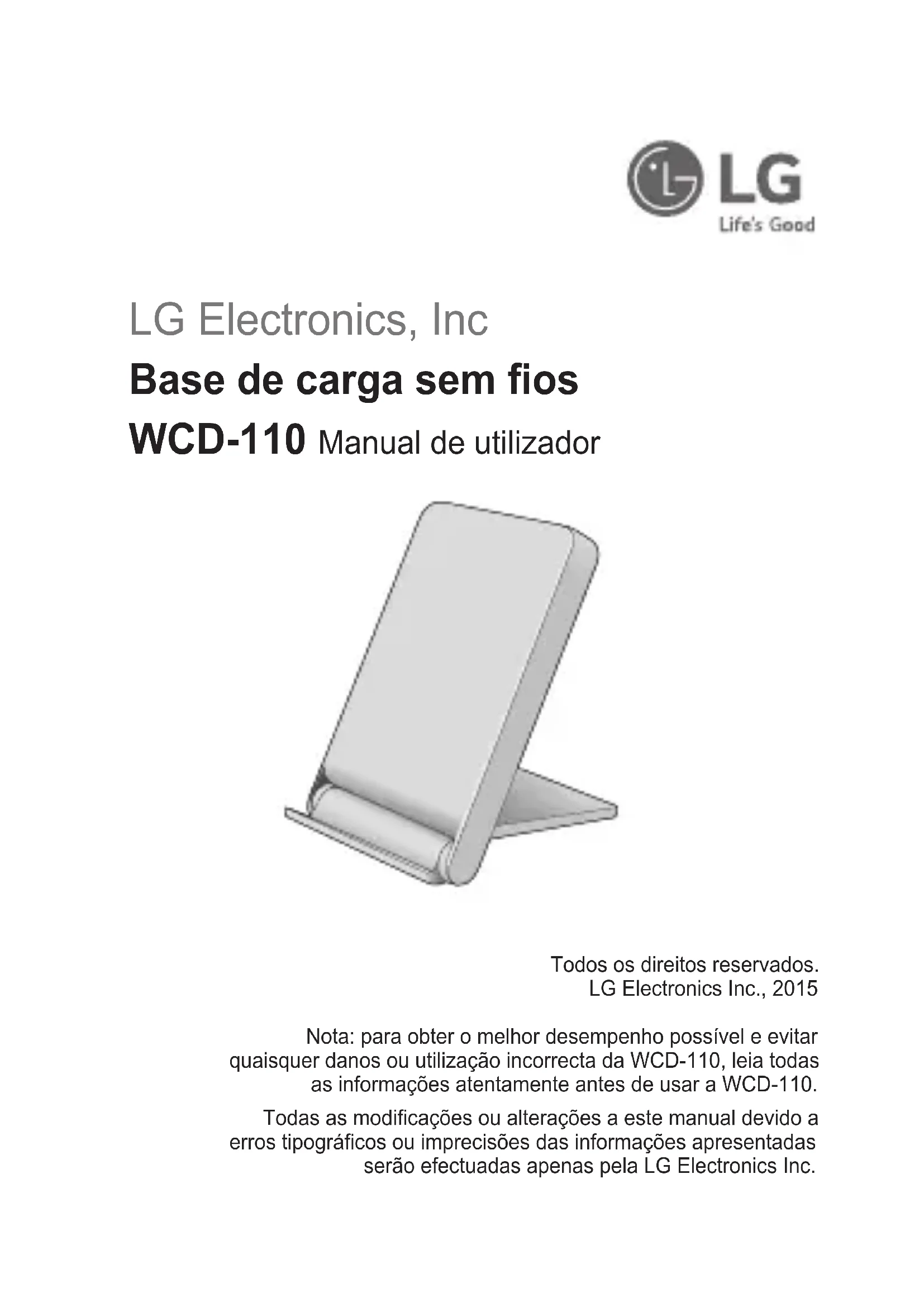 Instruções de segurança Eliminação do seu equipamento antigo 1 Todos os produtos eléctricos e electrónicos devem ser eliminados em separado e não juntamente com os resíduos municipais, através de infra-estruturas de recolha selectiva, definidas pelas autoridades estatais ou locais. 2 A eliminação correcta do seu equipamento antigo ajuda a prevenir potenciais efeitos negativos sobre o ambiente e sobre a saúde humana. 3 Para informações mais detalhadas acerca da eliminação do seu dispositivo usado, contacte as autoridades locais, os serviços de recolha de lixo ou a loja onde adquiriu o produto. Eliminação de baterias/acumuladores usados 1 Este símbolo pode estar acompanhado dos símbolos químicos do mercúrio (Hg), cádmio (Cd) ou chumbo (Pb) se a bateria contiver mais do que 0,0005% de mercúrio, 0,002% de cádmio ou 0,004% de chumbo. 2 Todas as baterias/acumuladores devem ser eliminados em separado e não juntamente com os resíduos municipais, através de infra-estruturas de recolha selectiva, definidas pelas autoridades estatais ou locais. 3 A eliminação adequada das baterias/acumuladores antigos ajuda a prevenir potenciais efeitos negativos sobre o ambiente e a saúde humana e dos animais. 4 Para informações mais detalhadas acerca da eliminação de baterias/ acumuladores usados, contacte as autoridades locais, os serviços de recolha de lixo ou a loja onde adquiriu o produto.LG Electronics, Inc Βάση ασύρματης φόρτισης WCD-110 Εγχειρίδιο χρήσης Με την επιφύλαξη παντός δικαιώματος. LG Electronics Inc., 2015 Σημείωση: Για βέλτιστη απόδοση και για να αποφευχθούν τυχόν ζημιές, ή κακή χρήση της συσκευής WCD-110, διαβάστε προσεκτικά όλες τις πληροφορίες, πριν να χρησιμοποιήσετε το WCD-110. Τυχόν τροποποιήσεις ή αλλαγές στον παρόν εγχειρίδιο λόγω τυπογραφικών λαθών ή ανακριβειών στις αναφερόμενες πληροφορίες, πραγματοποιούνται μόνο από την LG Electronics Inc.ΕΛΛ