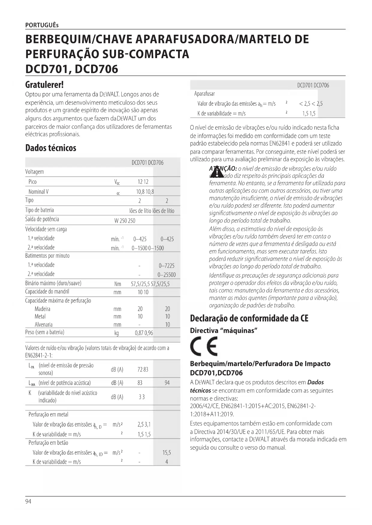 - Ved boring av dype hull, dersom hammer-hastigheten synker, trekk bit-en delvis ut av hullet med verktøyet fortsatt i gang for å hjelpe til med å fjerne spon frahullet.94 PORTUGUês Declaração de conformidade da CE Directiva “máquinas” Berbequim/martelo/Perfuradora De Impacto DCD701, DCD706 A DeWALT declara que os produtos descritos em Dados técnicos se encontram em conformidade com as seguintes normas e directivas: 2006/42/CE, EN62841-1:2015+AC:2015, EN62841-2- 1:2018+A11:2019. Estes equipamentos também estão em conformidade com a Directiva 2014/30/UE e a 2011/65/UE. Para obter mais informações, contacte a DeWALT através da morada indicada em seguida ou consulte o verso domanual. O nível de emissão de vibrações e/ou ruído indicado nesta ficha de informações foi medido em conformidade com um teste padrão estabelecido pela normas EN62841 e poderá ser utilizado para comparar ferramentas. Por conseguinte, este nível poderá ser utilizado para uma avaliação preliminar da exposição àsvibrações.