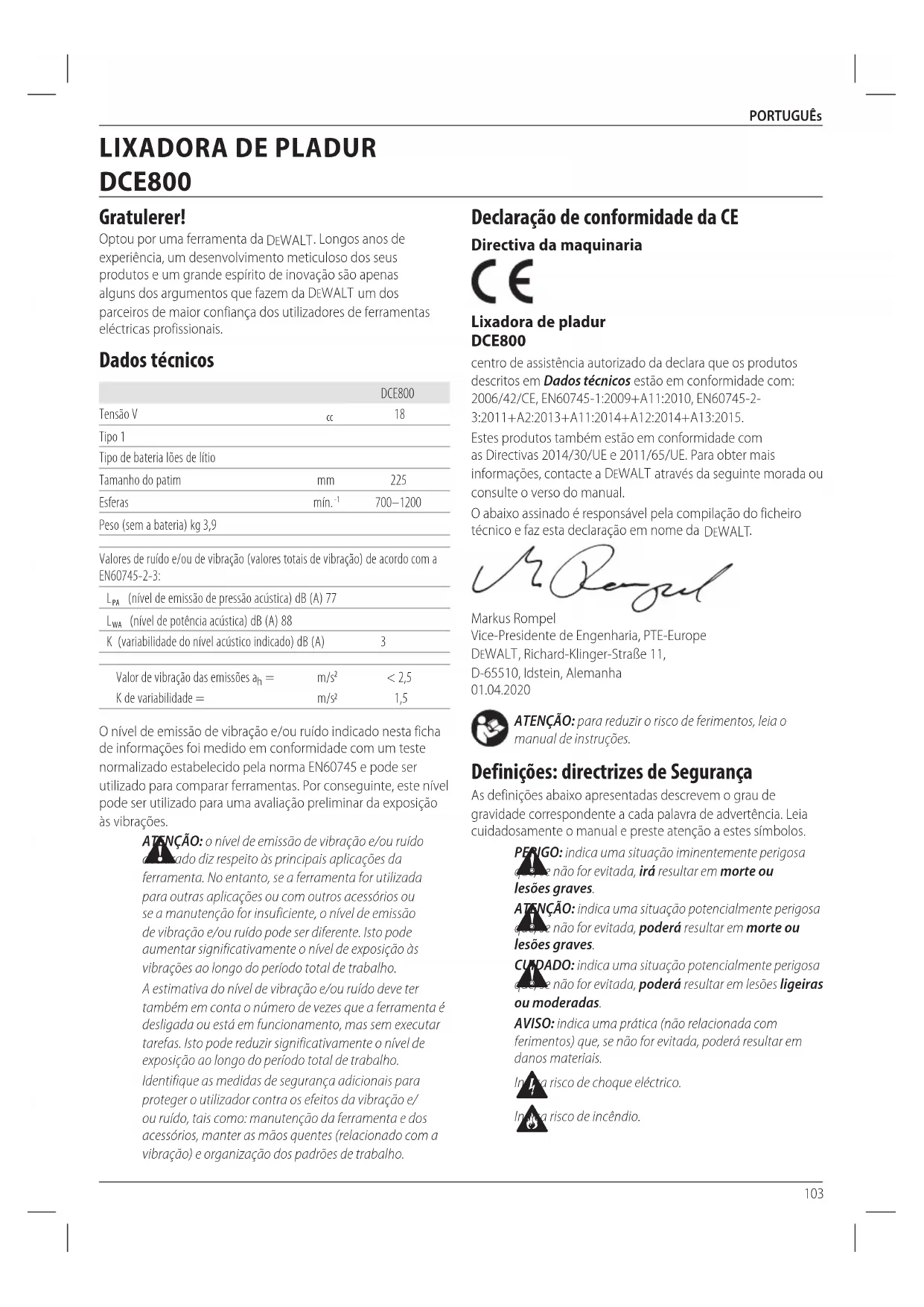Indica risco deincêndio. Declaração de conformidade da CE Directiva da maquinaria Lixadora de pladur DCE800 centro de assistência autorizado da declara que os produtos descritos em Dados técnicos estão em conformidade com: 2006/42/CE, EN60745-1:2009+A11:2010, EN60745-2- 3:2011+A2:2013+A11:2014+A12:2014+A13:2015. Estes produtos também estão em conformidade com as Directivas 2014/30/UE e 2011/65/UE. Para obter mais informações, contacte a DeWALT através da seguinte morada ou consulte o verso domanual. O abaixo assinado é responsável pela compilação do ficheiro técnico e faz esta declaração em nome da DeWALT