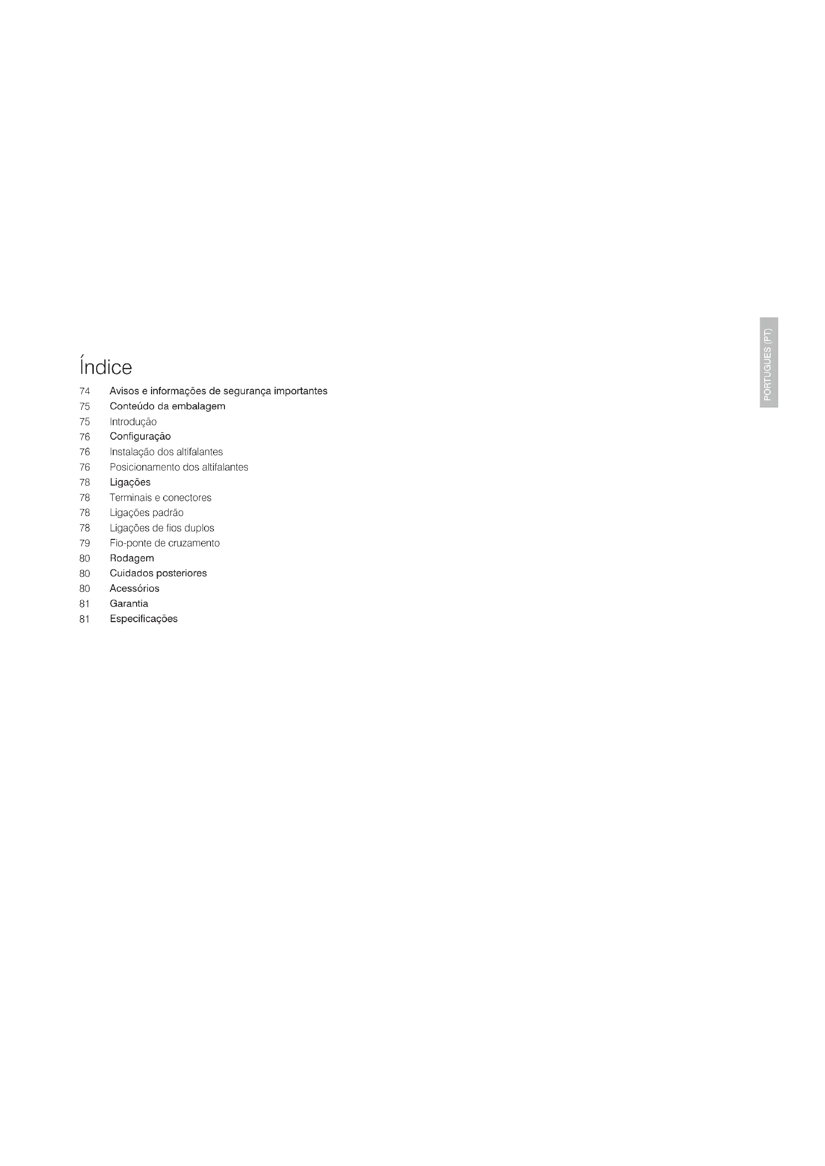 PORTUGUES (PT) Avisos e informações de segurança importantes Conteúdo da embalagem Introdução Conguração Instalação dos altifalantes Posicionamento dos altifalantes Ligações Terminais e conectores Ligações padrão Ligações de os duplos Fio-ponte de cruzamento Rodagem Cuidados posteriores Acessórios Garantia Especicações Índice
