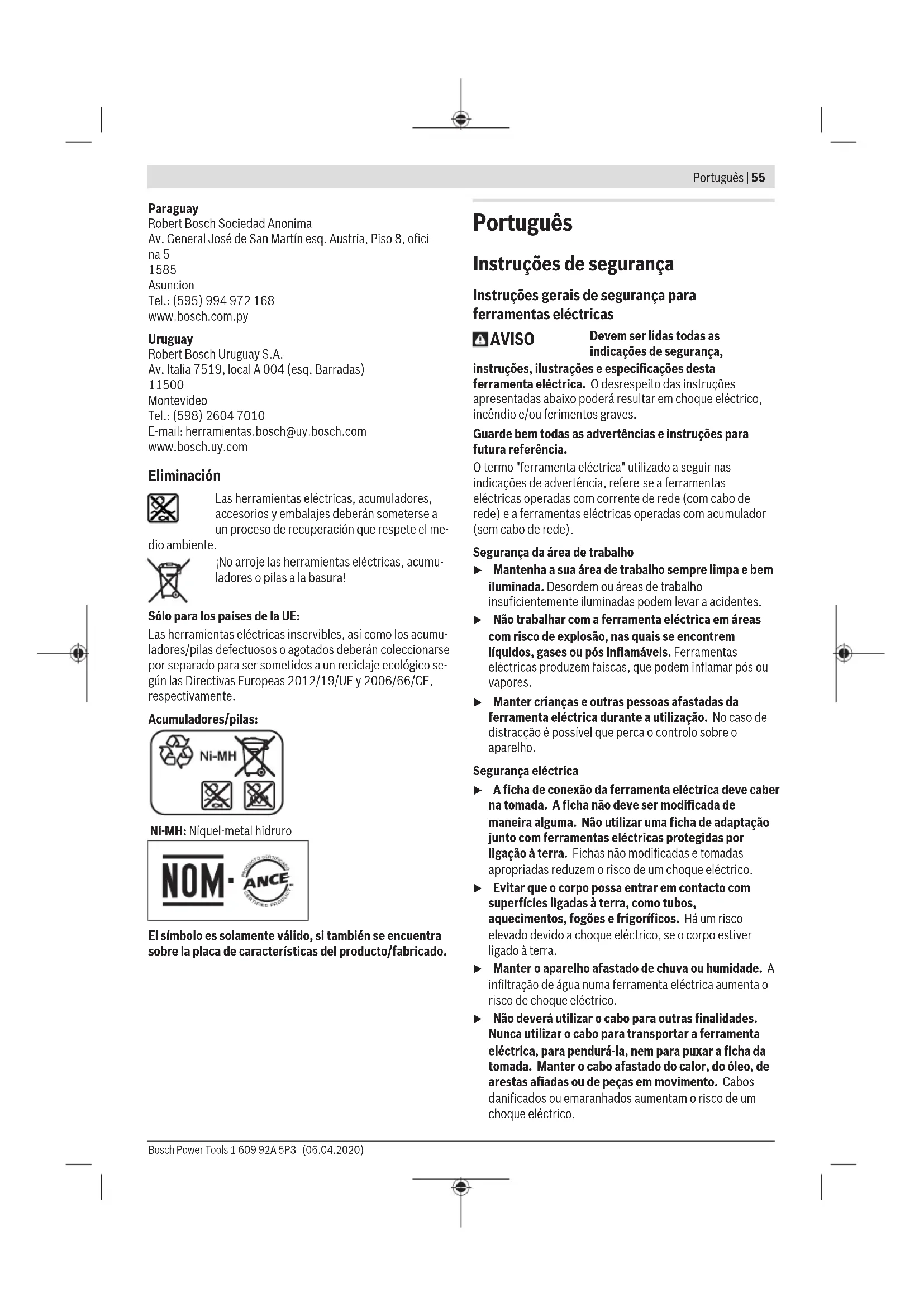 Montevideo Tel.: (598) 2604 7010 E-mail: herramientas.bosch@uy.bosch.com www.bosch.uy.com Eliminación Las herramientas eléctricas, acumuladores, accesorios y embalajes deberán someterse a un proceso de recuperación que respete el me- dio ambiente. ¡No arroje las herramientas eléctricas, acumu- ladores o pilas a la basura! Sólo para los países de laUE: Las herramientas eléctricas inservibles, así como los acumu- ladores/pilas defectuosos o agotados deberán coleccionarse por separado para ser sometidos a un reciclaje ecológico se- gún las Directivas Europeas 2012/19/UE y 2006/66/CE, respectivamente. Acumuladores/pilas: Ni-MH: Níquel-metal hidruro El símbolo es solamente válido, si también se encuentra sobre la placa de características del producto/fabricado. Português Instruções de segurança Instruções gerais de segurança para ferramentas eléctricas AVISO Devem ser lidas todas as indicações de segurança, instruções, ilustrações e especificações desta ferramenta eléctrica. O desrespeito das instruções apresentadas abaixo poderá resultar em choque eléctrico, incêndio e/ou ferimentos graves. Guarde bem todas as advertências e instruções para futura referência. O termo "ferramenta eléctrica" utilizado a seguir nas indicações de advertência, refere‑se a ferramentas eléctricas operadas com corrente de rede (com cabo de rede) e a ferramentas eléctricas operadas com acumulador (sem cabo de rede). Segurança da área de trabalho u Mantenha a sua área de trabalho sempre limpa e bem iluminada. Desordem ou áreas de trabalho insuficientemente iluminadas podem levar a acidentes. u Não trabalhar com a ferramenta eléctrica em áreas com risco de explosão, nas quais se encontrem líquidos, gases ou pós inflamáveis. Ferramentas eléctricas produzem faíscas, que podem inflamar pós ou vapores. u Manter crianças e outras pessoas afastadas da ferramenta eléctrica durante a utilização. No caso de distracção é possível que perca o controlo sobre o aparelho. Segurança eléctrica u A ficha de conexão da ferramenta eléctrica deve caber na tomada. A ficha não deve ser modificada de maneira alguma. Não utilizar uma ficha de adaptação junto com ferramentas eléctricas protegidas por ligação à terra. Fichas não modificadas e tomadas apropriadas reduzem o risco de um choque eléctrico. u Evitar que o corpo possa entrar em contacto com superfícies ligadas à terra, como tubos, aquecimentos, fogões e frigoríficos. Há um risco elevado devido a choque eléctrico, se o corpo estiver ligado à terra. u Manter o aparelho afastado de chuva ou humidade. A infiltração de água numa ferramenta eléctrica aumenta o risco de choque eléctrico. u Não deverá utilizar o cabo para outras finalidades. Nunca utilizar o cabo para transportar a ferramenta eléctrica, para pendurá‑la, nem para puxar a ficha da tomada. Manter o cabo afastado do calor, do óleo, de arestas afiadas ou de peças em movimento. Cabos danificados ou emaranhados aumentam o risco de um choque eléctrico. Bosch Power Tools 1 609 92A 5P3 | (06.04.2020)56 | Português u Se trabalhar com uma ferramenta eléctrica ao ar livre, só deverá utilizar cabos de extensão apropriados para áreas exteriores. A utilização de um cabo de extensão apropriado para áreas exteriores reduz o risco de um choque eléctrico. u Se não for possível evitar o funcionamento da ferramenta eléctrica em áreas húmidas, deverá ser utilizado um disjuntor de corrente de avaria. A utilização de um disjuntor de corrente de avaria reduz o risco de um choque eléctrico. Segurança de pessoas u Esteja atento, observe o que está a fazer e tenha prudência ao trabalhar com a ferramenta eléctrica. Não utilizar uma ferramenta eléctrica quando estiver fatigado ou sob a influência de drogas, álcool ou medicamentos. Um momento de descuido ao utilizar a ferramenta eléctrica, pode levar a lesões graves. u Utilizar equipamento de protecção individual. Utilizar sempre óculos de protecção. A utilização de equipamento de protecção pessoal, como máscara de protecção contra pó, sapatos de segurança antiderrapantes, capacete de segurança ou protecção auricular, de acordo com o tipo e aplicação da ferramenta eléctrica, reduz o risco de lesões. u Evitar uma colocação em funcionamento involuntária. Assegure‑se de que a ferramenta eléctrica esteja desligada, antes de conectá‑la à alimentação de rede e/ou ao acumulador, antes de levantá‑la ou de transportá‑la. Se tiver o dedo no interruptor ao transportar a ferramenta eléctrica ou se o aparelho for conectado à alimentação de rede enquanto estiver ligado, poderão ocorrer acidentes. u Remover ferramentas de ajuste ou chaves de boca antes de ligar a ferramenta eléctrica. Uma ferramenta ou chave que se encontre numa parte do aparelho em movimento pode levar a lesões. u Evite uma posição anormal. Mantenha uma posição firme e mantenha sempre o equilíbrio. Desta forma é mais fácil controlar a ferramenta eléctrica em situações inesperadas. u Usar roupa apropriada. Não usar roupa larga nem jóias. Mantenha os cabelos e roupas afastados de peças em movimento. Roupas frouxas, cabelos longos ou jóias podem ser agarrados por peças em movimento. u Se for possível montar dispositivos de aspiração ou de recolha, assegure‑se de que estejam conectados e utilizados correctamente. A utilização de uma aspiração de pó pode reduzir o perigo devido ao pó. u Não deixe que a familiaridade resultante de uma utilização frequente de ferramentas permita que você se torne complacente e ignore os princípios de segurança da ferramenta. Uma acção descuidada pode causar ferimentos graves numa fracção de segundo. Utilização e manuseio cuidadoso de ferramentas eléctricas u Não sobrecarregue a ferramenta eléctrica. Utilize a ferramenta eléctrica apropriada para o seu trabalho. É melhor e mais seguro trabalhar com a fer