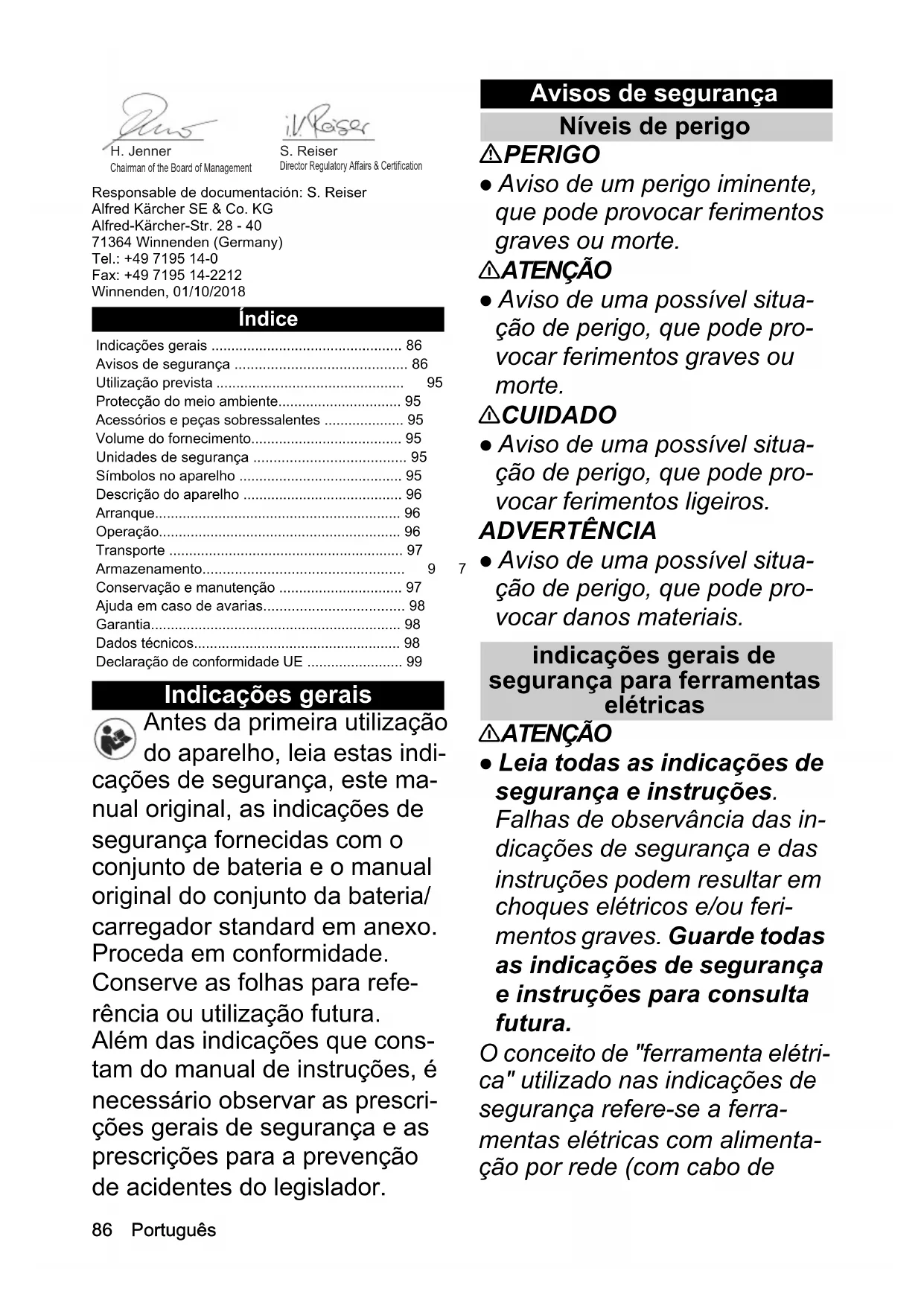 - Peso (sin batería) kg 4,386 Português Responsable de documentación: S. Reiser Alfred Kärcher SE & Co. KG Alfred-Kärcher-Str. 28 - 40 71364 Winnenden (Germany) Tel.: +49 7195 14-0 Fax: +49 7195 14-2212 Winnenden, 01/10/2018 Índice Indicações gerais Antes da primeira utilização do aparelho, leia estas indi- cações de segurança, este ma- nual original, as indicações de segurança fornecidas com o conjunto de bateria e o manual original do conjunto da bateria/ carregador standard em anexo. Proceda em conformidade. Conserve as folhas para refe- rência ou utilização futura. Além das indicações que cons- tam do manual de instruções, é necessário observar as prescri- ções gerais de segurança e as prescrições para a prevenção de acidentes do legislador. Avisos de segurança Níveis de perigo PERIGO ● Aviso de um perigo iminente, que pode provocar ferimentos graves ou morte. 몇 ATENÇÃO ● Aviso de uma possível situa- ção de perigo, que pode pro- vocar ferimentos graves ou morte. 몇 CUIDADO ● Aviso de uma possível situa- ção de perigo, que pode pro- vocar ferimentos ligeiros. ADVERTÊNCIA ● Aviso de uma possível situa- ção de perigo, que pode pro- vocar danos materiais. indicações gerais de segurança para ferramentas elétricas 몇 ATENÇÃO ● Leia todas as indicações de segurança e instruções. Falhas de observância das in- dicações de segurança e das instruções podem resultar em choques elétricos e/ou feri- mentos graves. Guarde todas as indicações de segurança e instruções para consulta futura. O conceito de "ferramenta elétri- ca" utilizado nas indicações de segurança refere-se a ferra- mentas elétricas com alimenta- ção por rede (com cabo de Indicações gerais p. 86