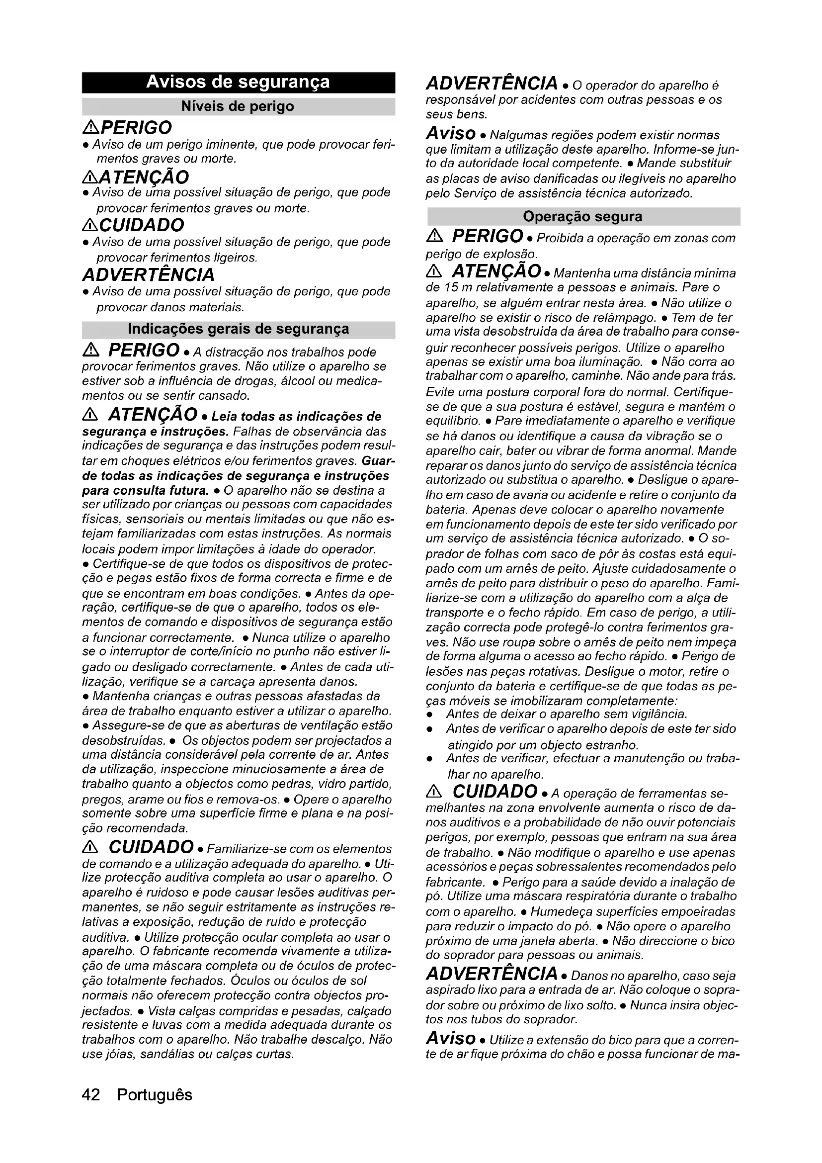 - Declaração de conformidade UE Chairman of the Board of ManagementDirector Regulatory Affairs & Certification H. Jenner S. Reiser42 Português Avisos de segurança Níveis de perigo PERIGO ● Aviso de um perigo iminente, que pode provocar feri- mentos graves ou morte. 몇 ATENÇÃO ● Aviso de uma possível situação de perigo, que pode provocar ferimentos graves ou morte. 몇 CUIDADO ● Aviso de uma possível situação de perigo, que pode provocar ferimentos ligeiros. ADVERTÊNCIA ● Aviso de uma possível situação de perigo, que pode provocar danos materiais. Indicações gerais de segurança PERIGO ● A distracção nos trabalhos pode provocar ferimentos graves. Não utilize o aparelho se estiver sob a influência de drogas, álcool ou medica- mentos ou se sentir cansado. 몇 ATENÇÃO ● Leia todas as indicações de segurança e instruções. Falhas de observância das indicações de segurança e das instruções podem resul- tar em choques elétricos e/ou ferimentos graves. Guar- de todas as indicações de segurança e instruções para consulta futura. ● O aparelho não se destina a ser utilizado por crianças ou pessoas com capacidades físicas, sensoriais ou mentais limitadas ou que não es- tejam familiarizadas com estas instruções. As normais locais podem impor limitações à idade do operador. ● Certifique-se de que todos os dispositivos de protec- ção e pegas estão fixos de forma correcta e firme e de que se encontram em boas condições. ● Antes da ope- ração, certifique-se de que o aparelho, todos os ele- mentos de comando e dispositivos de segurança estão a funcionar correctamente. ● Nunca utilize o aparelho se o interruptor de corte/início no punho não estiver li- gado ou desligado correctamente. ● Antes de cada uti- lização, verifique se a carcaça apresenta danos. ● Mantenha crianças e outras pessoas afastadas da área de trabalho enquanto estiver a utilizar o aparelho. ● Assegure-se de que as aberturas de ventilação estão desobstruídas. ● Os objectos podem ser projectados a uma distância considerável pela corrente de ar. Antes da utilização, inspeccione minuciosamente a área de trabalho quanto a objectos como pedras, vidro partido, pregos, arame ou fios e remova-os. ● Opere o aparelho somente sobre uma superfície firme e plana e na posi- ção recomendada. 몇 CUIDADO ● Familiarize-se com os elementos de comando e a utilização adequada do aparelho. ● Uti- lize protecção auditiva completa ao usar o aparelho. O aparelho é ruidoso e pode causar lesões auditivas per- manentes, se não seguir estritamente as instruções re- lativas a exposição, redução de ruído e protecção auditiva. ● Utilize protecção ocular completa ao usar o aparelho. O fabricante recomenda vivamente a utiliza- ção de uma máscara completa ou de óculos de protec- ção totalmente fechados. Óculos ou óculos de sol normais não oferecem protecção contra objectos pro- jectados. ● Vista calças compridas e pesadas, calçado resistente e luvas com a medida adequada durante os trabalhos com o aparelho. Não trabalhe descalço. Não use jóias, sandálias ou calças curtas. ADVERTÊNCIA ● O operador do aparelho é responsável por acidentes com outras pessoas e os seus bens. Aviso ● Nalgumas regiões podem existir normas que limitam a utilização deste aparelho. Informe-se jun- to da autoridade local competente. ● Mande substituir as placas de aviso danificadas ou ilegíveis no aparelho pelo Serviço de assistência técnica autorizado. Operação segura PERIGO ● Proibida a operação em zonas com perigo de explosão. 몇 ATENÇÃO ● Mantenha uma distância mínima de 15 m relativamente a pessoas e animais. Pare o aparelho, se alguém entrar nesta área. ● Não utilize o aparelho se existir o risco de relâmpago. ● Tem de ter uma vista desobstruída da área de trabalho para conse- guir reconhecer possíveis perigos. Utilize o aparelho apenas se existir uma boa iluminação. ● Não corra ao trabalhar com o aparelho, caminhe. Não ande para trás. Evite uma postura corporal fora do normal. Certifique- se de que a sua postura é estável, segura e mantém o equilíbrio. ● Pare imediatamente o aparelho e verifique se há danos ou identifique a causa da vibração se o aparelho cair, bater ou vibrar de forma anormal. Mande reparar os danos junto do serviço de assistência técnica autorizado ou substitua o aparelho. ● Desligue o apare- lho em caso de avaria ou acidente e retire o conjunto da bateria. Apenas deve colocar o aparelho novamente em funcionamento depois de este ter sido verificado por um serviço de assistência técnica autorizado. ● O so- prador de folhas com saco de pôr às costas está equi- pado com um arnês de peito. Ajuste cuidadosamente o arnês de peito para distribuir o peso do aparelho. Fami- liarize-se com a utilização do aparelho com a alça de transporte e o fecho rápido. Em caso de perigo, a utili- zação correcta pode protegê-lo contra ferimentos gra- ves. Não use roupa sobre o arnês de peito nem impeça de forma alguma o acesso ao fecho rápido. ● Perigo de lesões nas peças rotativas. Desligue o motor, retire o conjunto da bateria e certifique-se de que todas as pe- ças móveis se imobilizaram completamente: ● Antes de deixar o aparelho sem vigilância. ● Antes de verificar o aparelho depois de este ter sido atingido por um objecto estranho. ● Antes de verificar, efectuar a manutenção ou traba- lhar no aparelho. 몇 CUIDADO ● A operação de ferramentas se- melhantes na zona envolvente aumenta o risco de da- nos auditivos e a probabilidade de não ouvir potenciais perigos, por exemplo, pessoas que entram na sua área de trabalho. ● Não modifique o aparelho e use apenas acessórios e peças sobressalentes recomendados pelo fabricante. ● Perigo para a saúde devido a inalação de pó. Utilize uma máscara respiratória durante o trabalho com o apar