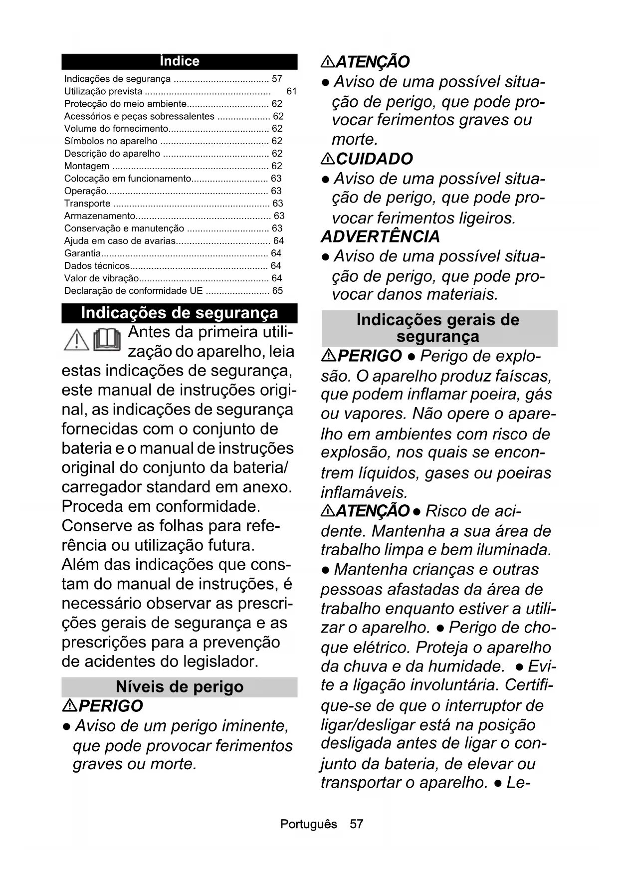 - 2,1 Inseguridad K dB(A) 1,5 Peso y dimensiones Longitud x anchura x altura mm 1773 x 366 x 277 Peso (sin batería) kg 4,0 Chairman of the Board of ManagementDirector Regulatory Affairs & Certification H. Jenner S. ReiserPortuguês 57 Índice Indicações de segurança Antes da primeira utili- zação do aparelho, leia estas indicações de segurança, este manual de instruções origi- nal, as indicações de segurança fornecidas com o conjunto de bateria e o manual de instruções original do conjunto da bateria/ carregador standard em anexo. Proceda em conformidade. Conserve as folhas para refe- rência ou utilização futura. Além das indicações que cons- tam do manual de instruções, é necessário observar as prescri- ções gerais de segurança e as prescrições para a prevenção de acidentes do legislador. Níveis de perigo PERIGO ● Aviso de um perigo iminente, que pode provocar ferimentos graves ou morte. 몇 ATENÇÃO ● Aviso de uma possível situa- ção de perigo, que pode pro- vocar ferimentos graves ou morte. 몇 CUIDADO ● Aviso de uma possível situa- ção de perigo, que pode pro- vocar ferimentos ligeiros. ADVERTÊNCIA ● Aviso de uma possível situa- ção de perigo, que pode pro- vocar danos materiais. Indicações gerais de segurança PERIGO ● Perigo de explo- são. O aparelho produz faíscas, que podem inflamar poeira, gás ou vapores. Não opere o apare- lho em ambientes com risco de explosão, nos quais se encon- trem líquidos, gases ou poeiras inflamáveis. 몇 ATENÇÃO ● Risco de aci- dente. Mantenha a sua área de trabalho limpa e bem iluminada. ● Mantenha crianças e outras pessoas afastadas da área de trabalho enquanto estiver a utili- zar o aparelho. ● Perigo de cho- que elétrico. Proteja o aparelho da chuva e da humidade. ● Evi- te a ligação involuntária. Certifi- que-se de que o interruptor de ligar/desligar está na posição desligada antes de ligar o con- junto da bateria, de elevar ou transportar o aparelho. ● Le- Indicações de segurança p. 57