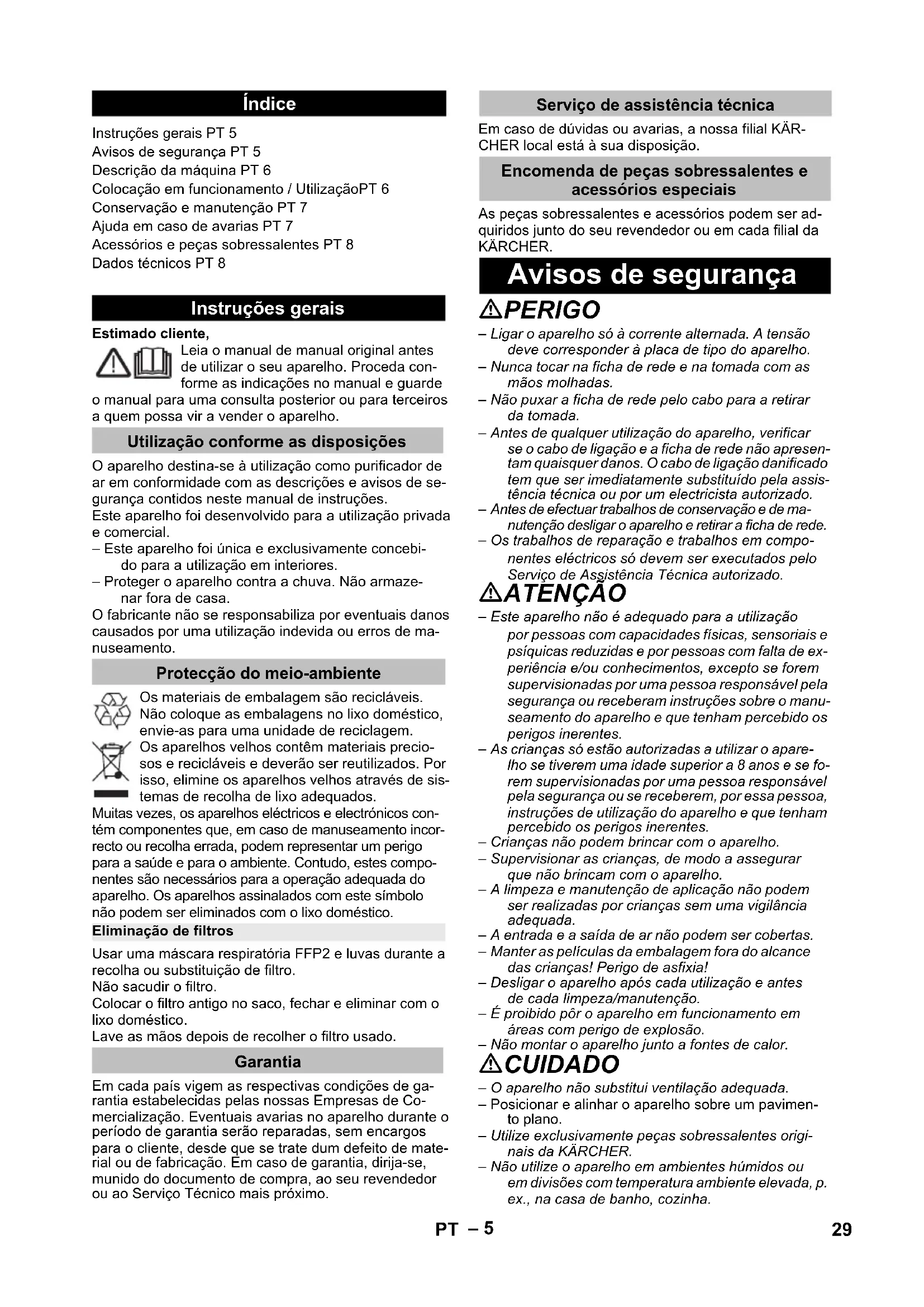 dB(A) dB(A) dB(A) 28 ES– 5 Estimado cliente, Leia o manual de manual original antes de utilizar o seu aparelho. Proceda con- forme as indicações no manual e guarde o manual para uma consulta posterior ou para terceiros a quem possa vir a vender o aparelho. O aparelho destina-se à utilização como purificador de ar em conformidade com as descrições e avisos de se- gurança contidos neste manual de instruções. Este aparelho foi desenvolvido para a utilização privada e comercial. – Este aparelho foi única e exclusivamente concebi- do para a utilização em interiores. – Proteger o aparelho contra a chuva. Não armaze- nar fora de casa. O fabricante não se responsabiliza por eventuais danos causados por uma utilização indevida ou erros de ma- nuseamento. Os materiais de embalagem são recicláveis. Não coloque as embalagens no lixo doméstico, envie-as para uma unidade de reciclagem. Os aparelhos velhos contêm materiais precio- sos e recicláveis e deverão ser reutilizados. Por isso, elimine os aparelhos velhos através de sis- temas de recolha de lixo adequados. Muitas vezes, os aparelhos eléctricos e electrónicos con- tém componentes que, em caso de manuseamento incor- recto ou recolha errada, podem representar um perigo para a saúde e para o ambiente. Contudo, estes compo- nentes são necessários para a operação adequada do aparelho. Os aparelhos assinalados com este símbolo não podem ser eliminados com o lixo doméstico. Usar uma máscara respiratória FFP2 e luvas durante a recolha ou substituição de filtro. Não sacudir o filtro. Colocar o filtro antigo no saco, fechar e eliminar com o lixo doméstico. Lave as mãos depois de recolher o filtro usado. Em cada país vigem as respectivas condições de ga- rantia estabelecidas pelas nossas Empresas de Co- mercialização. Eventuais avarias no aparelho durante o período de garantia serão reparadas, sem encargos para o cliente, desde que se trate dum defeito de mate- rial ou de fabricação. Em caso de garantia, dirija-se, munido do documento de compra, ao seu revendedor ou ao Serviço Técnico mais próximo. Em caso de dúvidas ou avarias, a nossa filial KÄR- CHER local está à sua disposição. As peças sobressalentes e acessórios podem ser ad- quiridos junto do seu revendedor ou em cada filial da KÄRCHER. PERIGO – Ligar o aparelho só à corrente alternada. A tensão deve corresponder à placa de tipo do aparelho. – Nunca tocar na ficha de rede e na tomada com as mãos molhadas. – Não puxar a ficha de rede pelo cabo para a retirar da tomada. – Antes de qualquer utilização do aparelho, verificar se o cabo de ligação e a ficha de rede não apresen- tam quaisquer danos. O cabo de ligação danificado tem que ser imediatamente substituído pela assis- tência técnica ou por um electricista autorizado. – Antes de efectuar trabalhos de conservação e de ma- nutenção desligar o aparelho e retirar a ficha de rede. – Os trabalhos de reparação e trabalhos em compo- nentes eléctricos só devem ser executados pelo Serviço de Assistência Técnica autorizado. ATENÇÃO – Este aparelho não é adequado para a utilização por pessoas com capacidades físicas, sensoriais e psíquicas reduzidas e por pessoas com falta de ex- periência e/ou conhecimentos, excepto se forem supervisionadas por uma pessoa responsável pela segurança ou receberam instruções sobre o manu- seamento do aparelho e que tenham percebido os perigos inerentes. – As crianças só estão autorizadas a utilizar o apare- lho se tiverem uma idade superior a 8 anos e se fo- rem supervisionadas por uma pessoa responsável pela segurança ou se receberem, por essa pessoa, instruções de utilização do aparelho e que tenham percebido os perigos inerentes. – Crianças não podem brincar com o aparelho. – Supervisionar as crianças, de modo a assegurar que não brincam com o aparelho. – A limpeza e manutenção de aplicação não podem ser realizadas por crianças sem uma vigilância adequada. – A entrada e a saída de ar não podem ser cobertas. – Manter as películas da embalagem fora do alcance das crianças! Perigo de asfixia! – Desligar o aparelho após cada utilização e antes de cada limpeza/manutenção. – É proibido pôr o aparelho em funcionamento em áreas com perigo de explosão. – Não montar o aparelho junto a fontes de calor. CUIDADO – O aparelho não substitui ventilação adequada. – Posicionar e alinhar o aparelho sobre um pavimen- to plano. – Utilize exclusivamente peças sobressalentes origi- nais da KÄRCHER. – Não utilize o aparelho em ambientes húmidos ou em divisões com temperatura ambiente elevada, p. ex., na casa de banho, cozinha. Índice Instruções gerais PT 5 Avisos de segurança PT 5 Descrição da máquina PT 6 Colocação em funcionamento / UtilizaçãoPT 6 Conservação e manutenção PT 7 Ajuda em caso de avarias PT 7 Acessórios e peças sobressalentes PT 8 Dados técnicos PT 8 Instruções gerais Utilização conforme as disposições Protecção do meio-ambiente Eliminação de filtros Garantia Serviço de assistência técnica Encomenda de peças sobressalentes e acessórios especiais Avisos de segurança 29PT– 6 PERIGO Aviso referente a um perigo eminente que pode condu- zir a graves ferimentos ou à morte. 몇 ATENÇÃO Aviso referente a uma possível situação perigosa que pode conduzir a graves ferimentos ou à morte. 몇 CUIDADO Aviso referente a uma situação potencialmente perigo- sa que pode causar ferimentos leves. ADVERTÊNCIA Aviso referente a uma situação potencialmente perigo- sa que pode causar danos materiais. Verifique o conteúdo da embalagem a respeito de acessó- rios não incluídos ou danos. No caso de danos provoca- dos durante o transporte, informe o seu revendedor. Ver figuras na página desdobrável! 1 Tampa do filtro à frente 2 Pré-filtro 3 Filtro principal 4 Tampa do filtro atrás 5 Saída de ar 6 Indicação digita