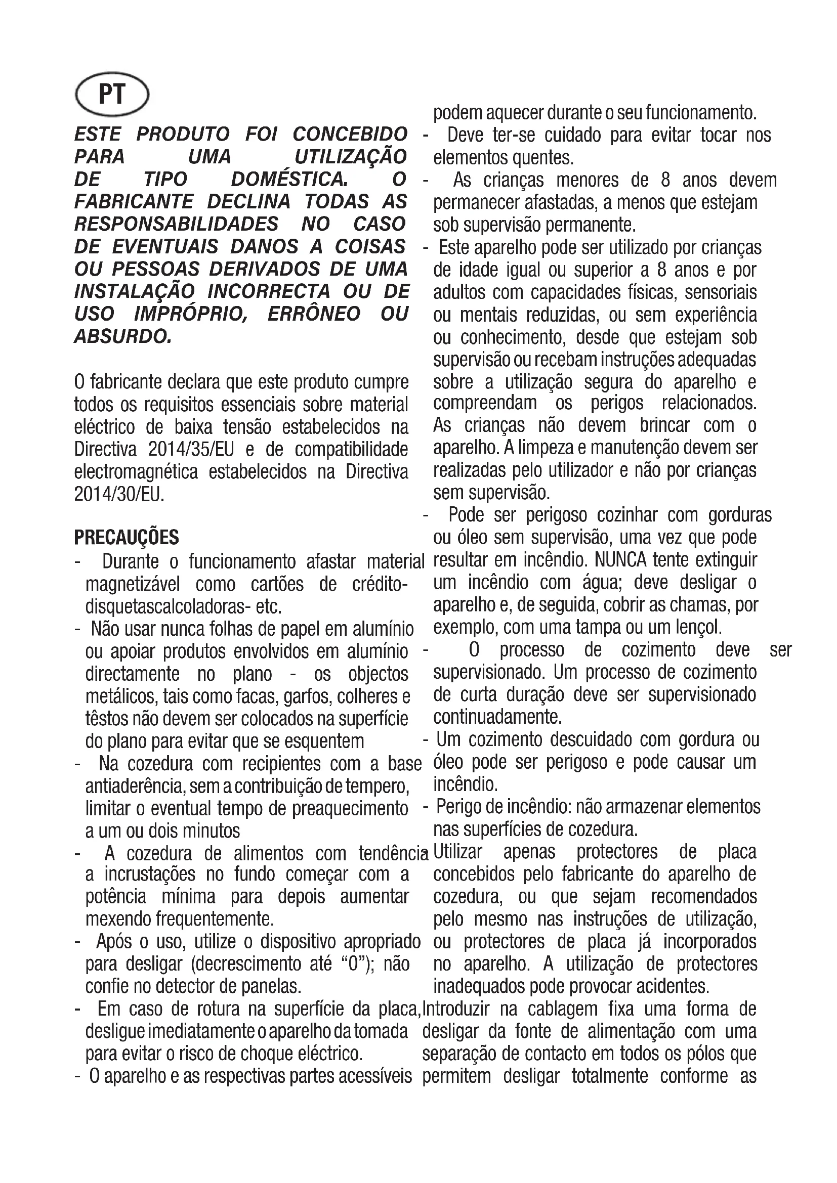 ABSURDO. O fabricante declara que este produto cumpre todos os requisitos essenciais sobre material eléctrico de baixa tensão estabelecidos na Directiva 2014/35/EU e de compatibilidade electromagnética estabelecidos na Directiva 2014/30/EU. PRECAUÇÕES - Durante o funcionamento afastar material magnetizável como cartões de crédito- disquetascalcoladoras- etc. - Não usar nunca folhas de papel em alumínio ou apoiar produtos envolvidos em alumínio directamente no plano - os objectos metálicos, tais como facas, garfos, colheres e têstos não devem ser colocados na superfície do plano para evitar que se esquentem - Na cozedura com recipientes com a base antiaderência, sem a contribuição de tempero, limitar o eventual tempo de preaquecimento a um ou dois minutos - A cozedura de alimentos com tendência a incrustações no fundo começar com a potência mínima para depois aumentar mexendo frequentemente. - Após o uso, utilize o dispositivo apropriado para desligar (decrescimento até “0”); não confie no detector de panelas. - Em caso de rotura na superfície da placa, desligue imediatamente o aparelho da tomada para evitar o risco de choque eléctrico. - O aparelho e as respectivas partes acessíveis podem aquecer durante o seu funcionamento. - Deve ter-se cuidado para evitar tocar nos elementos quentes. - As crianças menores de 8 anos devem permanecer afastadas, a menos que estejam sob supervisão permanente. - Este aparelho pode ser utilizado por crianças de idade igual ou superior a 8 anos e por adultos com capacidades físicas, sensoriais ou mentais reduzidas, ou sem experiência ou conhecimento, desde que estejam sob supervisão ou recebam instruções adequadas sobre a utilização segura do aparelho e compreendam os perigos relacionados. As crianças não devem brincar com o aparelho. A limpeza e manutenção devem ser realizadas pelo utilizador e não por crianças sem supervisão. - Pode ser perigoso cozinhar com gorduras ou óleo sem supervisão, uma vez que pode resultar em incêndio. NUNCA tente extinguir um incêndio com água; deve desligar o aparelho e, de seguida, cobrir as chamas, por exemplo, com uma tampa ou um lençol. - O processo de cozimento deve ser supervisionado. Um processo de cozimento de curta duração deve ser supervisionado continuadamente. - Um cozimento descuidado com gordura ou óleo pode ser perigoso e pode causar um incêndio. - Perigo de incêndio: não armazenar elementos nas superfícies de cozedura. - Utilizar apenas protectores de placa concebidos pelo fabricante do aparelho de cozedura, ou que sejam recomendados pelo mesmo nas instruções de utilização, ou protectores de placa já incorporados no aparelho. A utilização de protectores inadequados pode provocar acidentes. Introduzir na cablagem fixa uma forma de desligar da fonte de alimentação com uma separação de contacto em todos os pólos que permitem desligar totalmente conforme as PTcondições de categoria III de sobretensão, de acordo com as regras de ligação. A tomada ou o interruptor onipolar deverão ser posicionados para uma fácil manipulação do aparelho instalado. Este aparelho não está preparado para poder funcionar por meio de um temporizador externo ou sistema de controlo remoto separado. O construtor declina qualquer responsabilidade no caso que não tenham sido respeitadas to