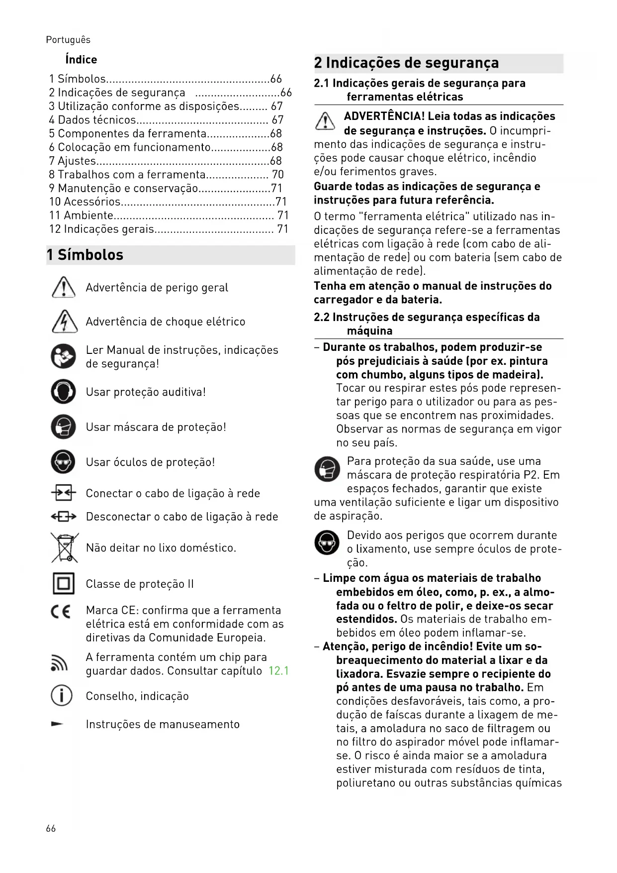 - 12 Indicações gerais 1 Símbolos Advertência de perigo geral Advertência de choque elétrico Ler Manual de instruções, indicações de segurança! Usar proteção auditiva! Usar máscara de proteção! Usar óculos de proteção! Conectar o cabo de ligação à rede Desconectar o cabo de ligação à rede Não deitar no lixo doméstico. Classe de proteção II Marca CE: confirma que a ferramenta elétrica está em conformidade com as diretivas da Comunidade Europeia. A ferramenta contém um chip para guardar dados. Consultar capítulo 12.1 Conselho, indicação Instruções de manuseamento 2 Indicações de segurança p. 71