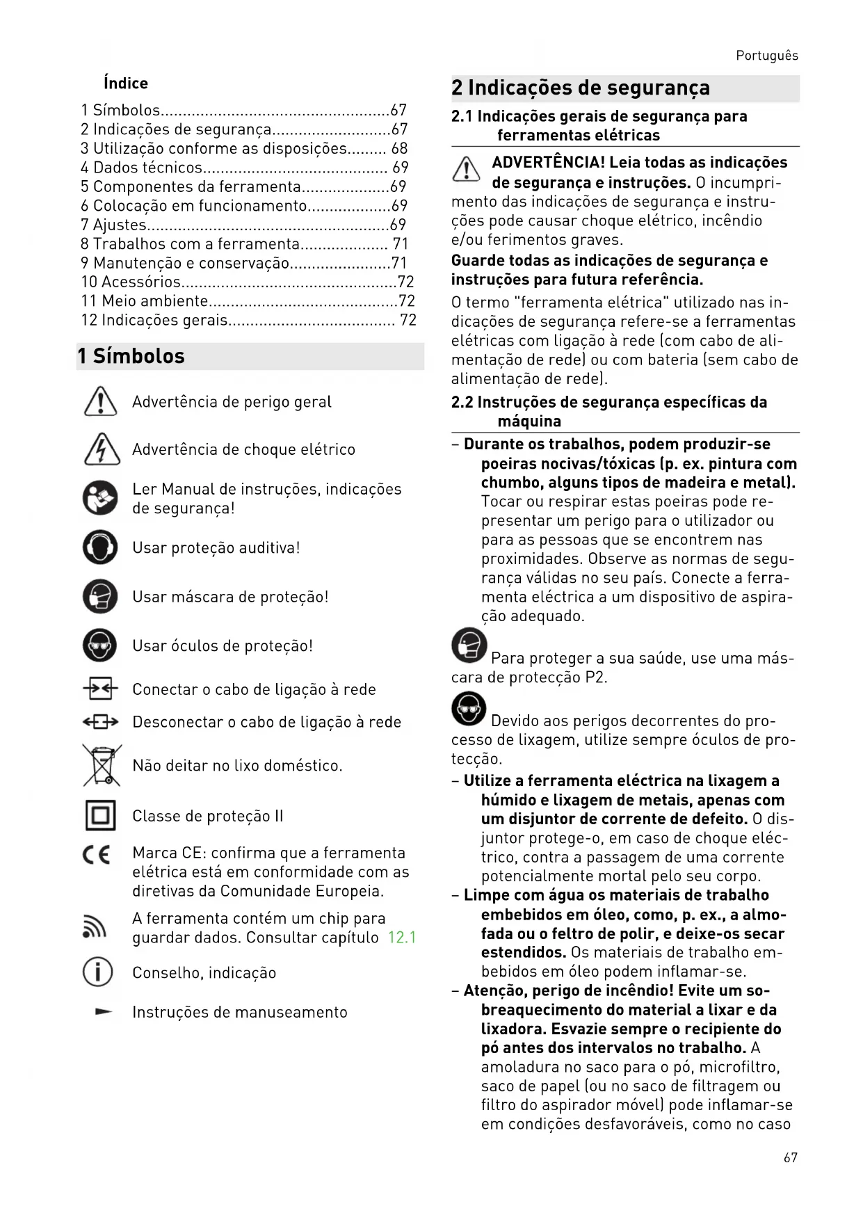 - 12 Indicações gerais 1 Símbolos Advertência de perigo geral Advertência de choque elétrico Ler Manual de instruções, indicações de segurança! Usar proteção auditiva! Usar máscara de proteção! Usar óculos de proteção! Conectar o cabo de ligação à rede Desconectar o cabo de ligação à rede Não deitar no lixo doméstico. Classe de proteção II Marca CE: confirma que a ferramenta elétrica está em conformidade com as diretivas da Comunidade Europeia. A ferramenta contém um chip para guardar dados. Consultar capítulo 12.1 Conselho, indicação Instruções de manuseamento 2 Indicações de segurança p. 72